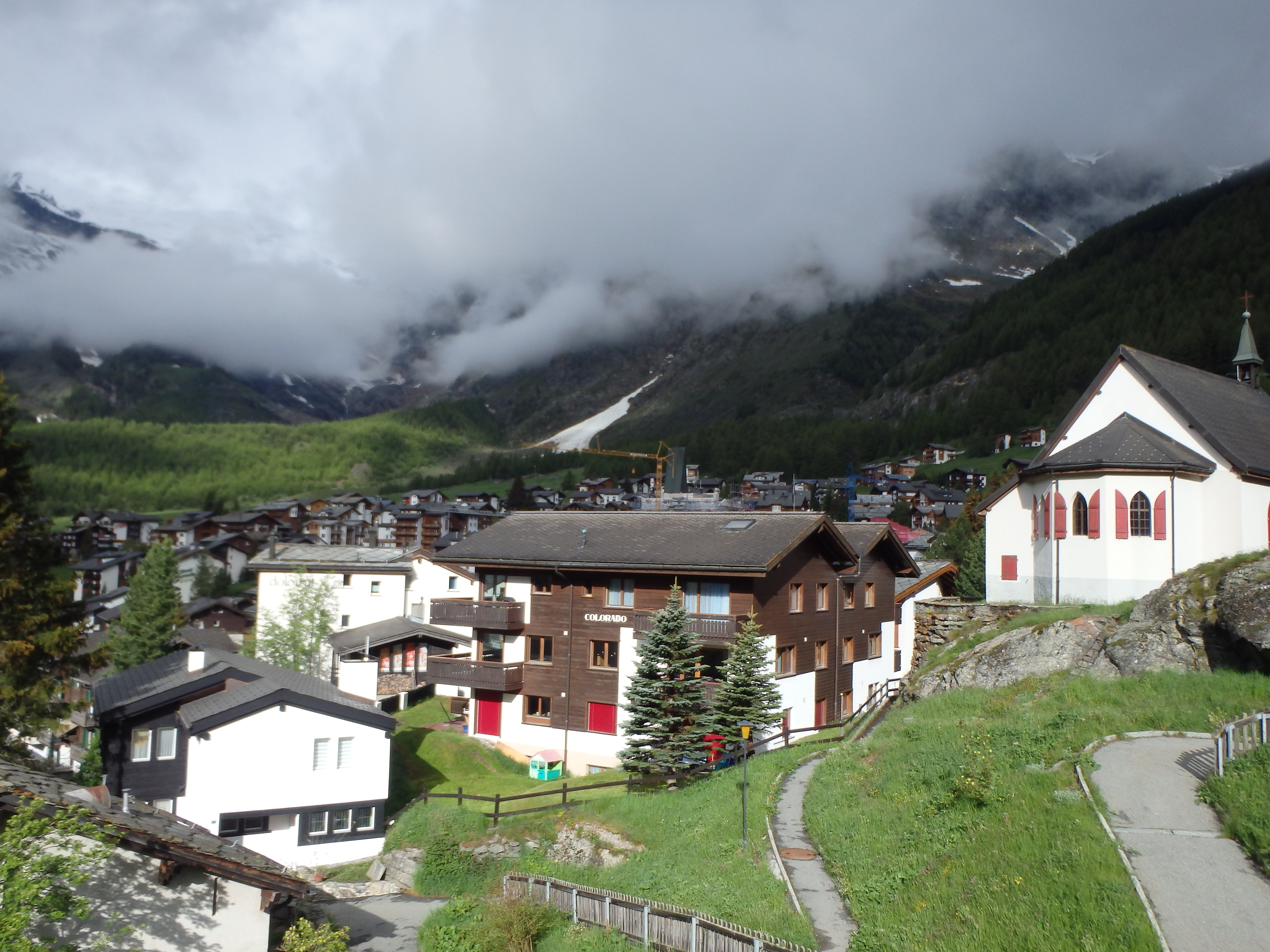 After my failed attempt on Vorder-Grauspitz, I was turning my attention to 4000 meter summits the rest of the trip, culminating in a summit attempt of Mont Blanc, the highest summit in the Alps and all of Western Europe. The first 4000 meter summit I had planned was Allalinhorn, which thanks to the Metro Alpin, is one of the “easiest” 4000 meter peaks in the Alps. As I would find throughout the trip, easy is relative, and depends significantly on conditions. I drove to Saas Fee on Saturday evening under cloudy skies and a light rain, and went into a local gear shop to ask about conditions. The shopowner’s answer was not promising- “Wet. It’s been raining all week.” In fact it had been one of the wettest springs for the Alps in recent memory, and aside from my first day in the mountains, it rained every single day I was there.