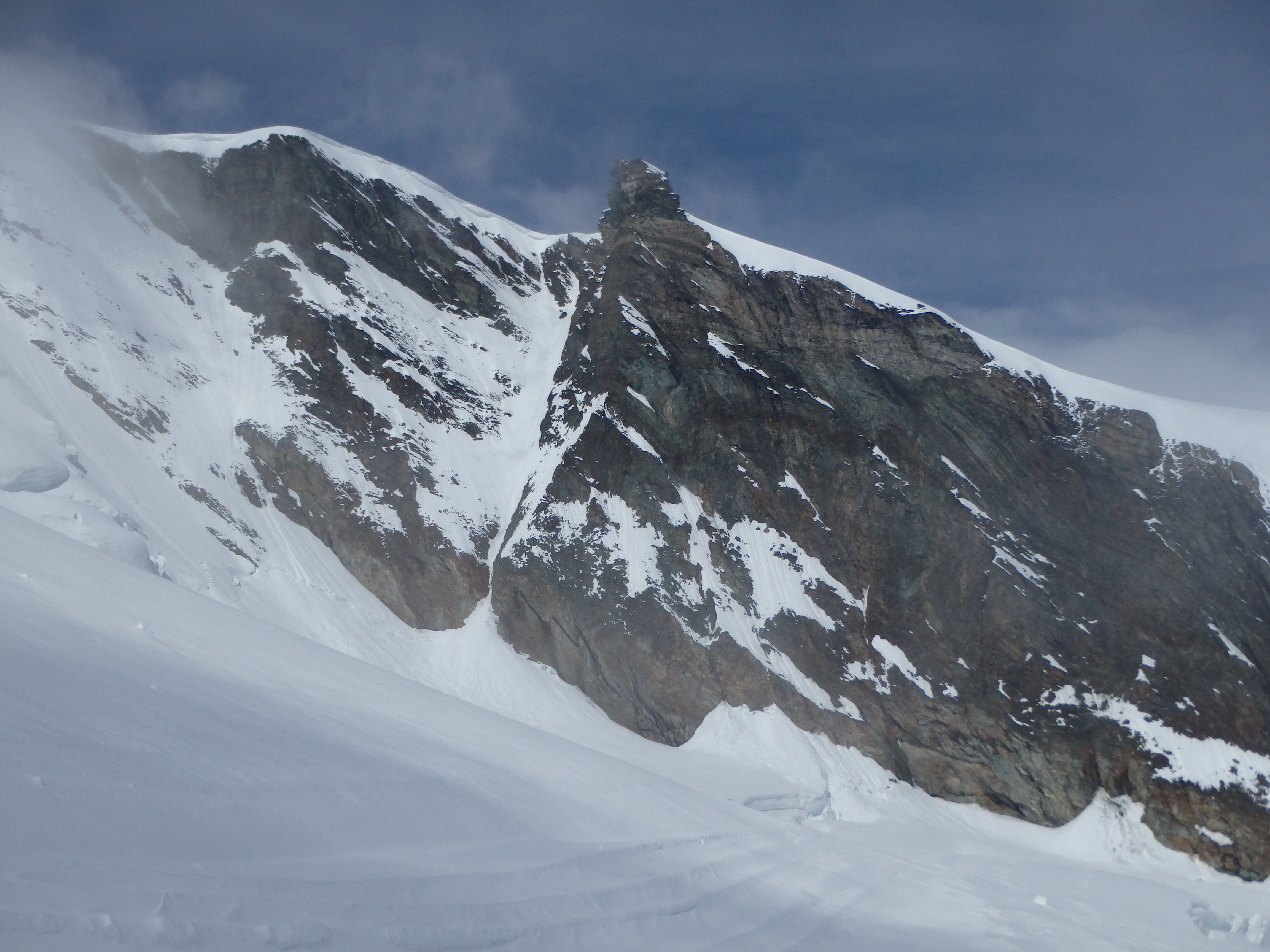 Alps- 2, Chris- 0. I turned around and slowly made my way back towards Metro Alpin. I briefly considered the Northeast ridgeline, and I could see the summit cross high above. But this route, although looking clear, was rated AD with a serious bergshrund to cross half way up, and most parties bringing ice screws for the ascent.