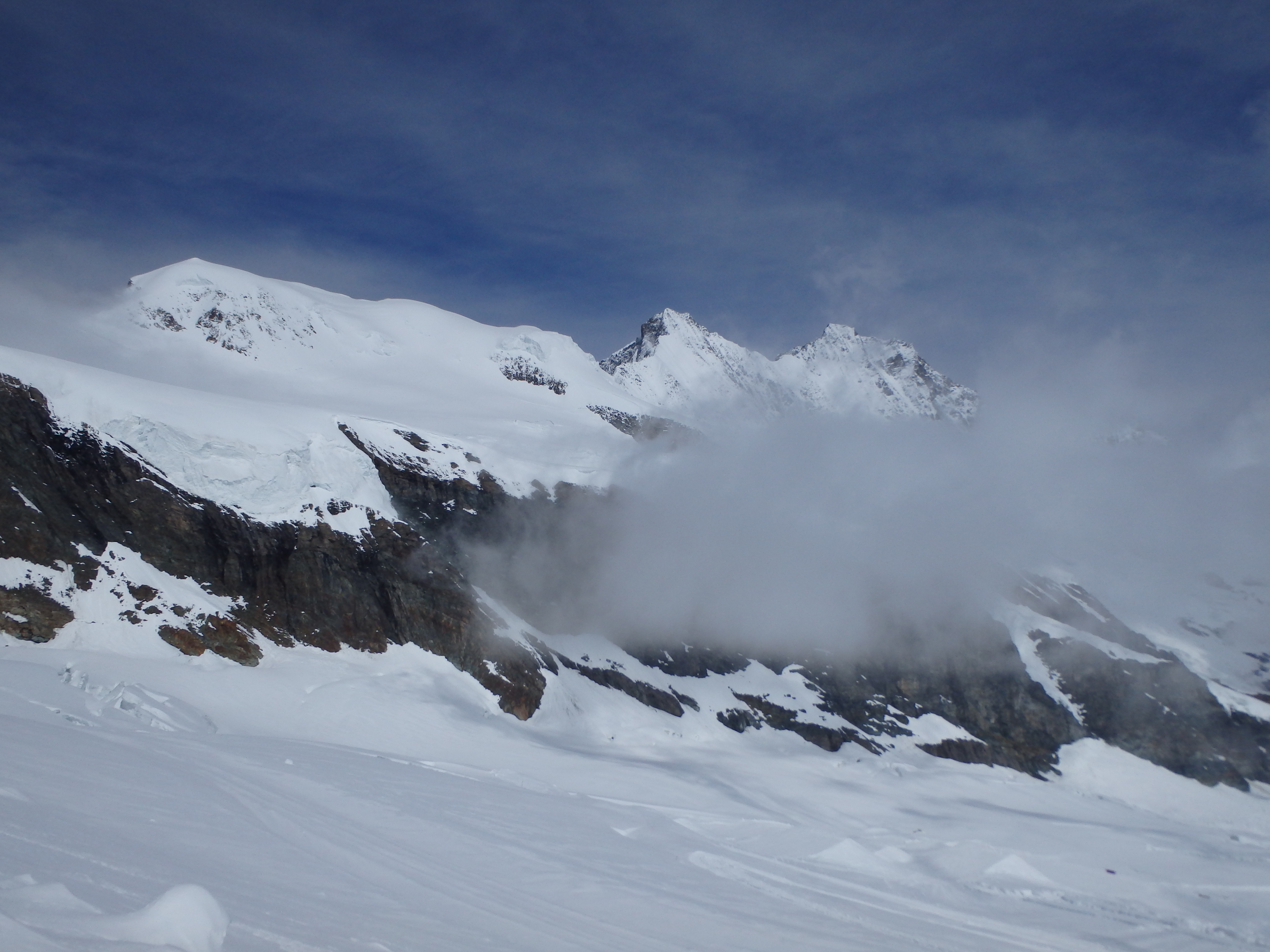 The lower slopes did not look promising. I could see huge crevasses cutting across the slope below the saddle, half covered by fresh snow. My only hope would be to find a track at the top of the ski runs. I continued onward, the clouds continuing to clear, offering incredible views of the entire valley including Alphubel, Dom, Lagginhorn and Weissmeis across the valley.