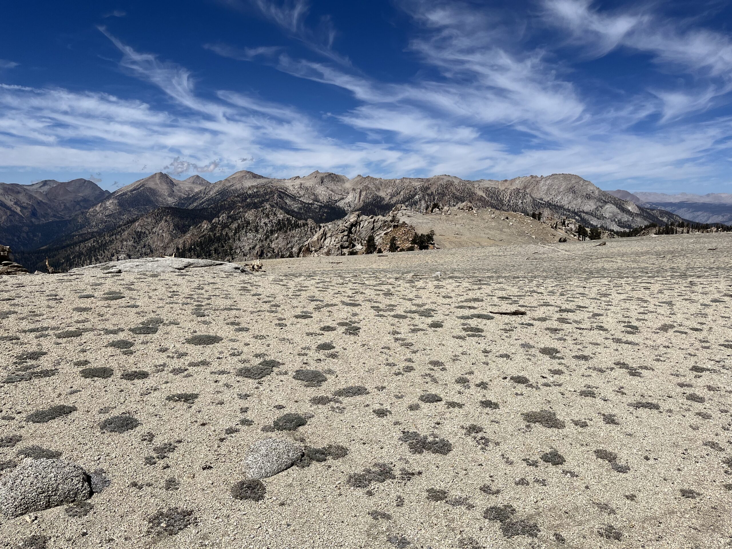 After a short snack I dropped to the north, going up and over Peak 10,064′ before finding the trail at the saddle above Grasshopper Creek. I had been seriously debating whether it was worth continuing to Coyote Peaks or to call the sufferfest a day and head back after Angora. But the thought of ever having to return to bushwack through those thorns was enough for me to press on, continuing across the trail cross country along the ridgeline. It was brushy but straightforward travel for about a mile until I reintersected the trail, the landscape transforming dramatically from thinned partially burned pine forest and manzanita to open sandy ridgeline dotted with foxtail pines and large granite outcroppings.