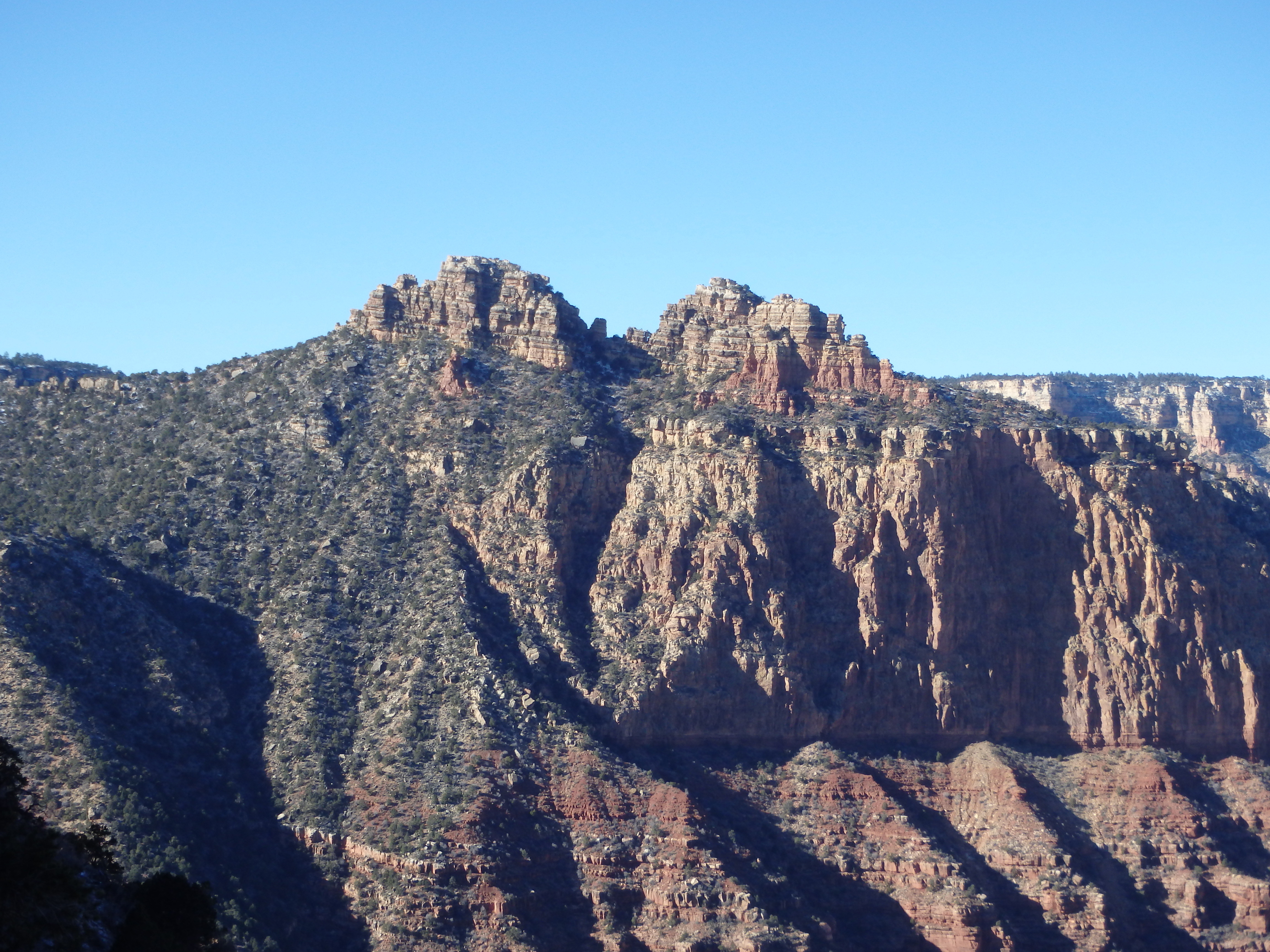 After Cedar Mountain in October, I assumed I wouldn’t make it up again to the Grand Canyon until the new year. But an unexpected trip north for the holidays to show the Canyon to family bought me some time to sneak away for a quick summit. Knowing I would have to move quickly, I wanted something that didn’t involve a huge descent. A mild winter storm had moved through the week before, so I also wanted to avoid any class IV that might have some lingering ice. After scouring the maps, I decided on Coronado Butte, a striking summit that is unfortunately hidden from many of the viewpoints along the south rim. I had my wife drop me off at the New Hance Trailhead, completely hidden and unsigned. Being the least maintained trail on the south rim, it seems the park service wanted to discourage exploration in this section as much as possible. I told Holly to come back in 4 hours, and they headed back west towards the village. The trail was briefly in pinyon pine and juniper, but I quickly reached the rim and had my first view of Coronado Butte.