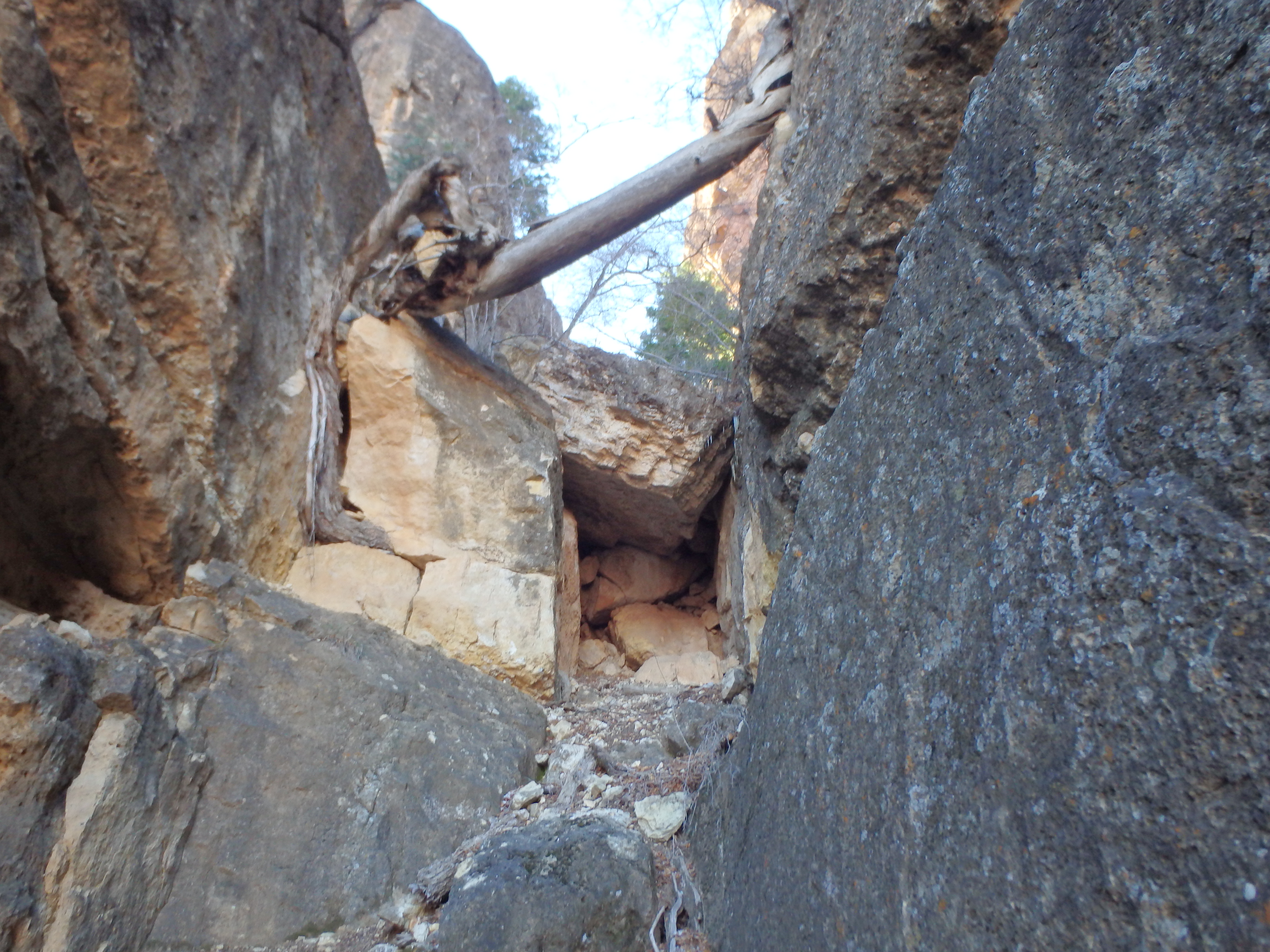 The easiest route, class III, follows chutes 1, 2 and 3 in succession, climbing about 1/3 of each before traversing out to the next chute. The less complicated but more difficult class IV route climbs the third chute directly, but some obvious ice clinging in the chutes made the decision to keep things class III easy. I started up the first chute, littered with fallen branches from a number of large pines guarding passage. The ground was frozen solid and many key hold had a thin sheen of icy, making me pause at at least two spots. After about 80′ of climbing I reached a large chokestone blocking further passage, and traversed out of the first chute across a narrow sandstone catwalk around and in to the second chute.