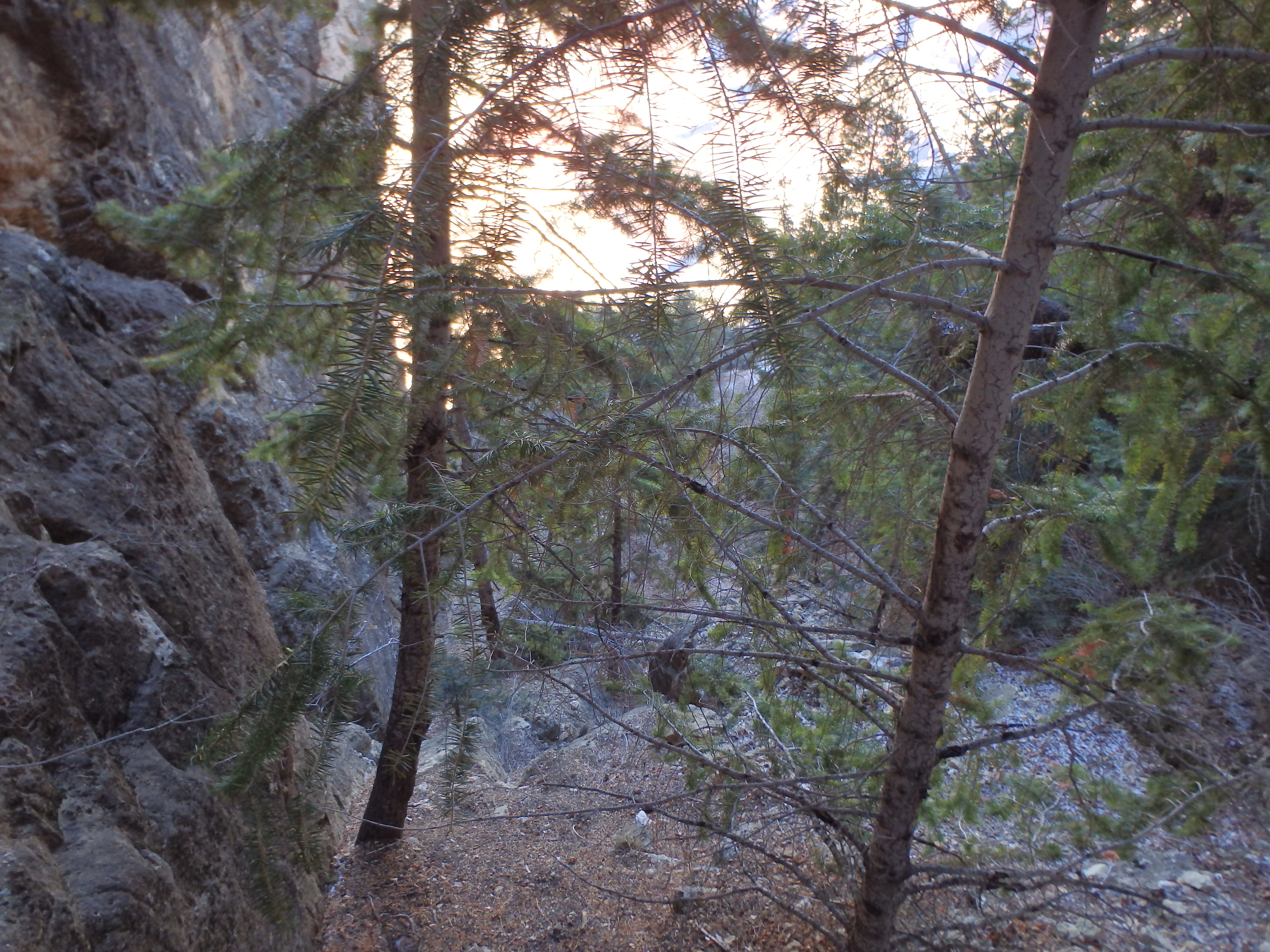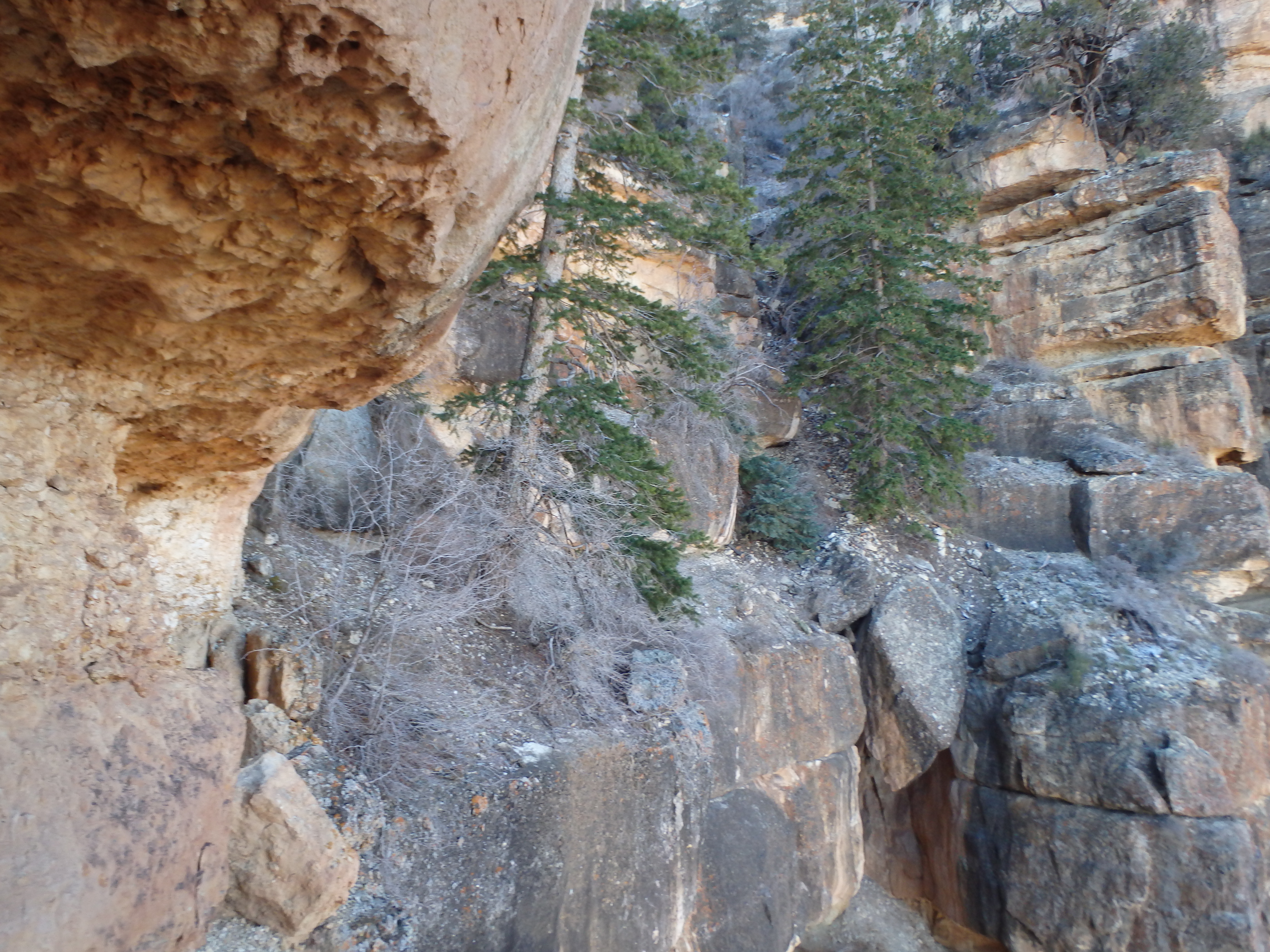 Although the icy spots were again a bit sketchy, there were a number of trees and branches I could use to slowly lower myself and I descended without incident. Hiking out to the tip of the plateau on a decent use trail, I had 1:40 to descend back to the saddle and climb over 1000′ to the rim to make my four hour mark. Dropping down the short gully through the upper cliff band, I half jogged down the class II slabs, finding the rock to be fairly solid and perfect for a rapid descent.