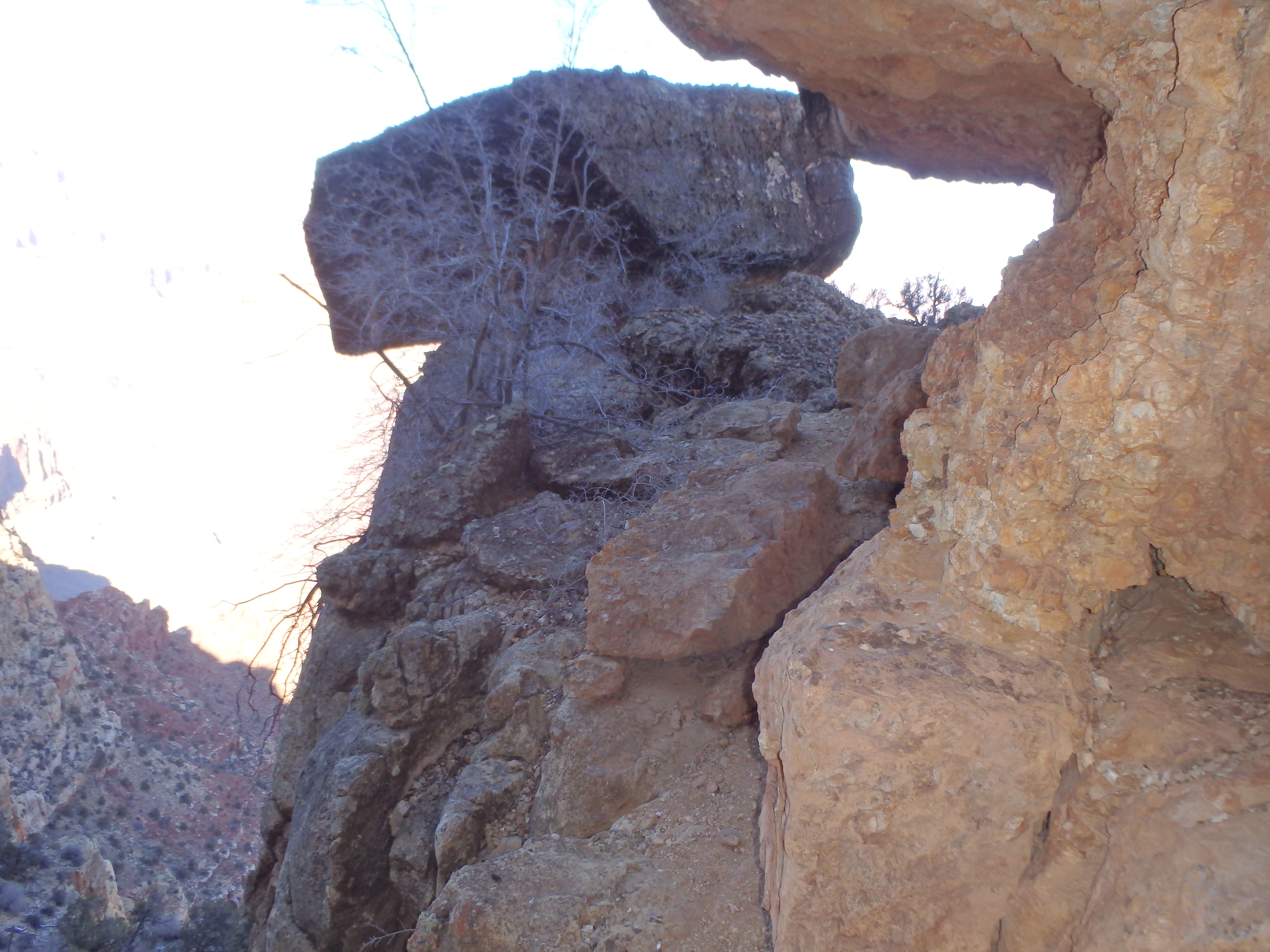 I was surprised by just how much descent was required, with over 1000′ to the connecting saddle. The upper reaches of the trail had a significant amount of ice, more than I expected given the warm temperatures we had the week before. It wasn’t the first time I had to contend with ice on the South Rim (Cheops Pyramid the February prior), but I did not have microspikes with me, and the New Hance Trail is considerably steeper than the South Kaibab. Because of this, I had to move cautiously and slowly over steep, icy sections. As I descended, the ice thinned and eventually disappeared about 1/2 way to the saddle. The trail switched aggressively down and slowly traversed below the saddle I was aiming for. I picked a spot to leave the trail, and with a bit of easy cross country I hit the saddle about 35 minutes from the start. Above was a nice look at Sinking Ship, another climb for another day. Finally in the sun, I shed some layers and eyed the route ahead- a narrow ridge of sandstone slabs with the occasional cliff band to work through.