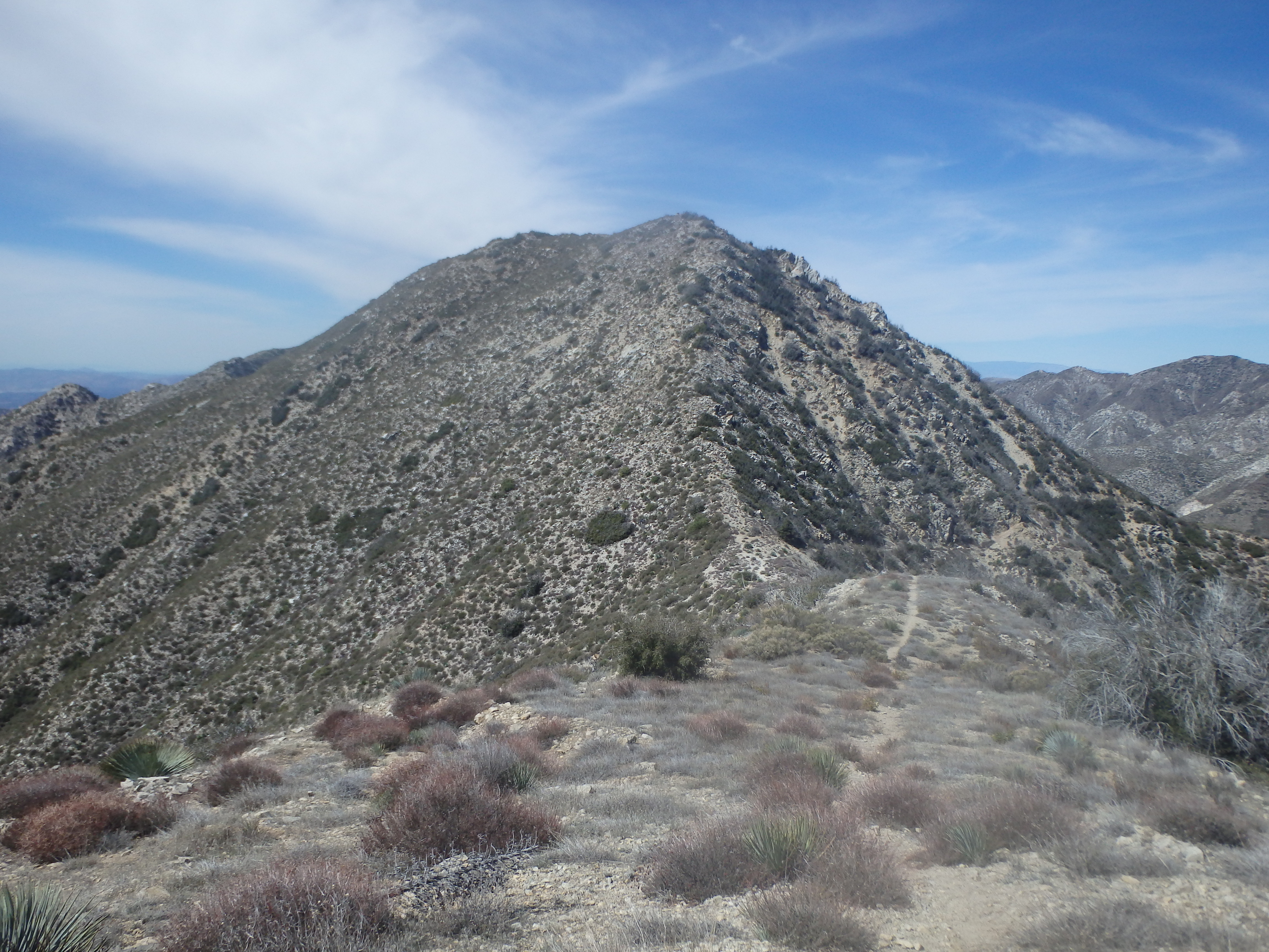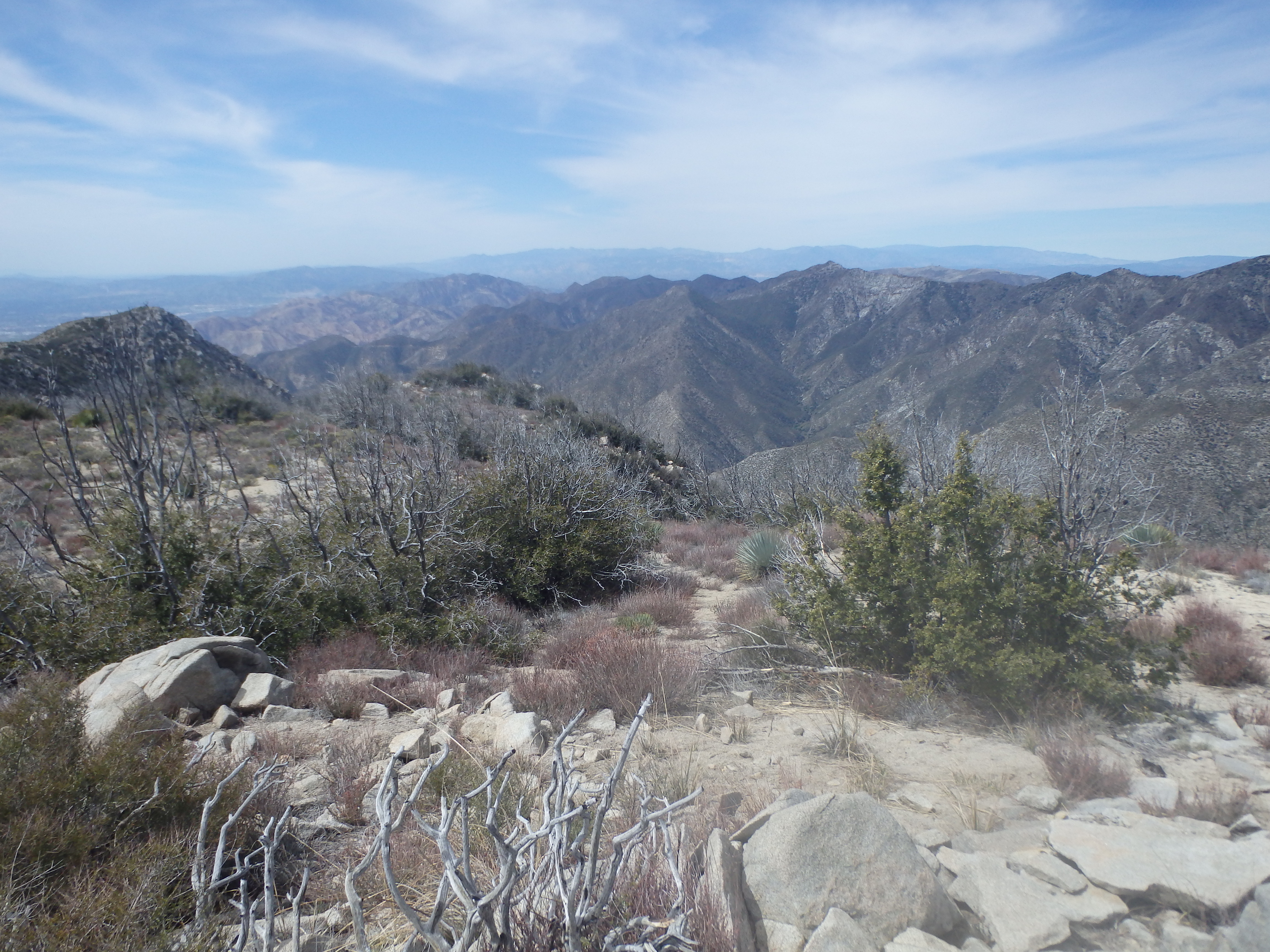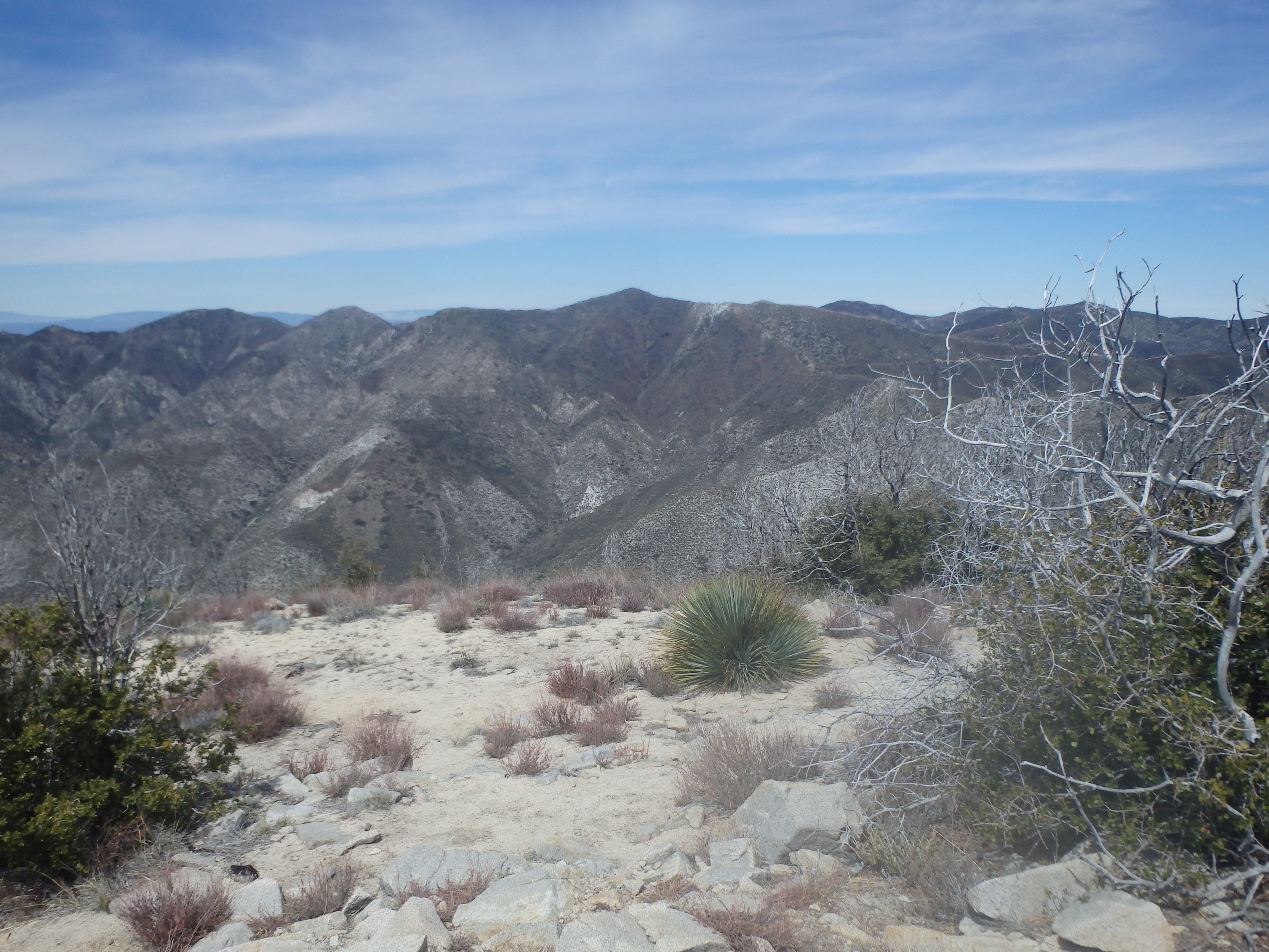 The road cut east at a gentle grade to reach the main east-west ridgeline of Iron, but a cairned use trail left the road near the clearing and headed directly upslope. The slope was a bit loose and charred, having more of a scorched earth feel after the fire than others areas I had visited that day. The soil seemed a bit more red (presumably iron), and the use trail reached the ridgeline just east of a series of prominent silver cliffs along the ridge. The grade eased considerably here, and in a few minutes I hit my third summit of the day. I thought Gleason would be blocking any real views to the north, but with the recent rains I could see clear to the Tehachapis and possibly even the Southern Sierras far in the distance. Condor was directly to the south, and I couldn’t help but hope that the HPS didn’t add the unofficially named Condor Point to the list sitting just east of Condor Peak, which would necessitate another climb up this way.