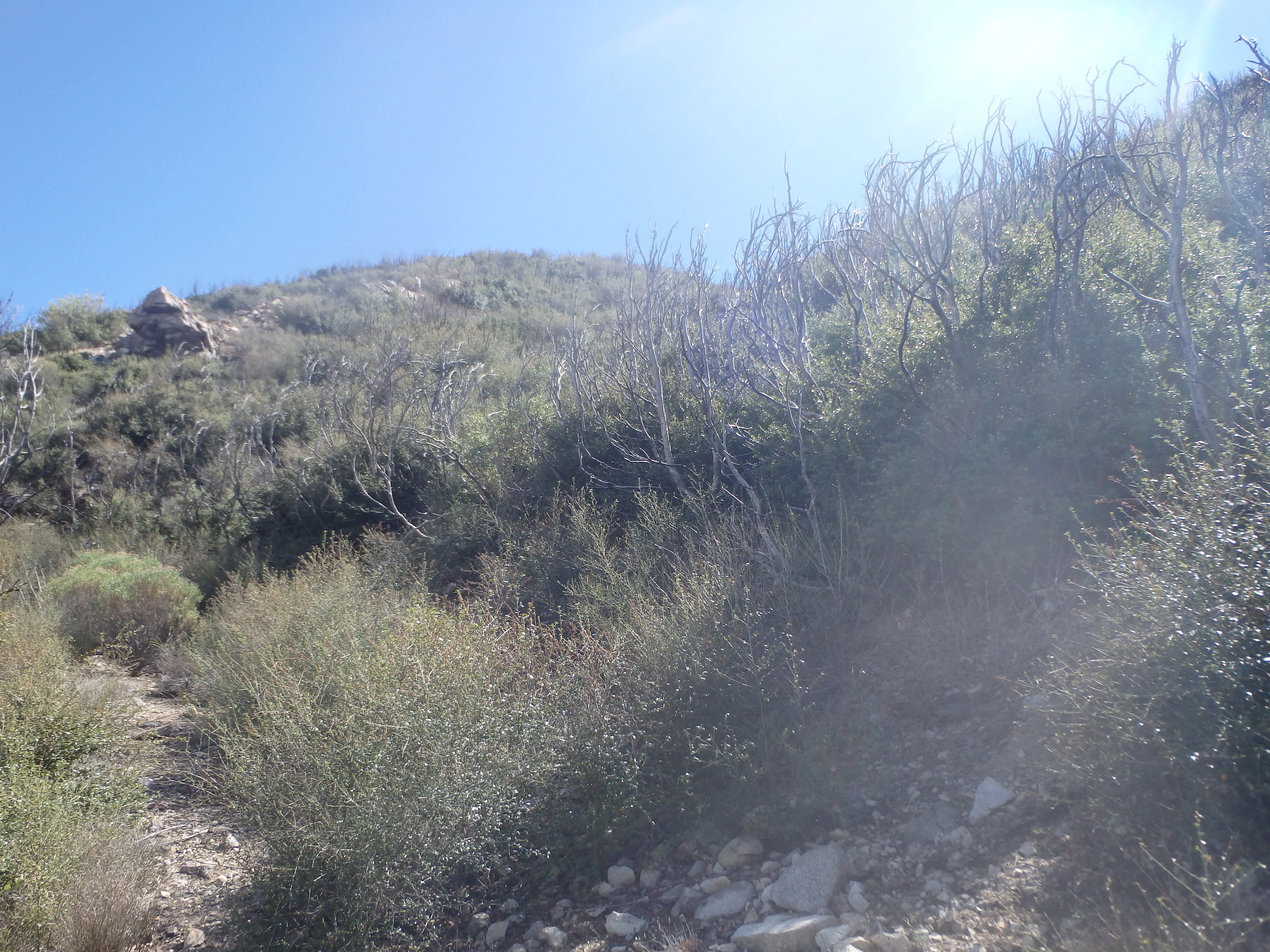 I had hoped McKinley would be a bit closer but it still looked pretty far from Iron, and my GPS confirmed about 3 miles of hiking between. It was about 2:45 PM with sunset at 7. If I looped through Trail Canyon, I had about 8 miles of trail and three-ish miles of road to get back to my car. If I returned the way I came I also had about 11 miles, but far more elevation gain along the ridgeline. McKinley seemed too far to tack on with at least 9 miles of trail with alot of up and down, followed by a lot of ridge hiking. So I decided to follow my original plan and descend via the Trail Canyon Trail with some road hiking to finish the day. I found the burnt sign post indicating the turn off and initially found the trail to be in reasonable shape. As I descended towards the first switchback, the trail became more and more overgrown with buckthorn, and soon I was thrashing through the brush on a nonexistent trail.