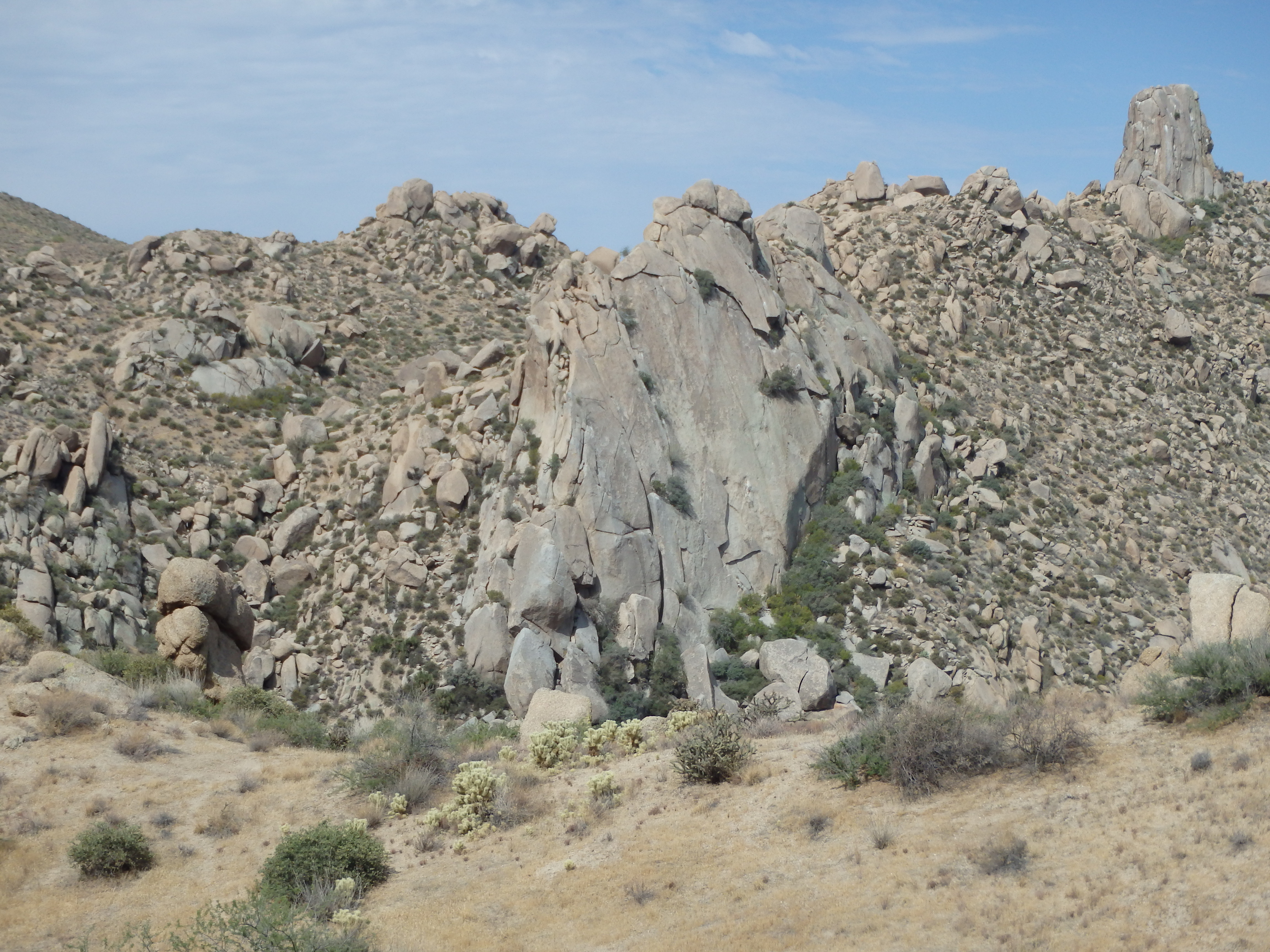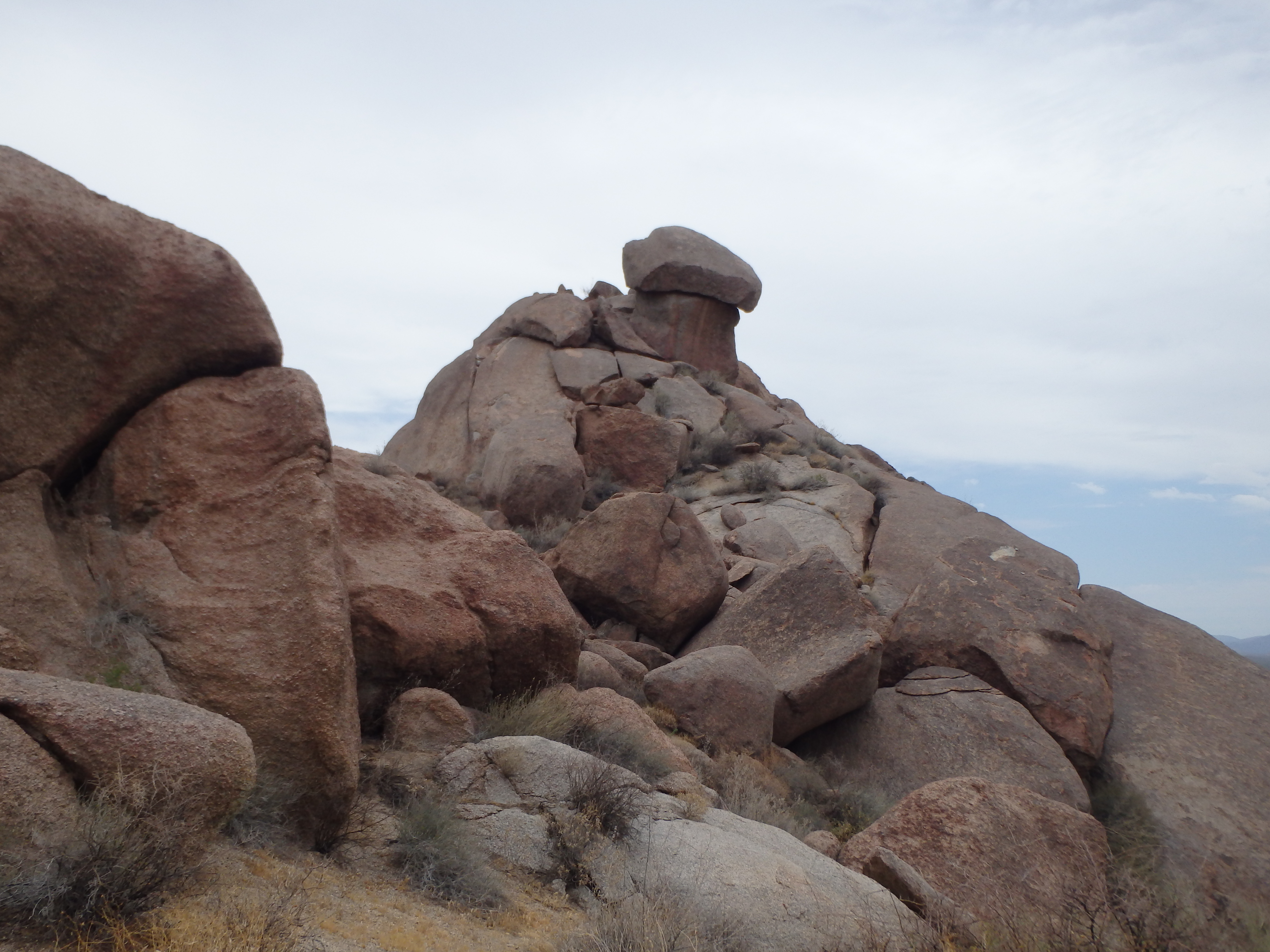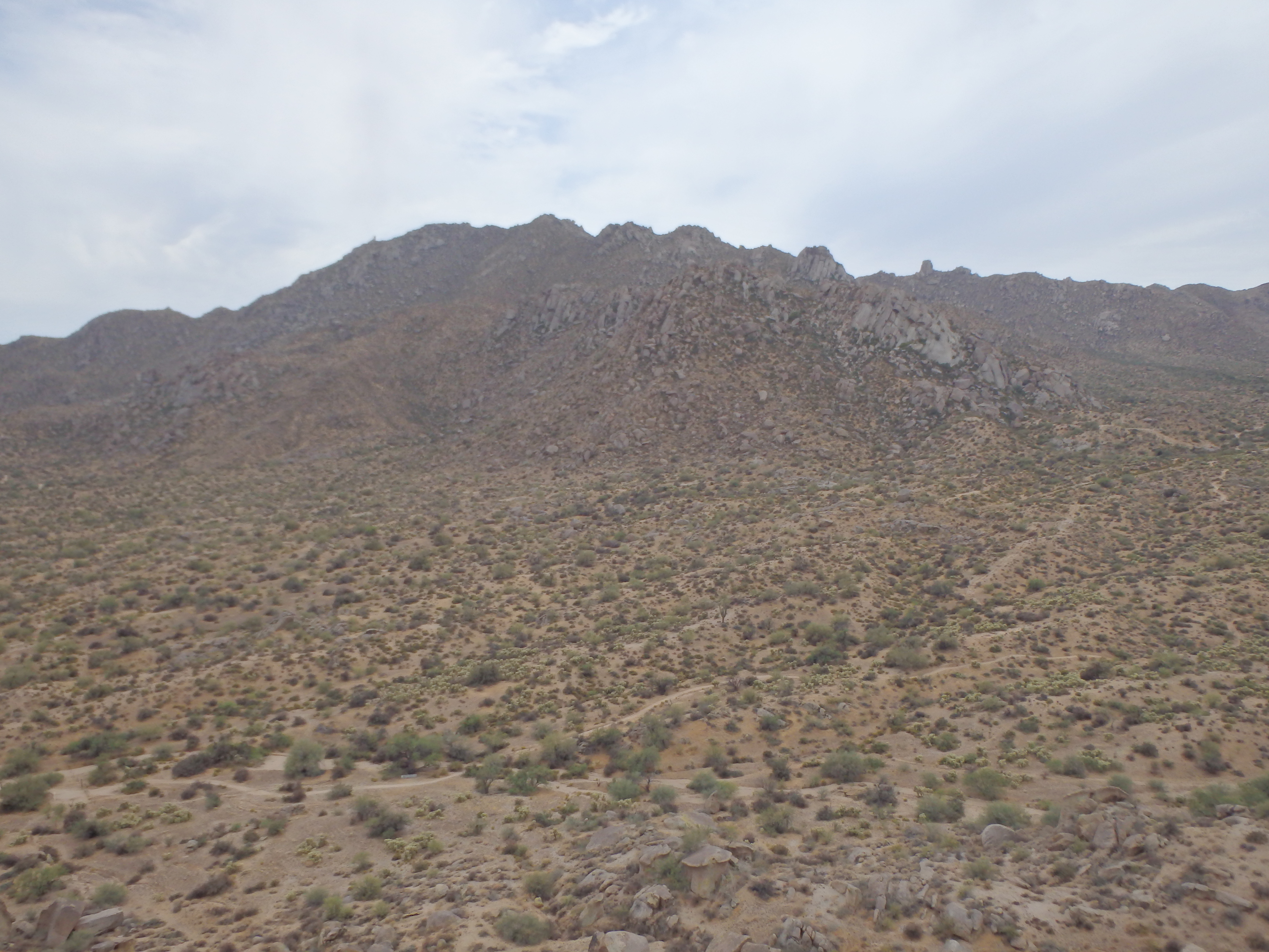 I thought once I hit the drainage bottom, I could hike out through the wash, but I found it incredibly brushy, and decided to continue along the use trail up the other side of the wash and back to the main trail. At this point it was about noon, and the cloud cover had been holding. I still had about 2 liters of water left, and I thought I might check out Rock Knob, a small summit east of the main bulk of the McDowells. Instead of continuing along the Tom’s Thumb trail to the trailhead, I hiked east along the Feldspar Trail, skirting the base of the Sven formations, with Rock Knob finally coming into view as I cleared Sven Slab.