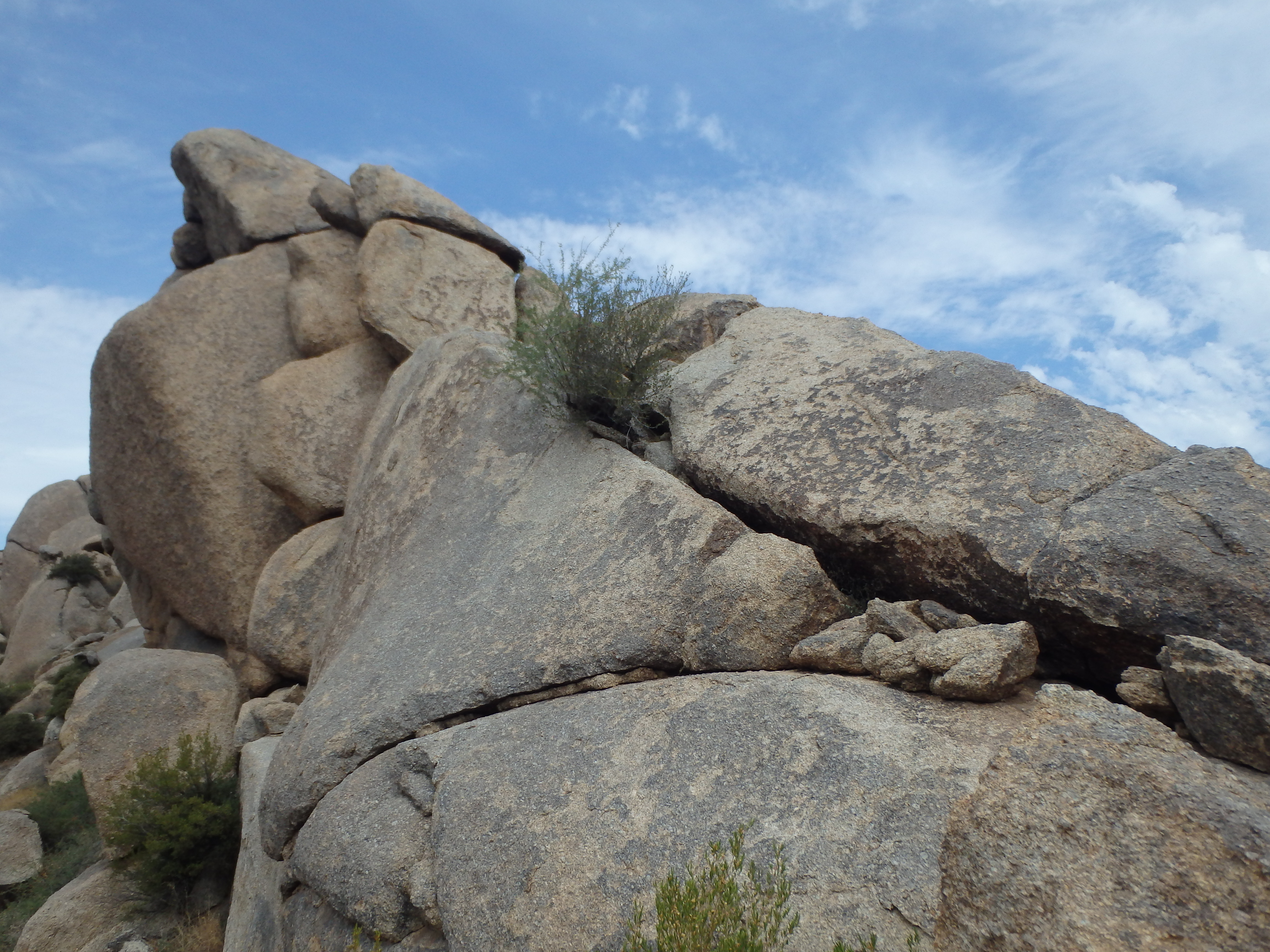 Up until this point, it had been mostly class III with one or two short spots of class IV. But looking up at the cleaved summit boulders, it seemed that the class IV rating was seriously sandbagged. The space between the summit rocks, about 20′ to the very top, was too narrow to wedge myself in. There were a few decent holds lower down including a good sized chicken head, but there was also a bit of an overhang. I tried twice and backed off each time, convinced this was more in the 5.5-5.6 arena and not something I wanted to climb free without a spotter. Later at home, I found that most routes end at or before the notch I was on, and I don’t think the final summit boulders are included in the class IV descent route, which made me feel better about not continuing. I dropped off Glass Dome and started looking for alternatives for the day. Not far away, I started eyeing Gardeners Wall, a huge granite feature that has the best and most challenging multi-pitch climbing in the range. Most prominent when viewed from the east, it looks more like a granite ridgeline from the south and west, but might make for a nice alternative. I had no information about the highpoint of Gardeners Wall, but it look like it would probably be class III, so I continued along the Tom’s Thumb trail to the signed climber’s turn off for Gardner’s Wall. The first bump along the ridgeline, technically the highest, isn’t part of the wall itself but a separate boulder pile. With bees swarming near the base, I hiked past and traversed brushy slopes west of the summit blocks to the saddle between the north and south summits. The map I had showed poor detail on which was the highest, and it was difficult to tell from the saddle. But the north summit looked easier, so I would start with that. It was fairly easy class III summit slabs to the northern summit, and on top it was clear that the southern summit was higher. I took a short break and dropped back to the saddle. Climbing the higher southern summit from the saddle looked possible, although would require a short 10′ face climb in the lower reaches by widely stepping off a nearby boulder with a gap beneath. Doable, but I figured I could probably find an easier route. I continued traversing along the west side, the summit rocks seeming higher above my head, until I found a narrow ramp that would get me up.