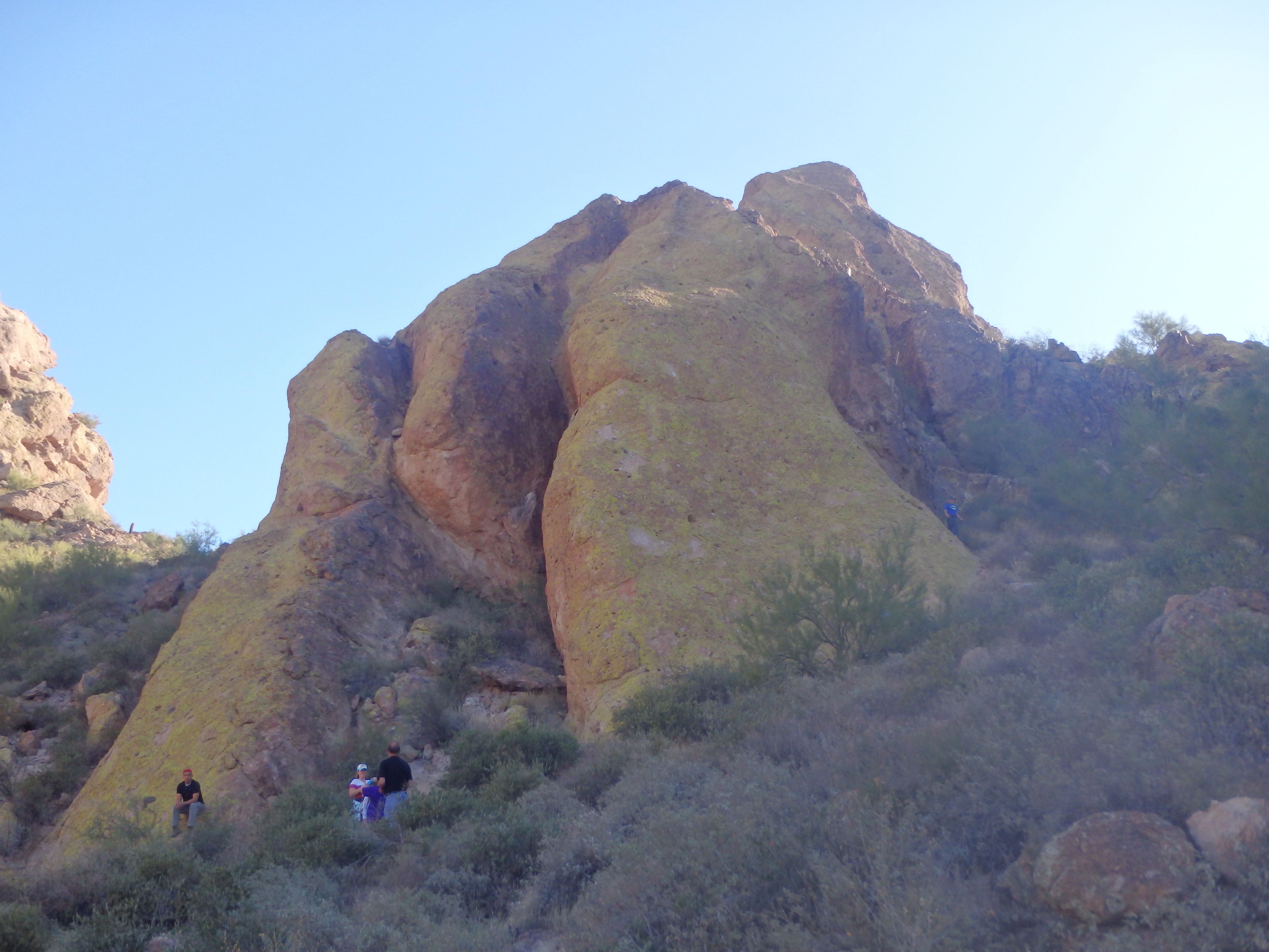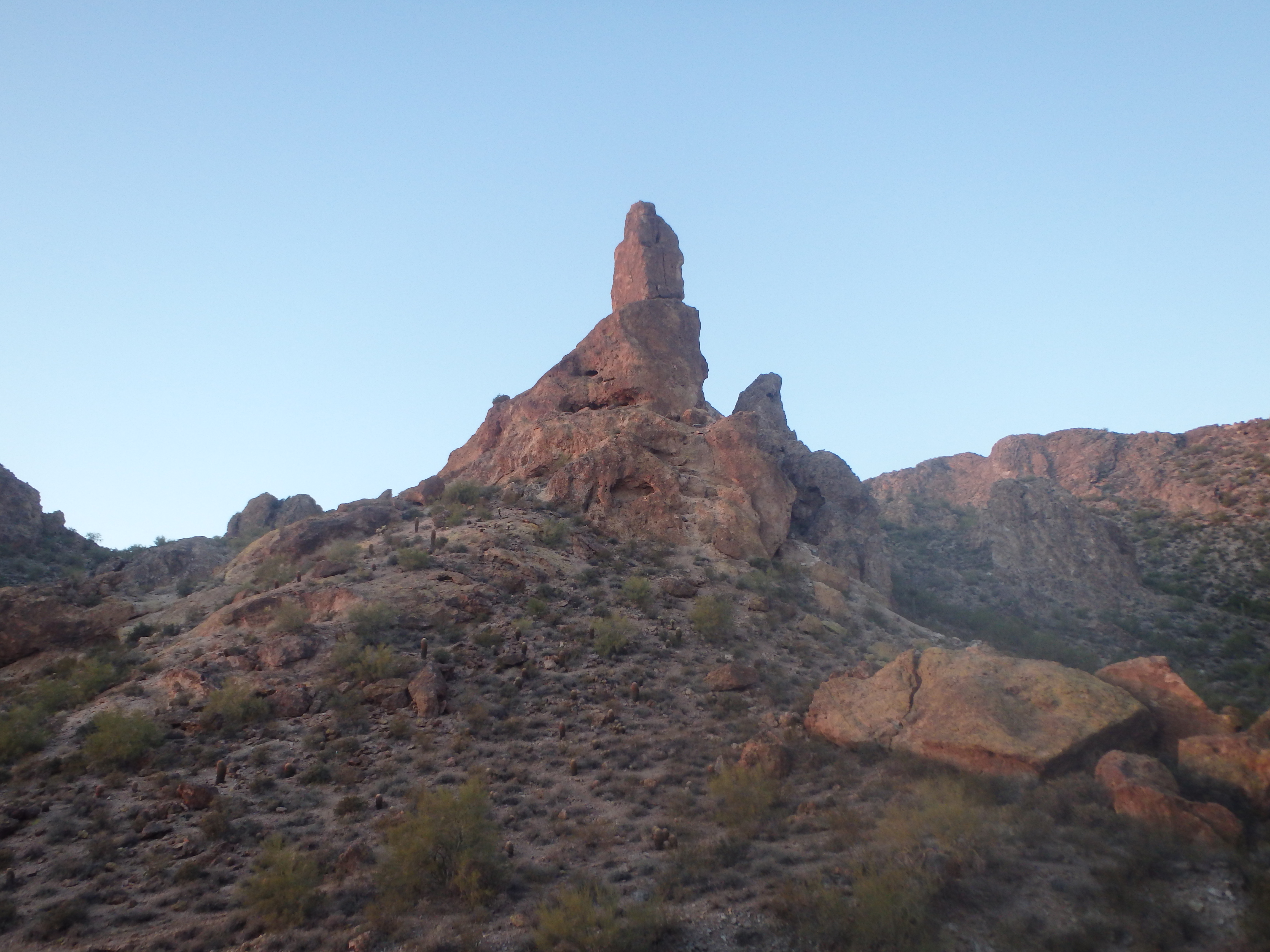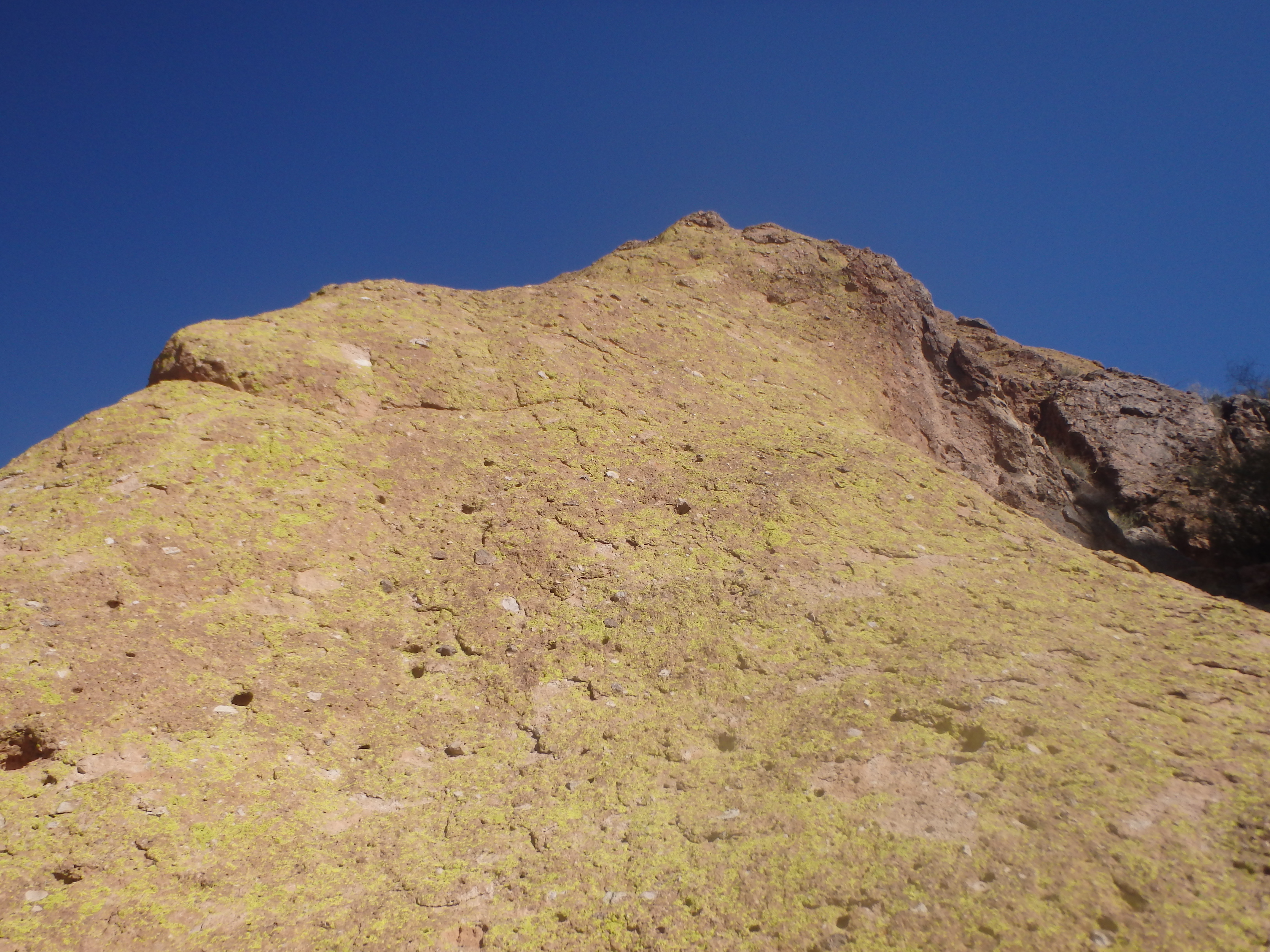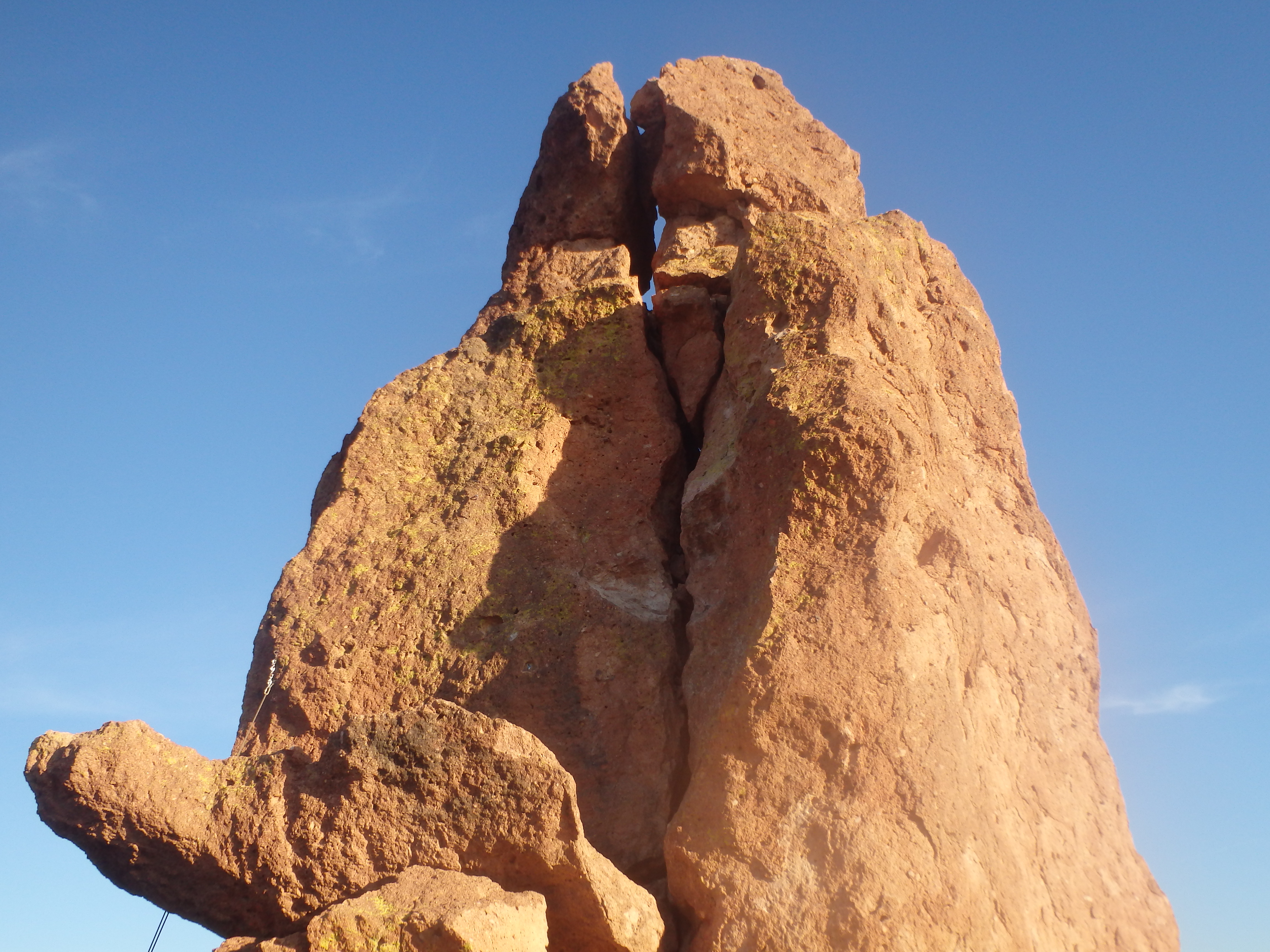 Coyote Rock a.k.a. Greevers Needle is an unofficially named spire in the Goldfield Mountains near the Superstitions. It’s latter nickname is thanks to the group of local climbers that developed the area in only the past several years, the small 100+’ spire features a number of routes ranging from 5.4 to 5.9 in difficulty. I hadn’t climbed on Superstition Rock since my outing on Weaver’s Needle nearly one year ago, and was looking forward to introducing Holly to the gritty pocketed rock throughout the range. One of her coworkers, Colin, was up for a day of climbing as well (despite a rappelling incident during an outing on Toms Thumb one month prior) and Greevers Needle seemed like a good choice given the proximity to his home. We met him at his house and reached the ‘trailhead’ for Greevers Needle off Idaho Rd in Apache Junction. There were actually a number of cars parked there when I arrived, and I thought we might be sharing the crag with some other groups. In actuality, there were just a few families out for a morning hike exploring the canyon, and we would have the area to ourselves all day. The Needle was in view from the start, and we hiked a good trail up the canyon directly towards the needle. The trail followed the direction of the canyon veering east towards a subpeak unofficially named Minion Mountain.