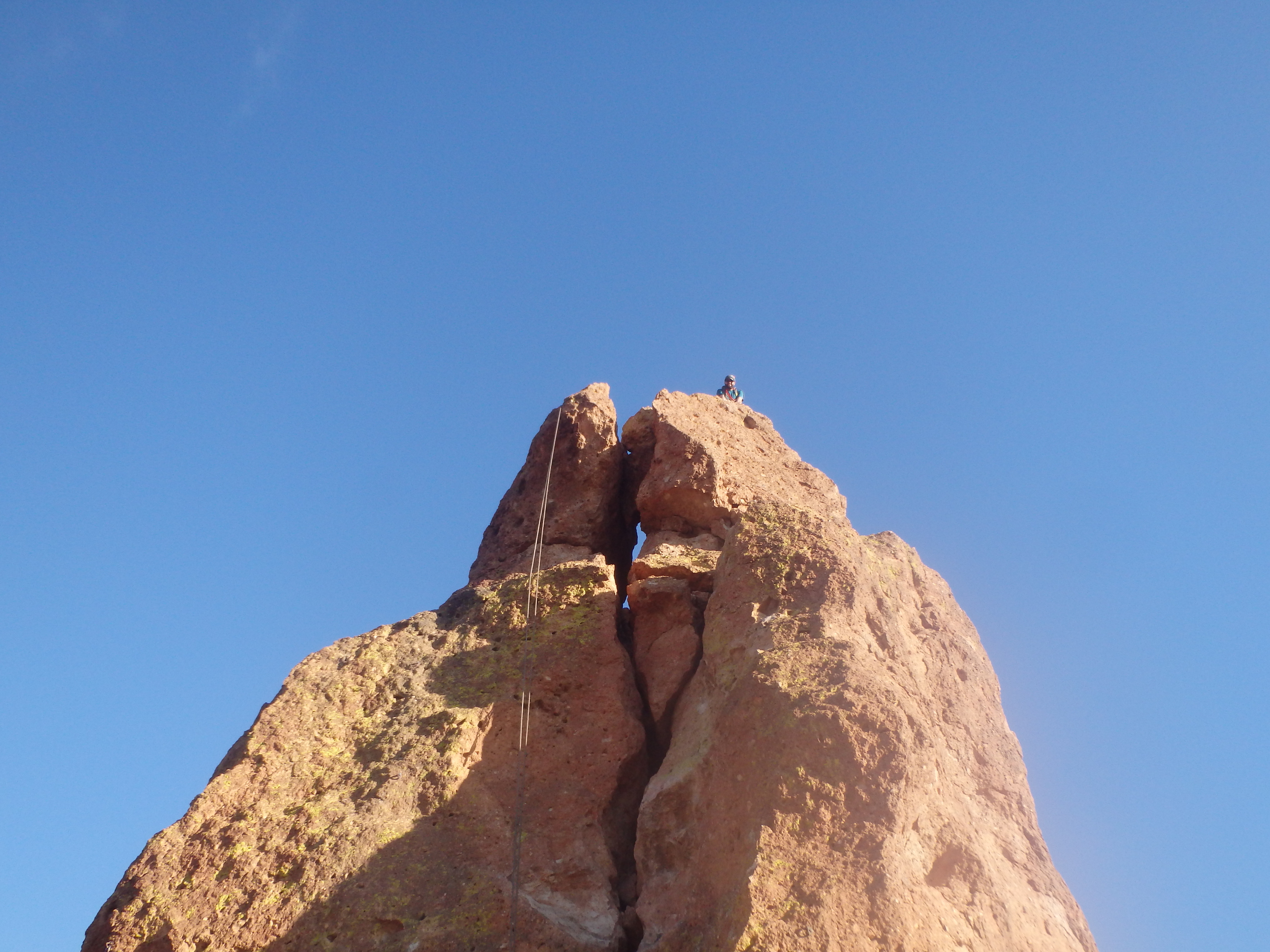 No one liked the idea of soloing it, so we roped up at the base while Holly belayed me up the 30ish feet to the ledge below the main spire. The approach pitch was easy with many ledges and pockets, although protection would have been a bit difficult had I really needed it. A large boulder on the ledge provided a bolt to belay from, and I brought up Colin and Holly to the start of the main pitch of Greevers Needle. This side of Greevers Needle had four different summit lines from 5.4-5.7, and I preferred to climb the off-width 5.4 crack directly up to the summit, the ‘Gordon-Collins’ route named for the first ascentionists. This route seemed to be the only pure trad route on the spire (part of the reason I was interested in it) with the other routes being climbed as sport with well placed bolts.