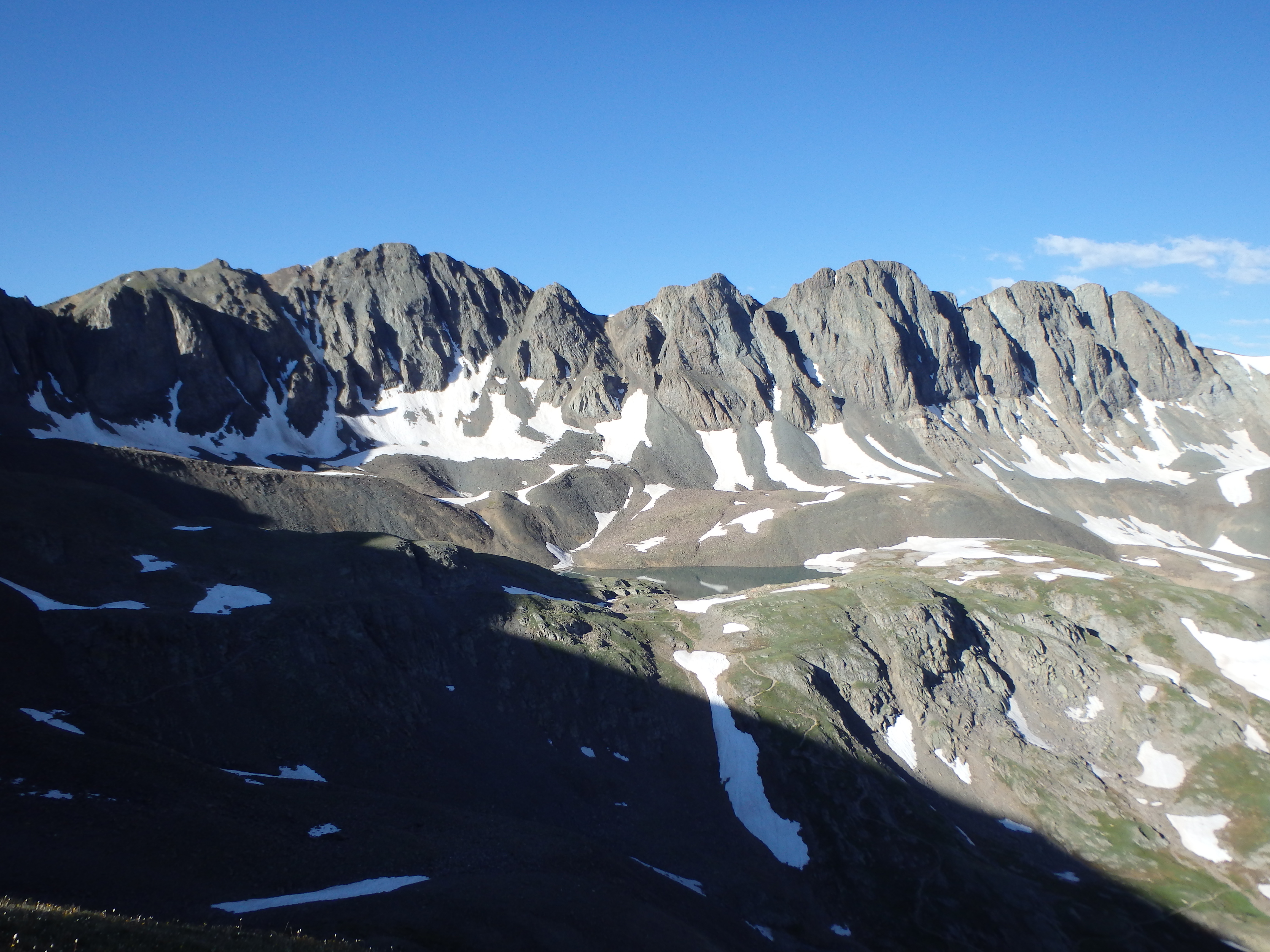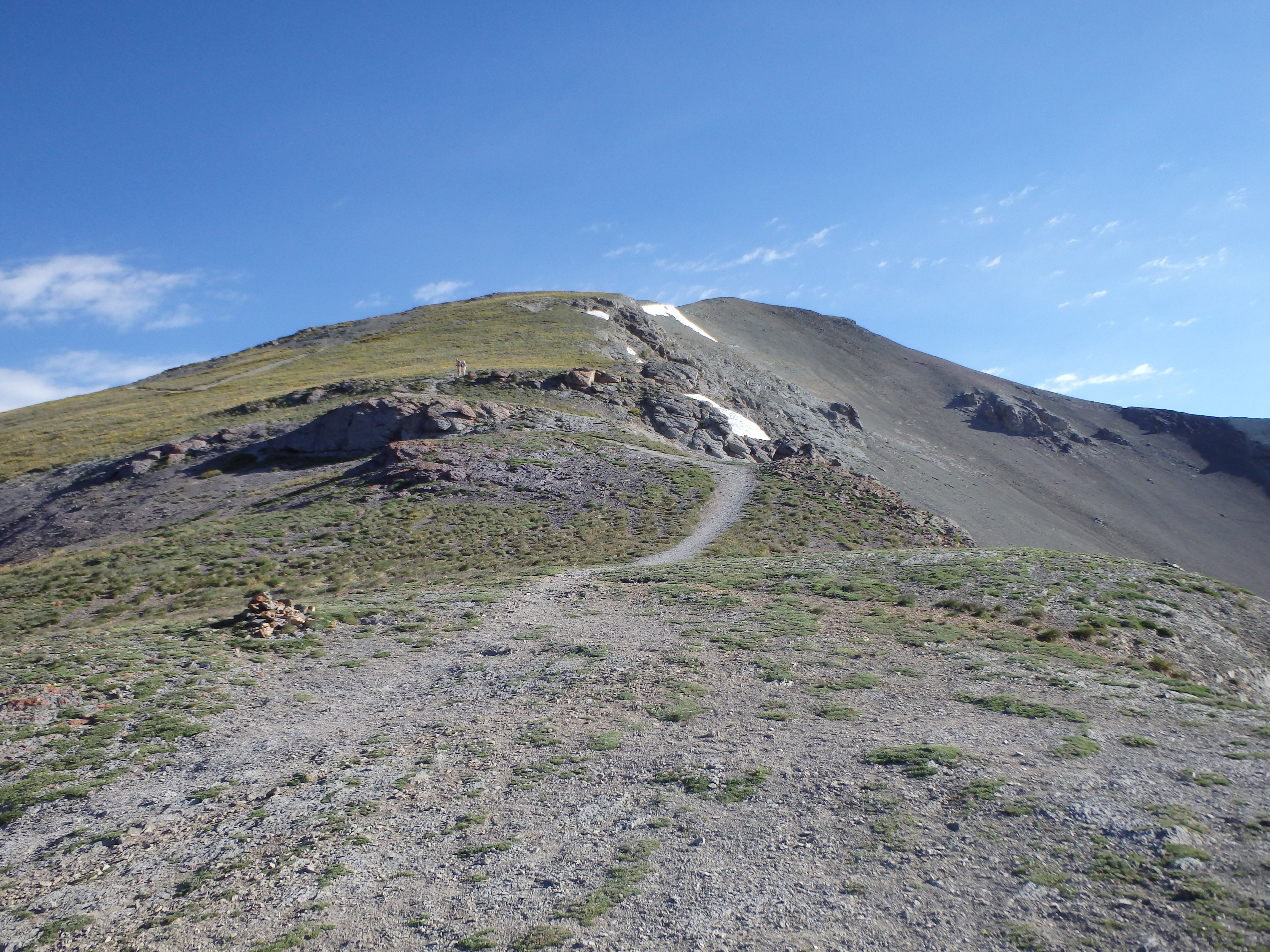 There were a number of cars already at the trailhead, the easier summit being understandably popular, and I set out under partly cloudy skies into the beautiful alpine basin. What seems to set Handies apart from any other 14er I had climbed in either Colorado or California was how green it was. Unlike the bare, loose rock I had fought with on Wilson Peak, the trail and basin was mostly packed dirt with grasses and wildflowers leading nearly to the summit. It was a nice contrast considering the rough day I had before. My ankle was holding up well as I hiked along, and although it was about 4 times the size as my normal right ankle, the pain was mostly a dull ache. I passed a number of groups as I climbed into the higher basin near Sloan Lake, and began to traverse across a rocky slope as the trail began to switch up to the summit.