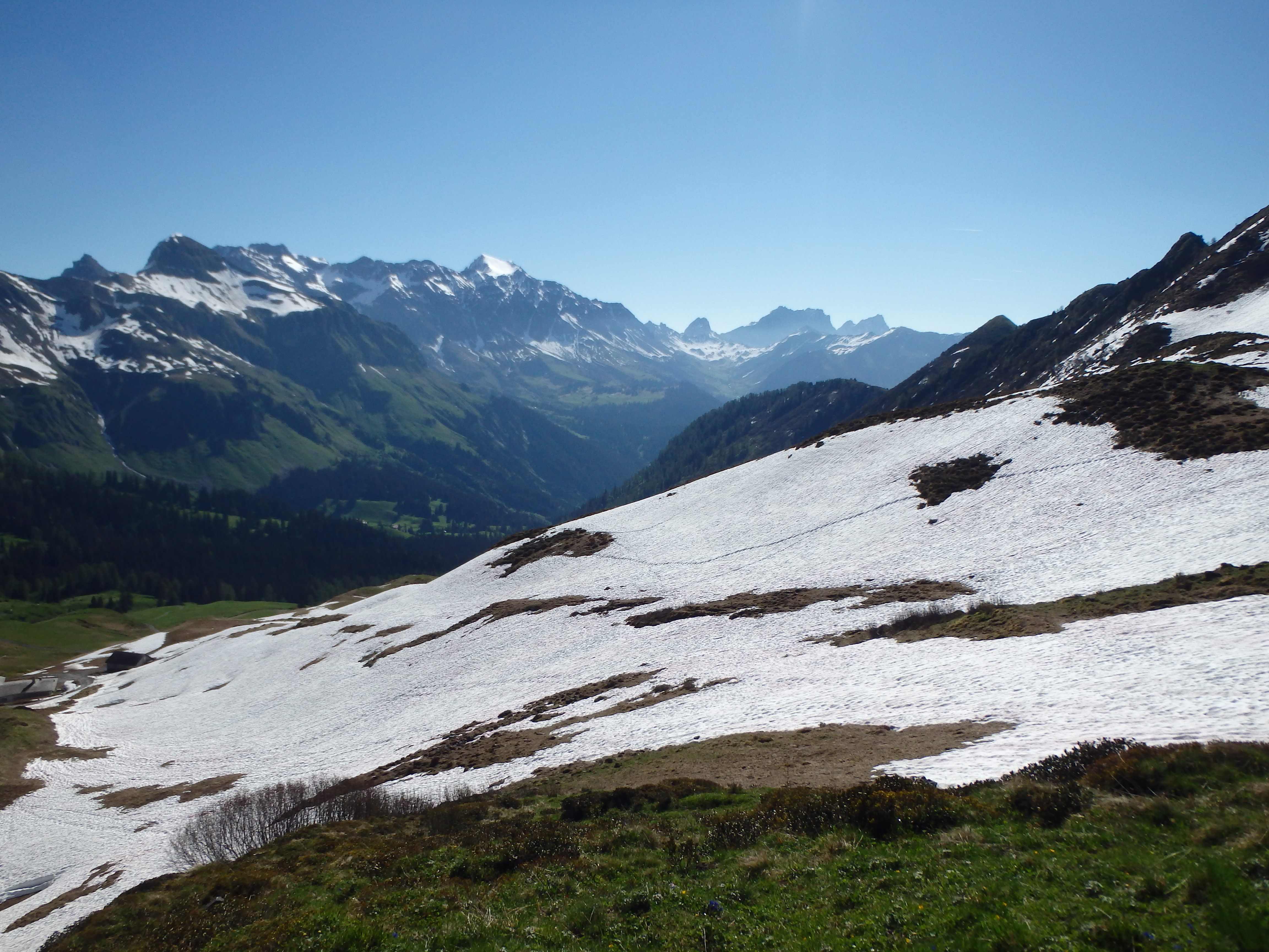 The signs did not indicate distance but rather estimated time, a nice way to gauge my speed throughout the day. While I could see plenty of snow on the surrounding summits in the distance, it was mostly north faces I was looking at, and couldn’t see beyond Kamm to judge route conditions. The route followed old farming roads, muddy in spots, to a high saddle on the intermediary ridge Kamm.