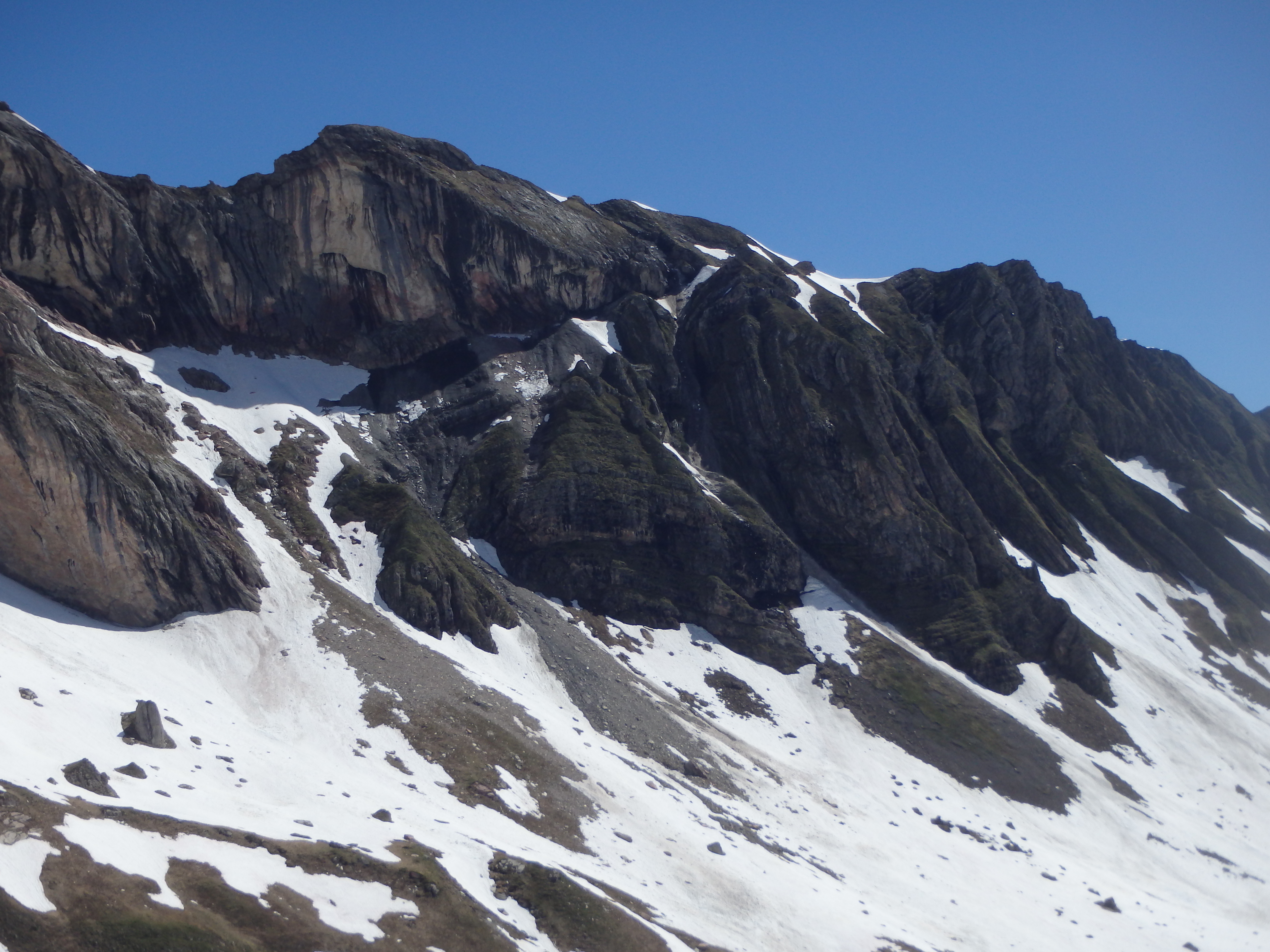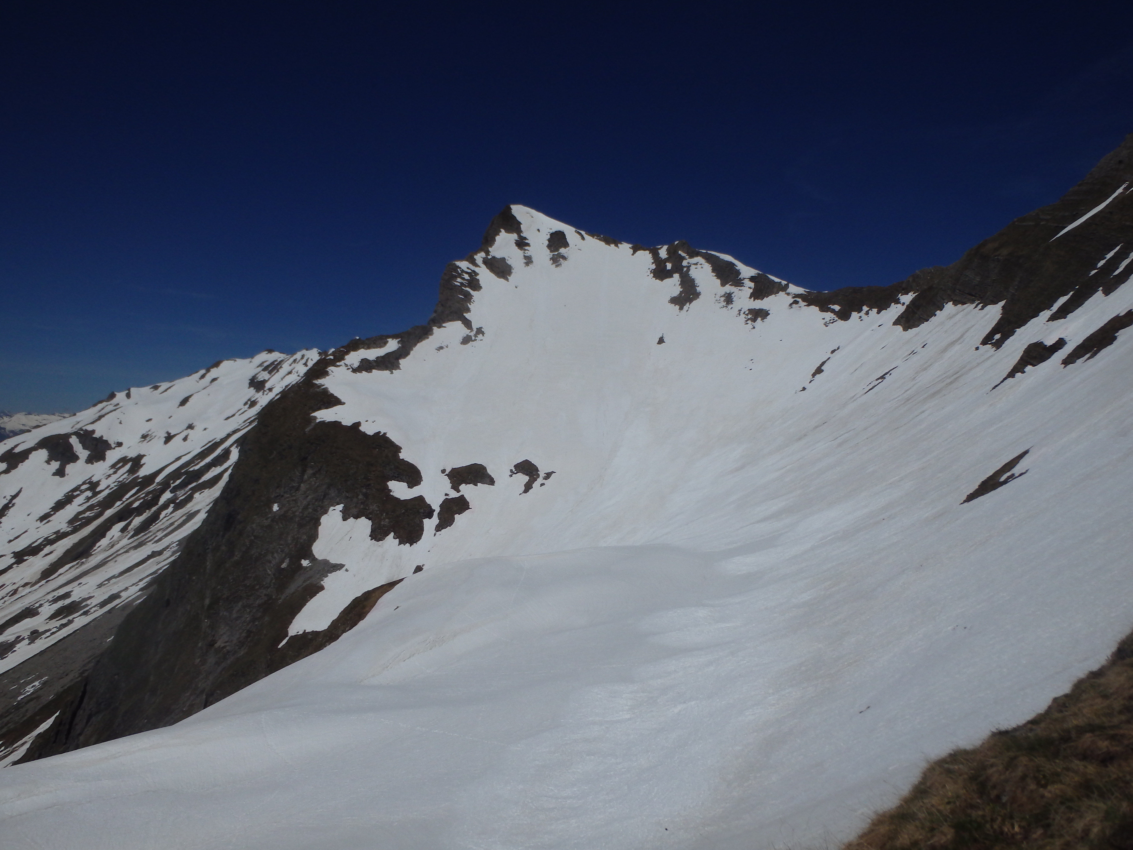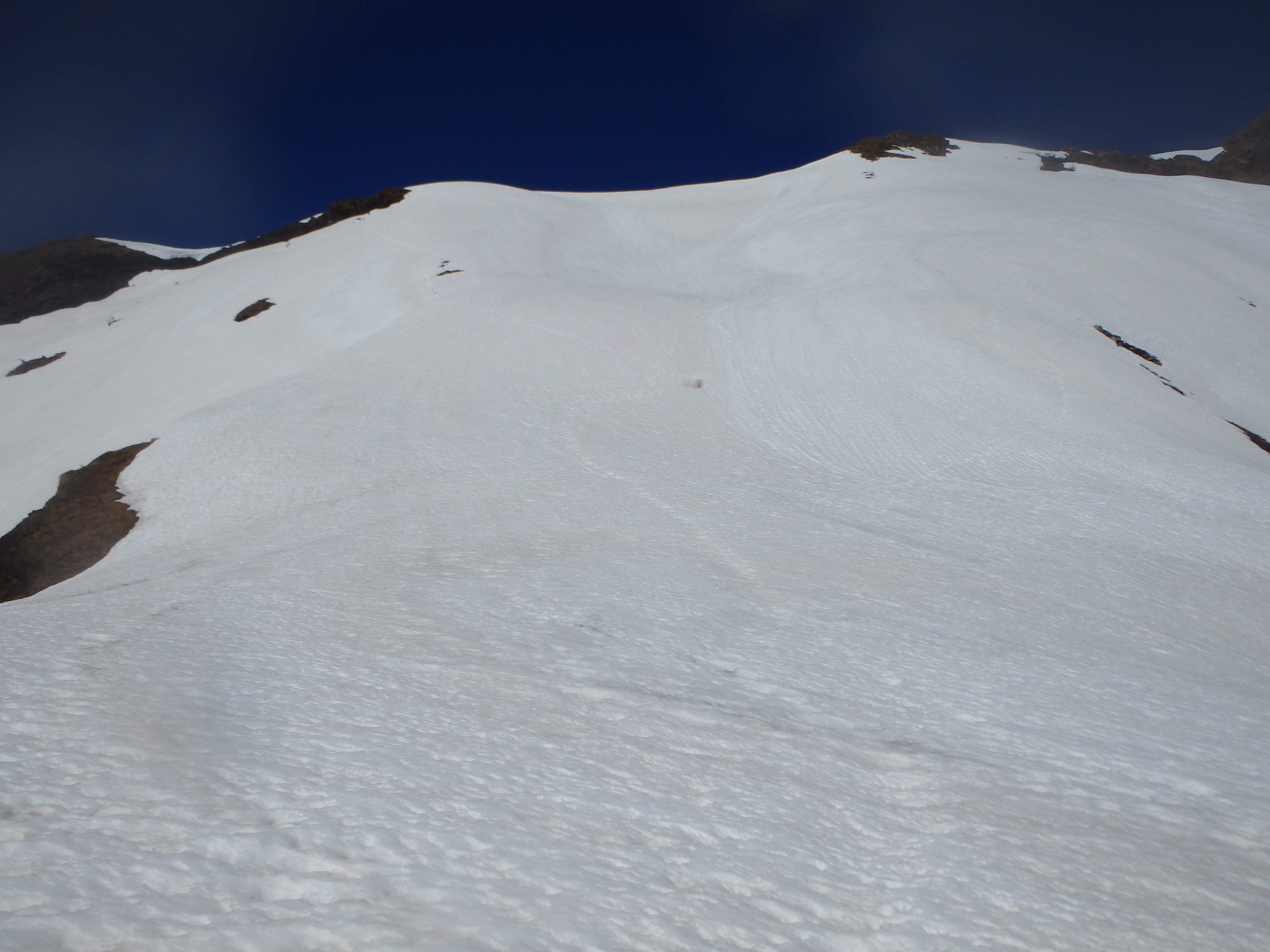 Nearing the main ridgeline, my snow free luck ran out, and I was faced with the decision to press on. I still couldn’t see Vorder-Grauspitz, blocked by the main ridgeline, so I was unsure of the conditions beyond this. But the section wasn’t steep and I did have my crampons, although I didn’t think I’d actually be using them when I left that morning, and did not bring my ice axe. I could see faint track in the snow which I found reassuring, and put my crampons on over my hiking boots and started upwards. The snow was already growing soft from the fairly intense sun, and I was mostly kicking steps up, my boot getting quickly saturated. I hit the main ridgeline, giving me my first look at the upper bowl and the remaining route to Vorder-Grauspitz, which, not surprisingly, was 100% snow covered. I had intended to drop into the upper bowl and climb the south face directly, avoiding the loose class IV ridge between Vorder and Hinter, where most parties have trouble. Unfortunately with the melting, loose snow, I doubted that the high angle ice near the top would be able to hold me, and I turned my attention to the traditional route up to Hinter with a traverse to Vorder-Grauspitz. I was surprised to see the route looked mostly snow free aside for some low angle snow patches, and thought I would climb Hinter Grauspitz, then reassess.