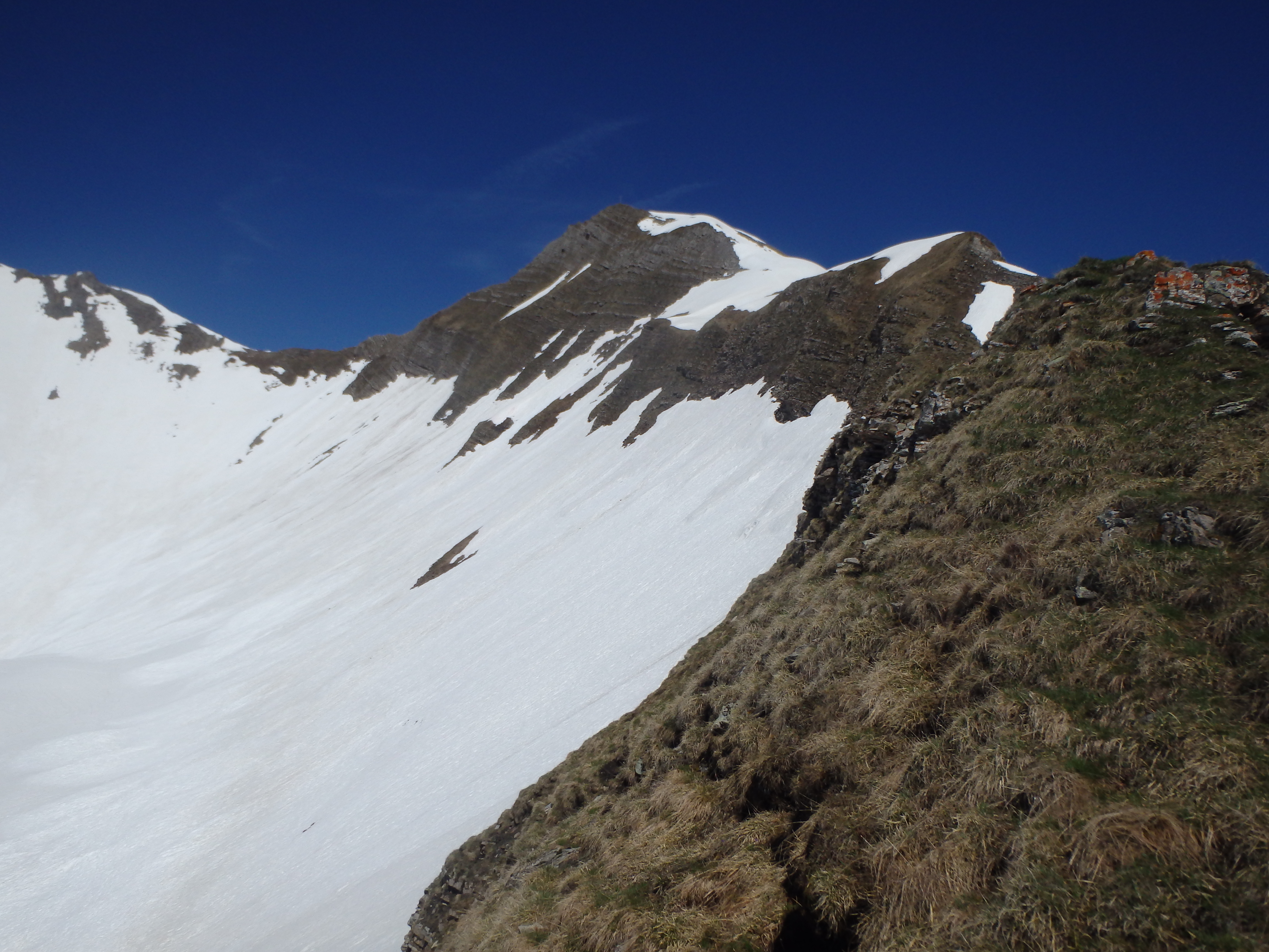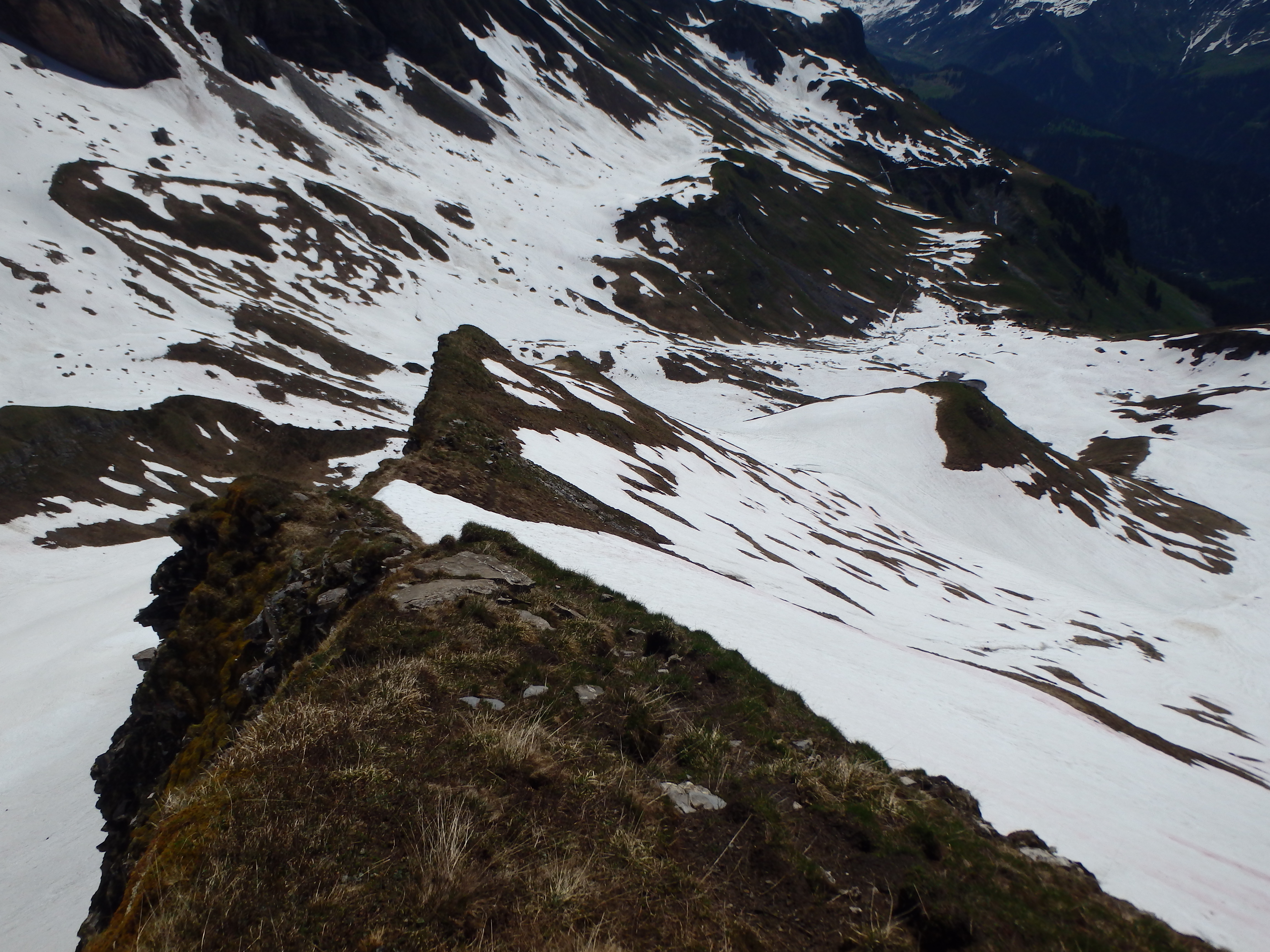 After signing into the summit register, my attention immediately turn to Vorder-Grauspitz. While the descent to the saddle between the two summit appeared to be snow free (and reportedly, the most difficult part), the narrow, class III ridgeline heading to the top of Vorder-Grauspitz had several areas of significant snow and ice. I studied the route carefully, and dropped down partways to better assess it. Immediately above the saddle, there was a narrow section with death exposure to the north, covered in loose and melting snow. A similar and longer section could be seen just above this, which was capped off by the steepest part just below the summit, where the angle probably approached 60 degrees, with death exposure to the north and 1000′ to the bowl to the south.