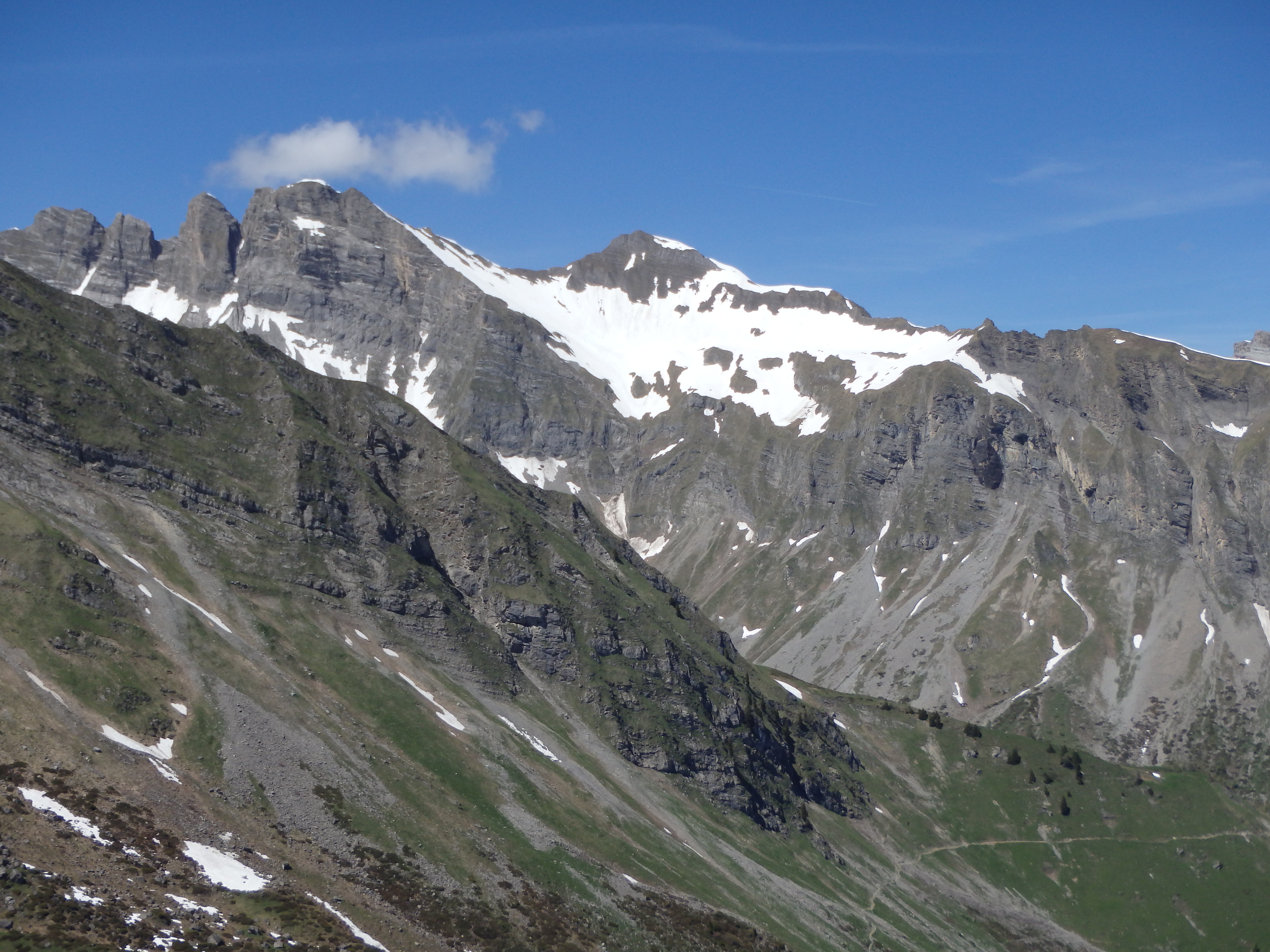 I could see a summit cross above me, and after orienting myself to the map, took a narrow subsidiary ridge connecting to the main southern ridge on Hinter-Grauspitz. The ridge was mostly snow free, and was steep but easy hiking up grassy slopes for the lower 3/4. About halfway up, I heard a loud crash behind me, and saw an active rockslide happening on the slopes of the mountain to the east. The seriousness of the climb in sub-optimal conditions was beginning to set it.