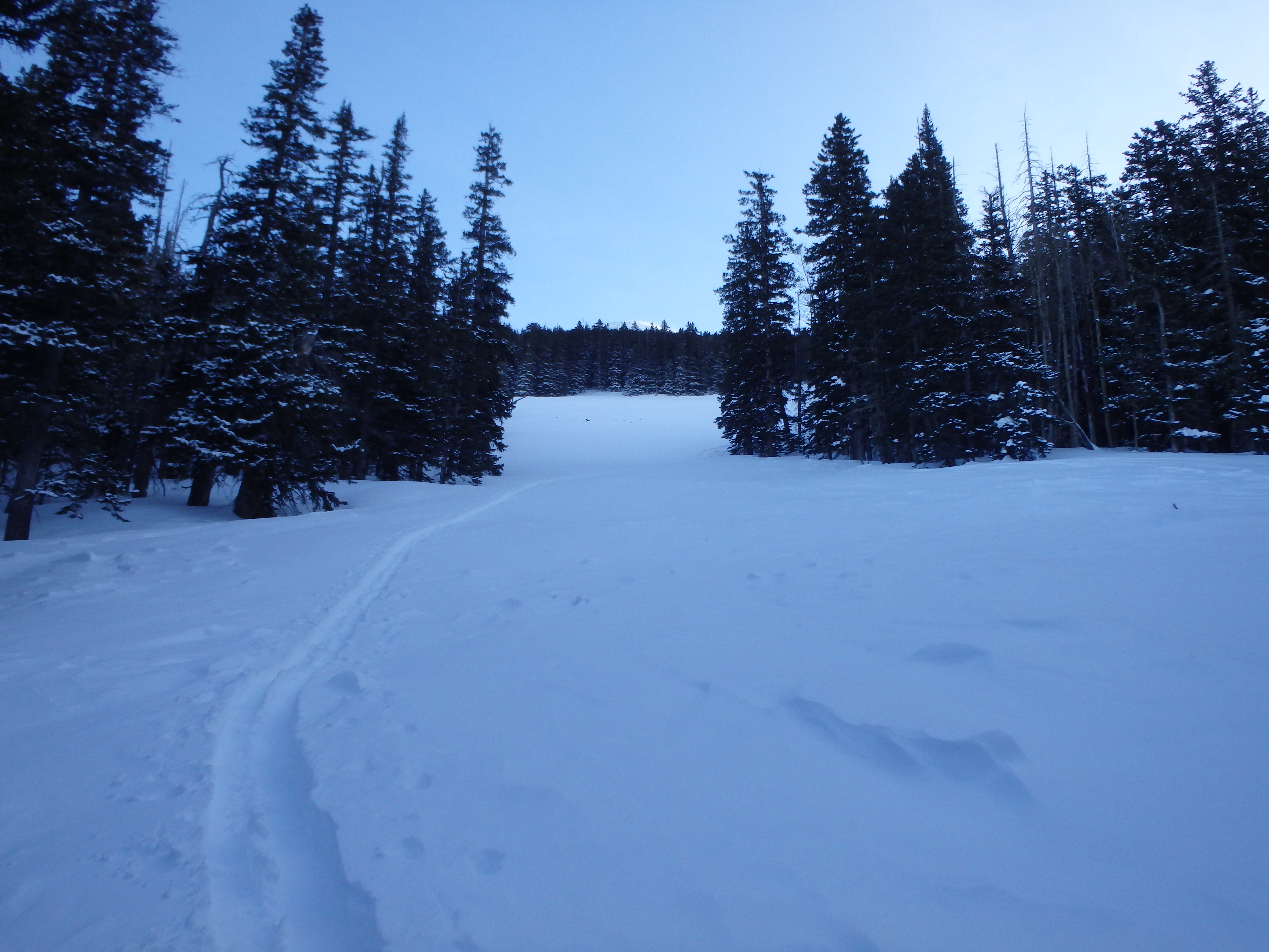 Leaving the packed ski area, we put on our snowshoes, and followed fresh ski tracks along the trail. We continued along the slopes traversing to the north until reaching the first switchback of the summer trail, buried in snow. Here, the ski tracks continued north away from the summer trail, and we continued to follow these to the bottom of the Dutchman Glade. The glade was a narrow clearing formed by rock slide, which made for an unopposed 800′ ascent upslope.