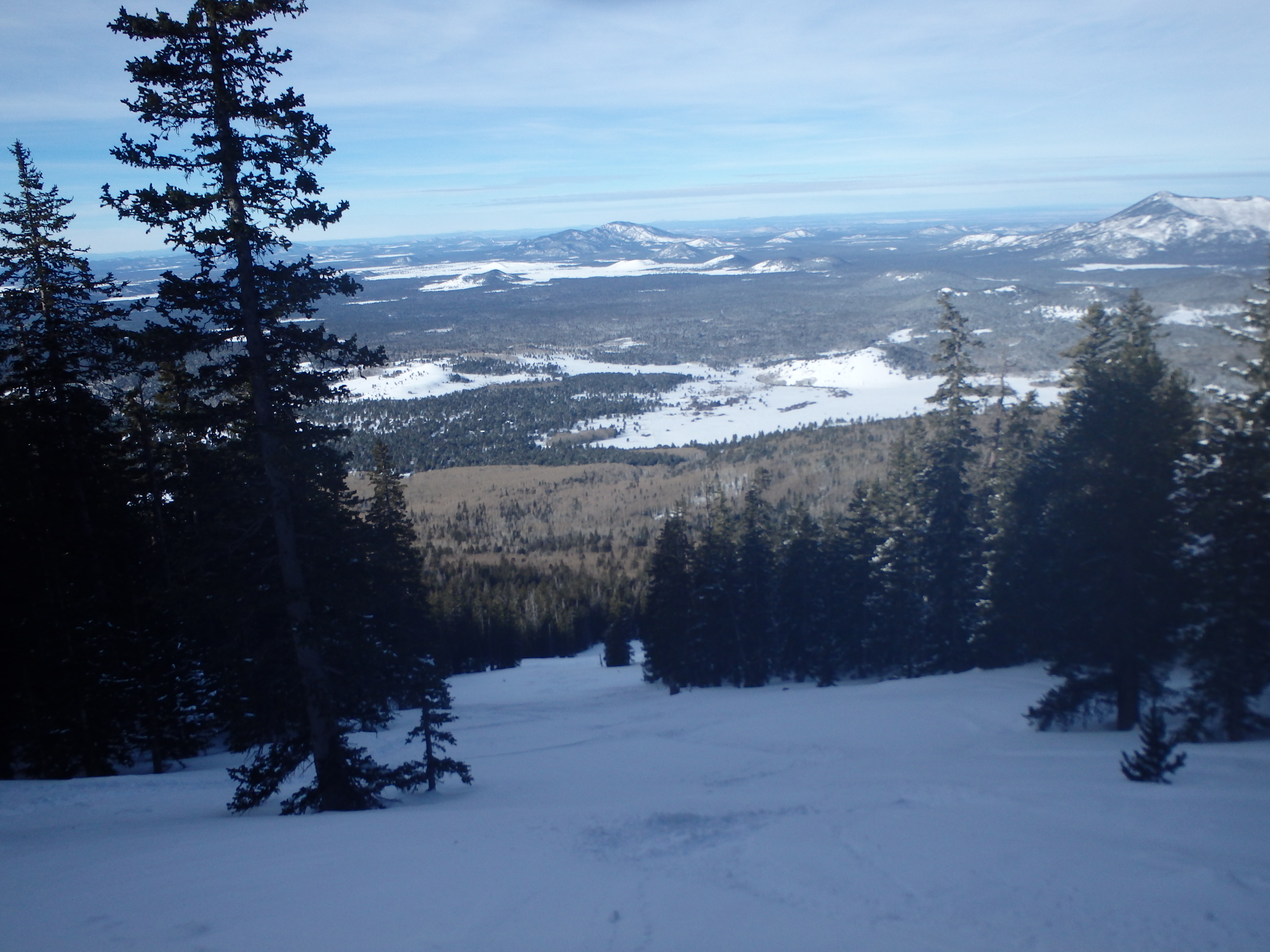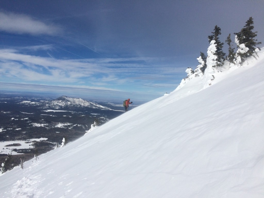 Partway up we met some skiers and thanked them for the tracks they had made for us to follow. Climbing higher, the views began to open to the west, with multiple snow covered volcanoes (Kendrick, Sitgreaves, Bill Williams) coming into view.