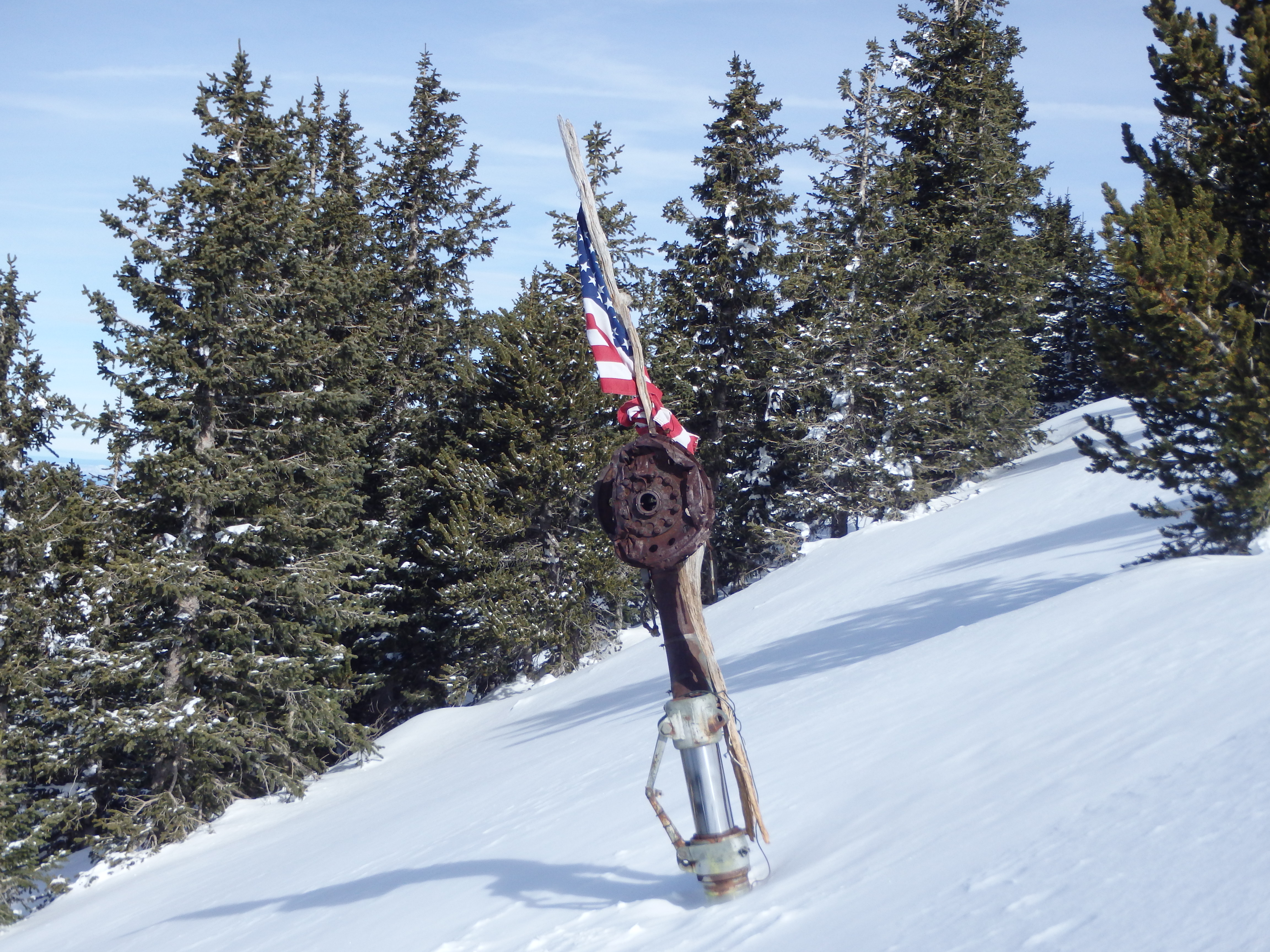 Way in the distance, you could see the North Rim of the Grand Canyon, covered in snow. At the top of the glade and back in the trees, we took our first break. I had heard that finding the next glade, the location of the B-24 bomber, was not straightforward. Luckily, there were tracks to follow, as the narrow trail continued to weave North and upslope, coming to the bottom of the glade. I could see parts of the plane wreckage adorned with an American flag, and headed straight upslope towards it. The plane crashed on September 15th 1944, killing eight men en route to New Mexico from Bakersfield, CA. Even with the fresh deep snow, the landing gear stood 10 feet above the slopes, with smaller bits of metal sticking out nearby.