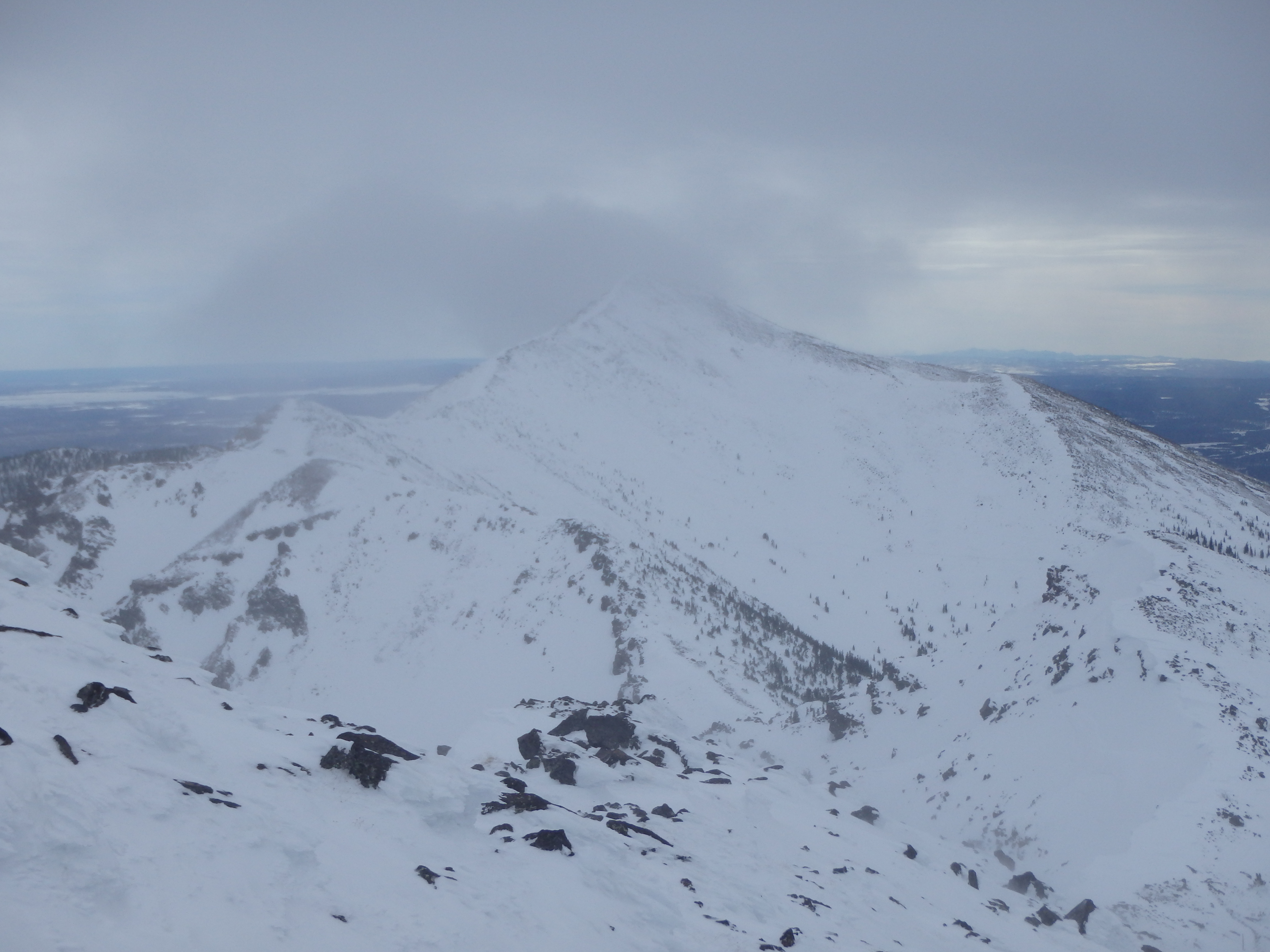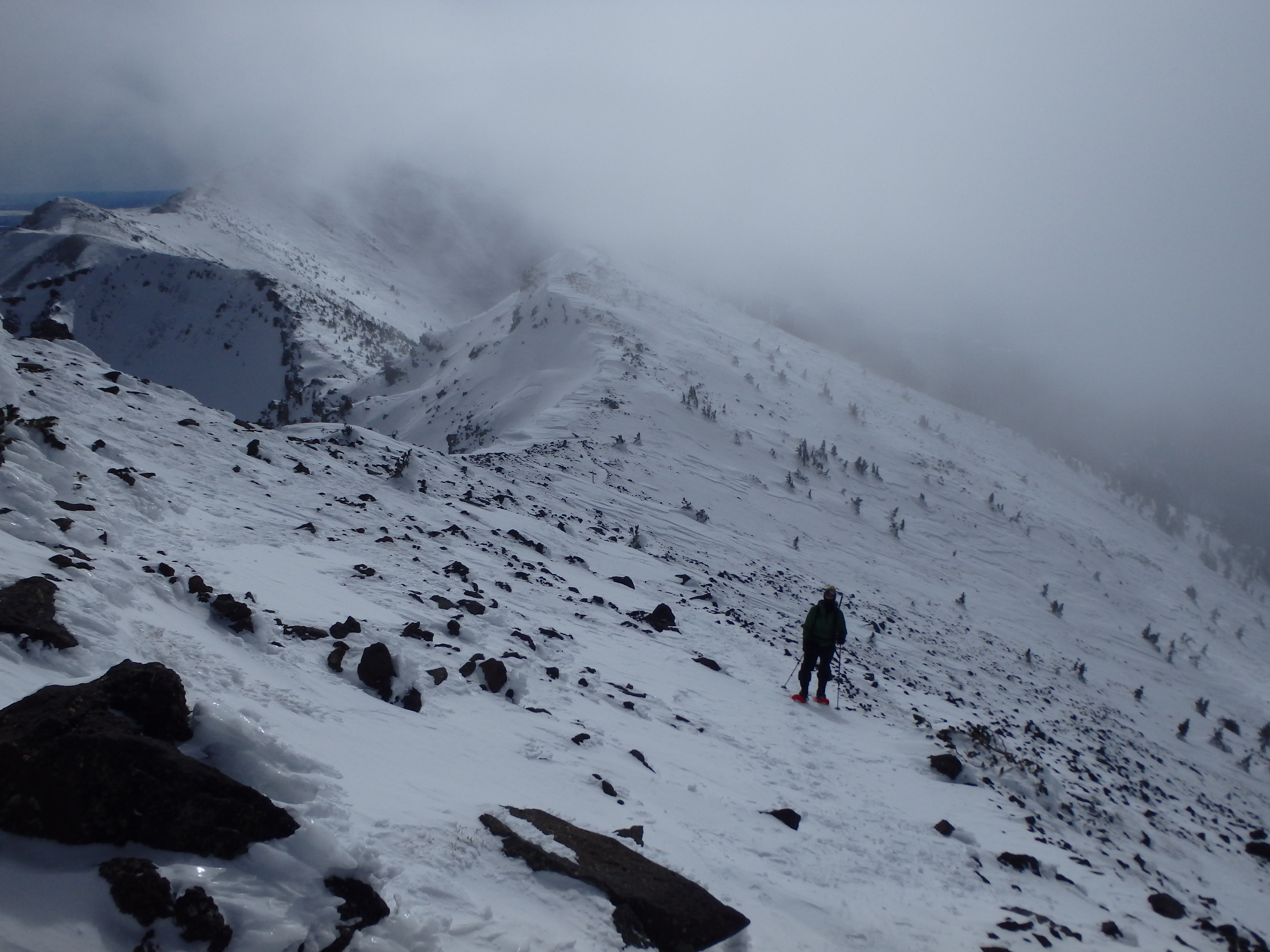 After sliding a few times, I changed my tactics and aimed for scattered rocks sticking up through the crust, providing better traction and bringing me to the ridgeline. A number of unfortunate things happened from this point. The first was that the cold sapped the battery from my GPS, meaning my track on 3D Earth above ends at the ridgeline. The second was that as we ascended the ridge, the winds increased and thin clouds moved over the summit. I grabbed some shots before being completely overtaken by the clouds and we slowly trudged up the ridge, starting to feel the altitude.