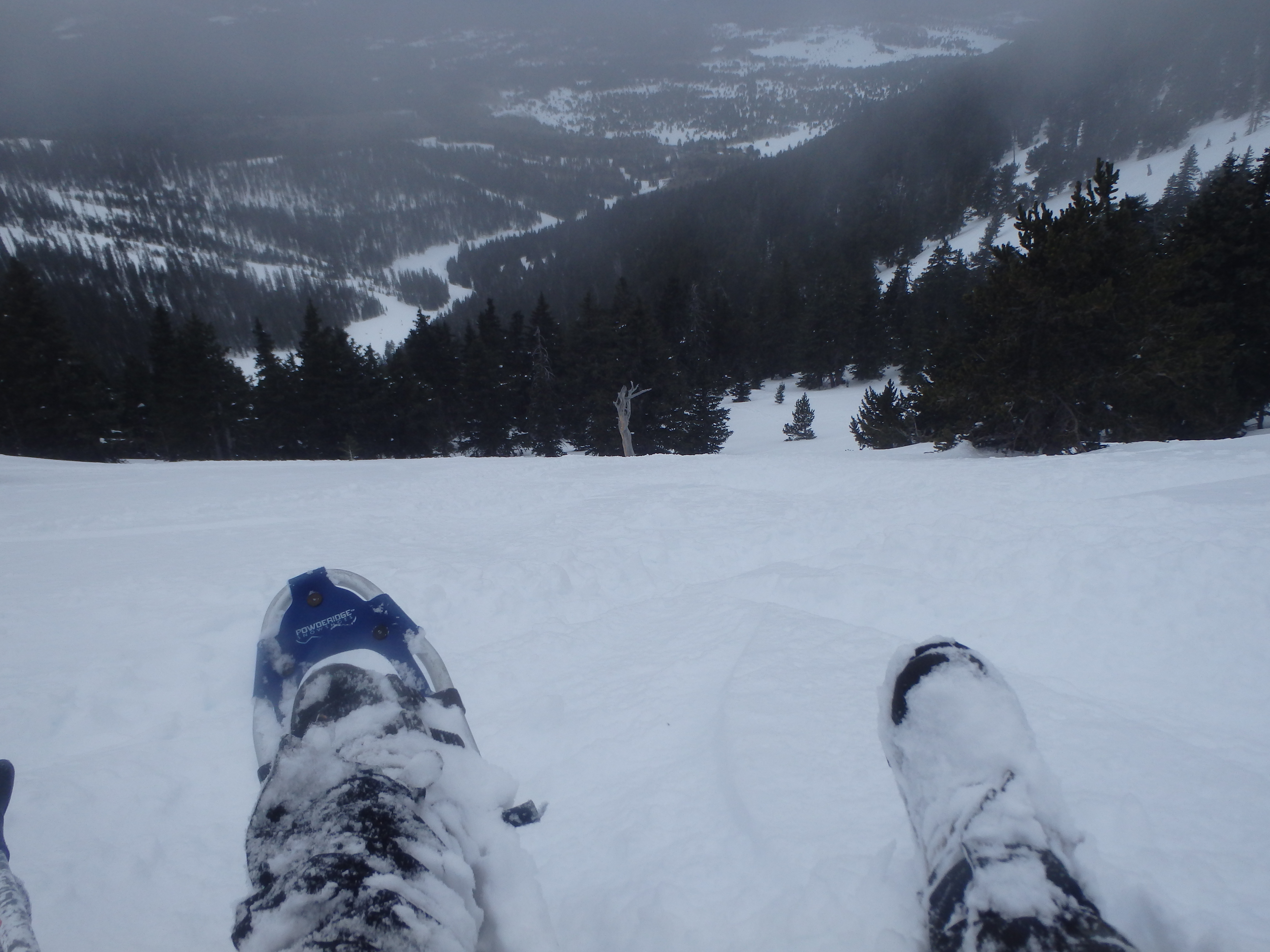 Near the saddle, the snow was a bit deeper, having been loaded by the NW winds. Even with snowshoes, we were sinking to our hips, and I snapped my Leki pole when it was caught in some rocks. We hit the low saddle, finding the signed junction half buried in the snow, and no clear packed trail heading down. There were plenty of ski tracks, and we picked one and started heading down. The tracks soon disappeared, and we found ourselves plunged down thigh deep snow, my snowshoes popping off every few feet from the weight of the snow and iced bindings that I couldn’t tighten further. I tried to glissade down some of the steep sections, but the snow was too loose to make much progress.