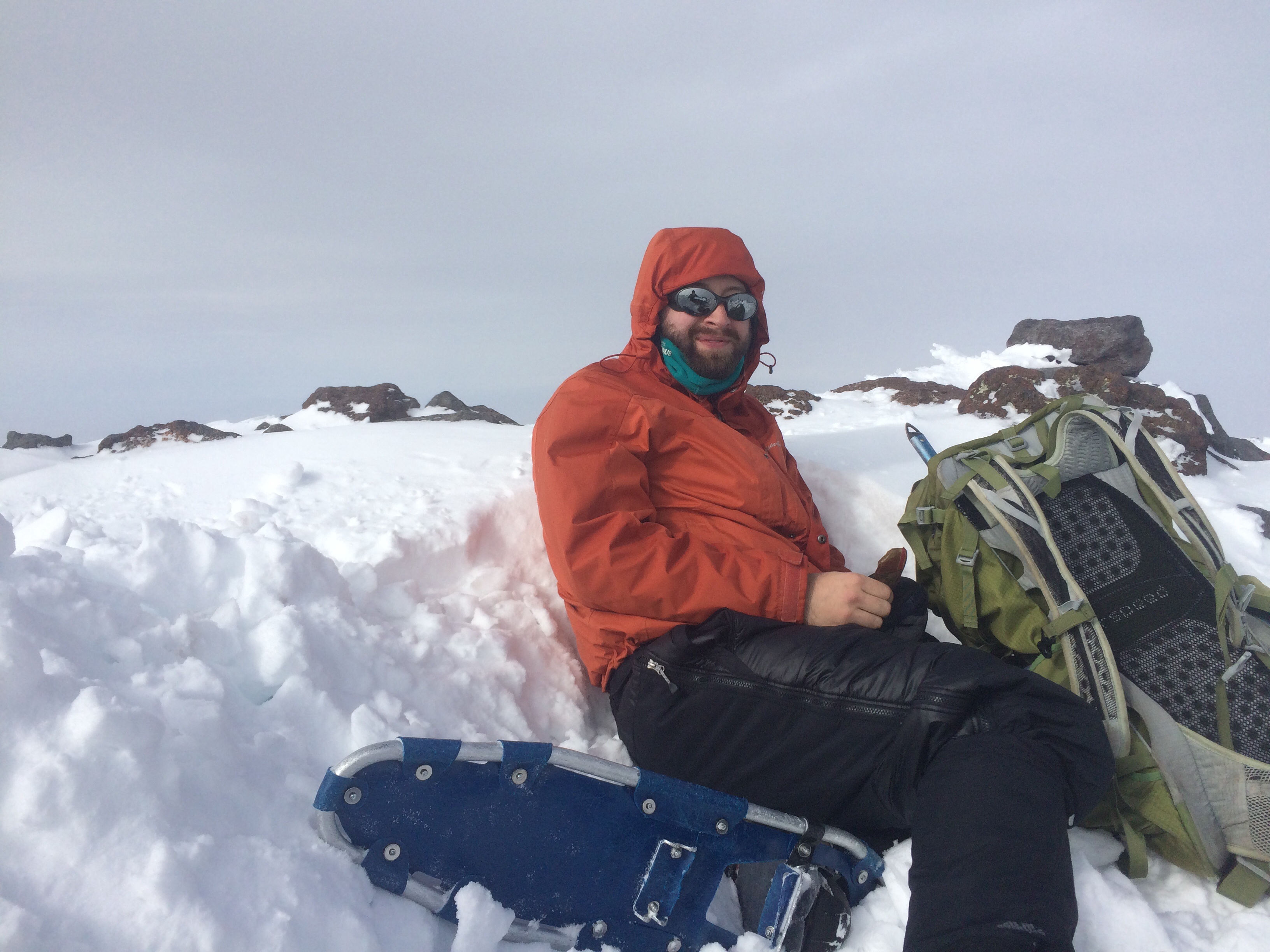 The only other climber to summit passed us just below the summit, and we topped out after nearly 5 hours of climbing. We found some shelter in the rock pile at the summit and tried to rehydrate, although there were no views to be had in the cloud.