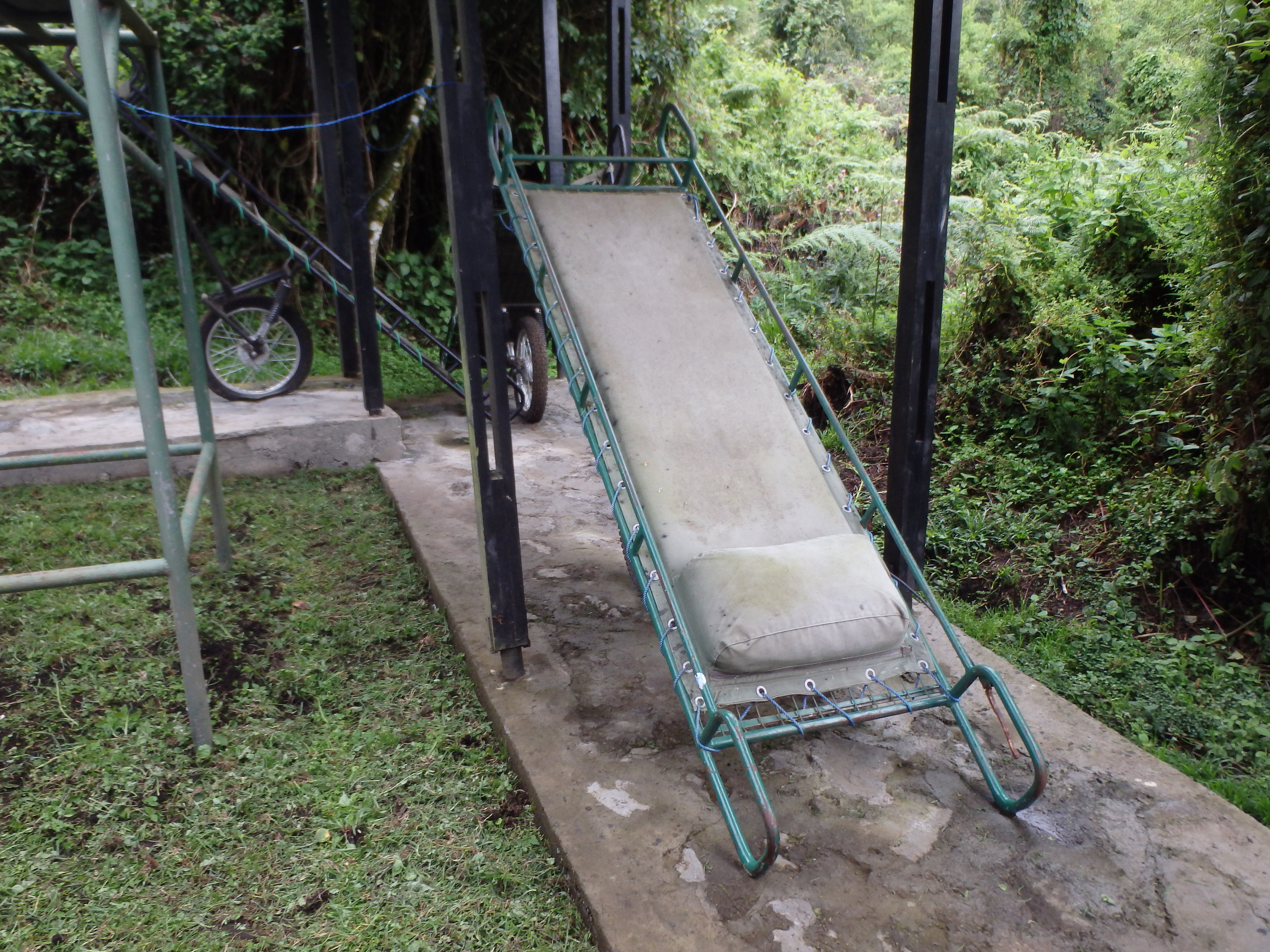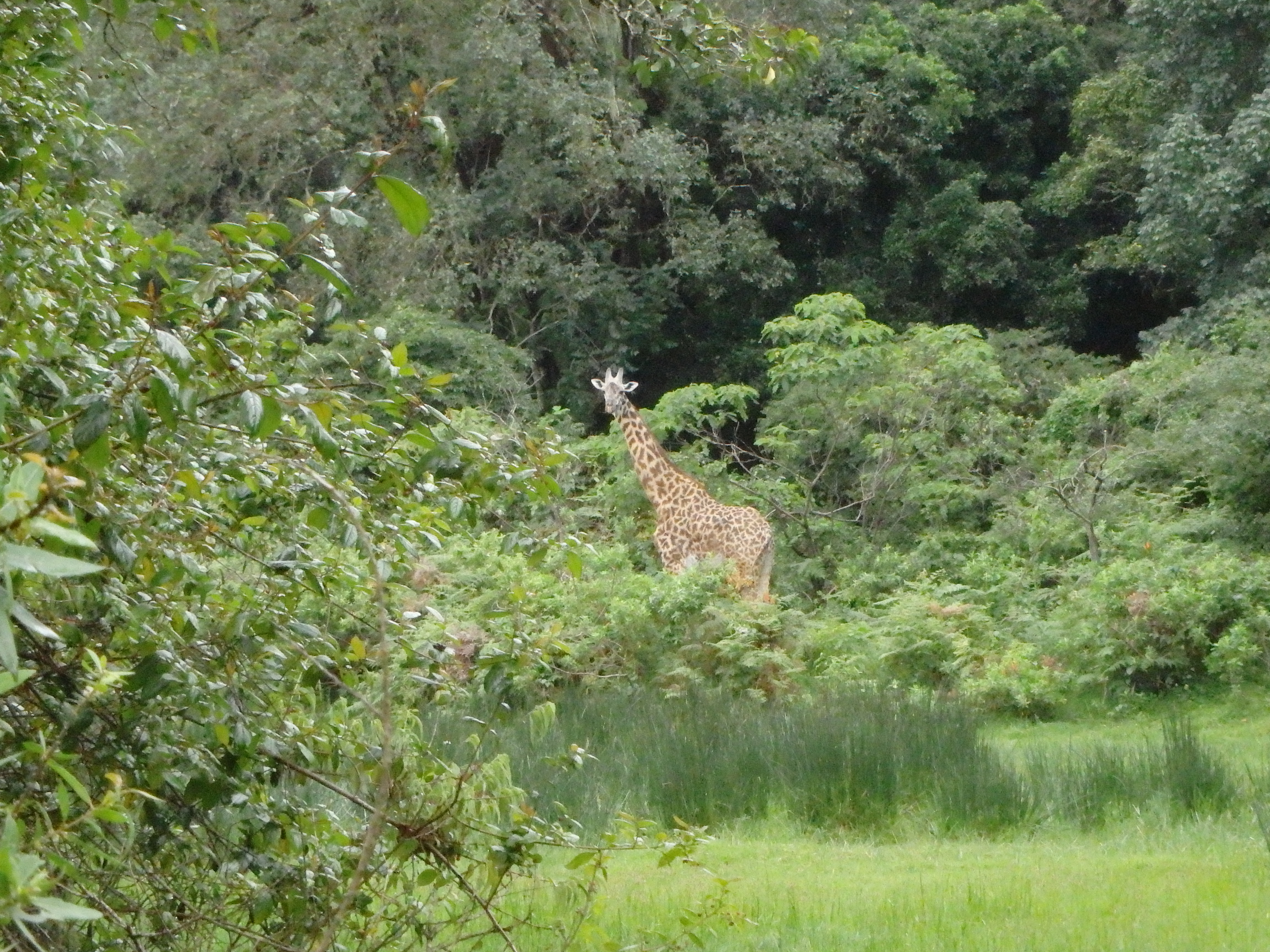 We learned that the ranger that leads the climbing groups wouldn’t arrive until 10. When he did show up an hour later, he took his time getting ready, possibly hoping for another group to show up that he could combine with us. It was after 11 AM when we set out, thankfully the heavy rains having stopped. Our ranger/pseudo-guide Raymond hiked with a rifle slung over his shoulder, mainly to scare off any potentially charging Buffalo. The trail passed through open grassland and entered thick jungle with Colobus Monkeys swinging in the trees above and birds waking up as the rains stopped. Reaching a stream crossing about one mile in, I was shocked to see a wild giraffe grazing about 20 yards off the trail. Certainly the largest animal I’ve ever seen in the wild while on foot.