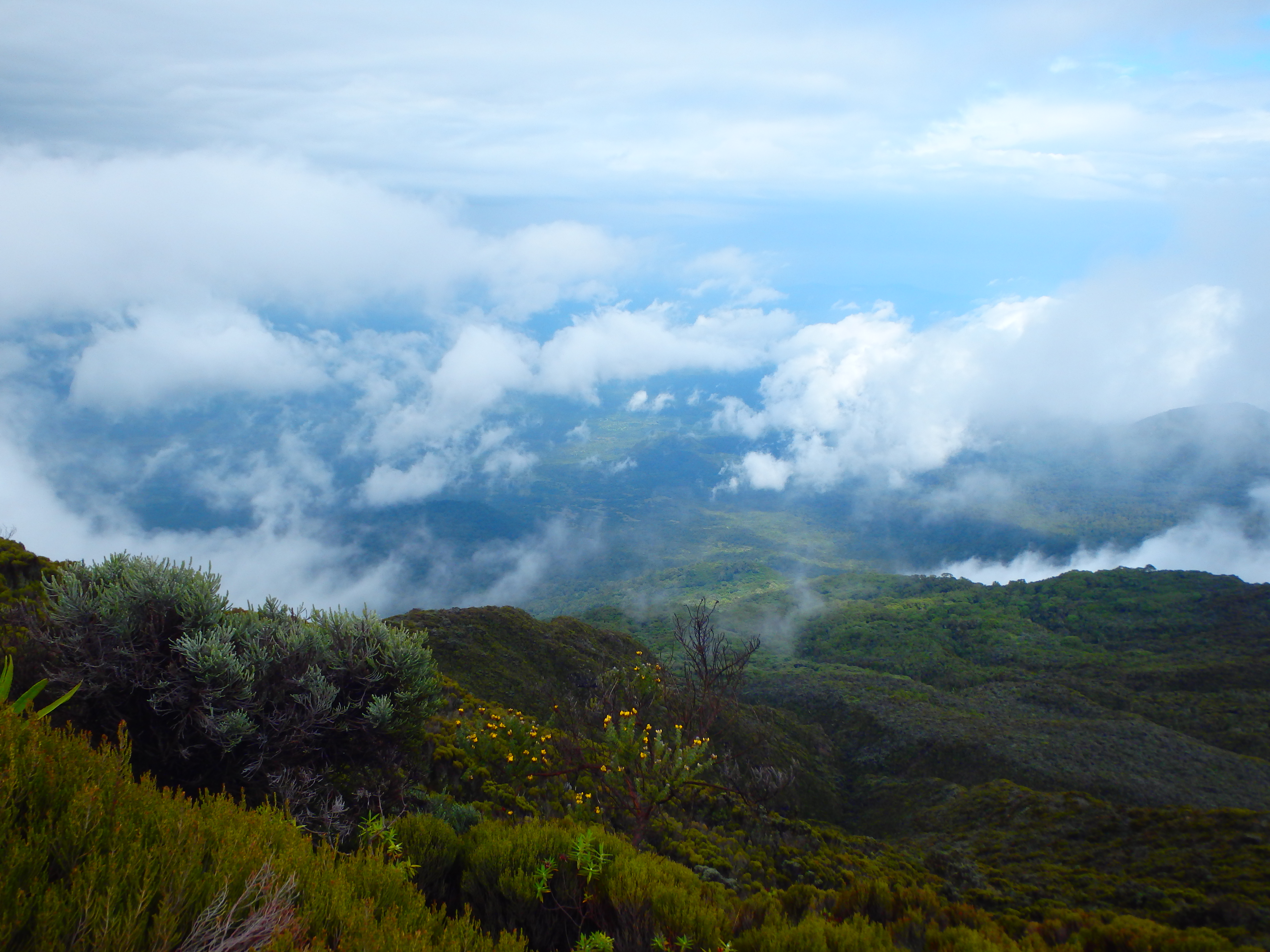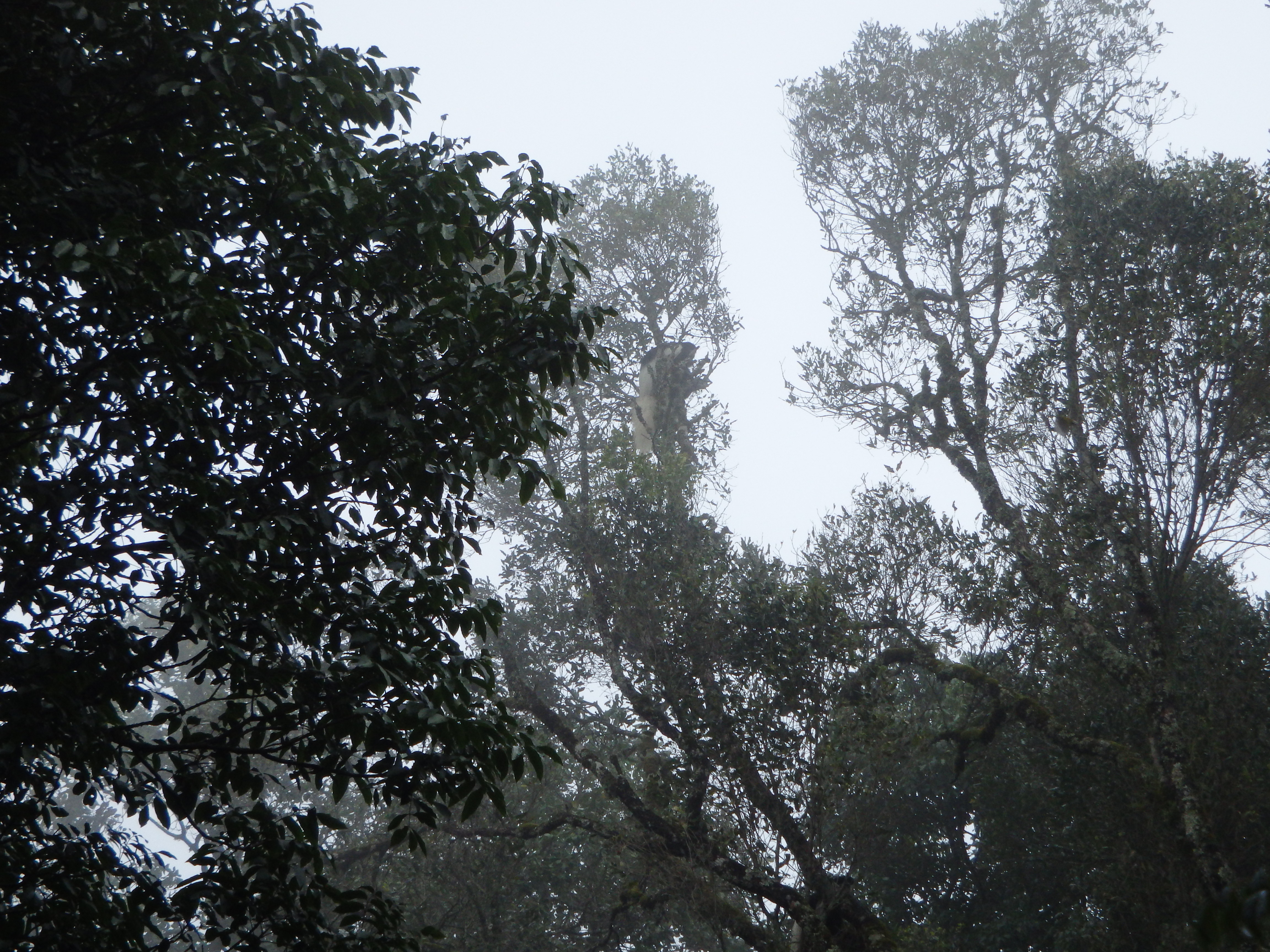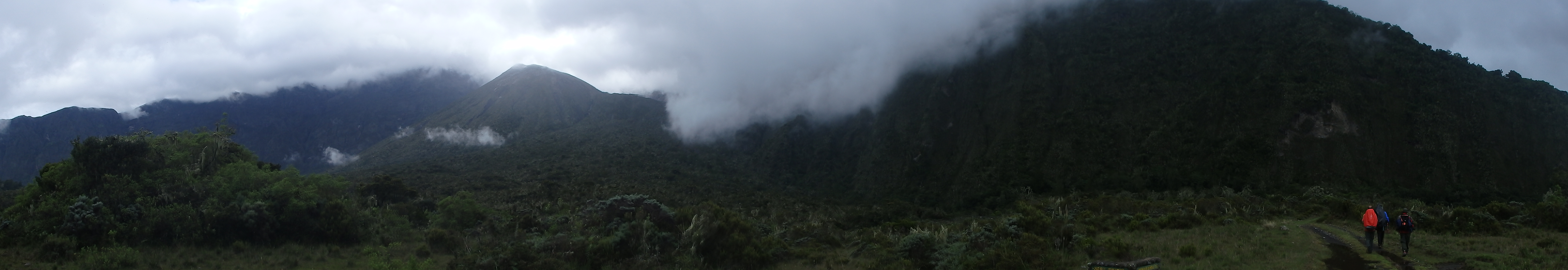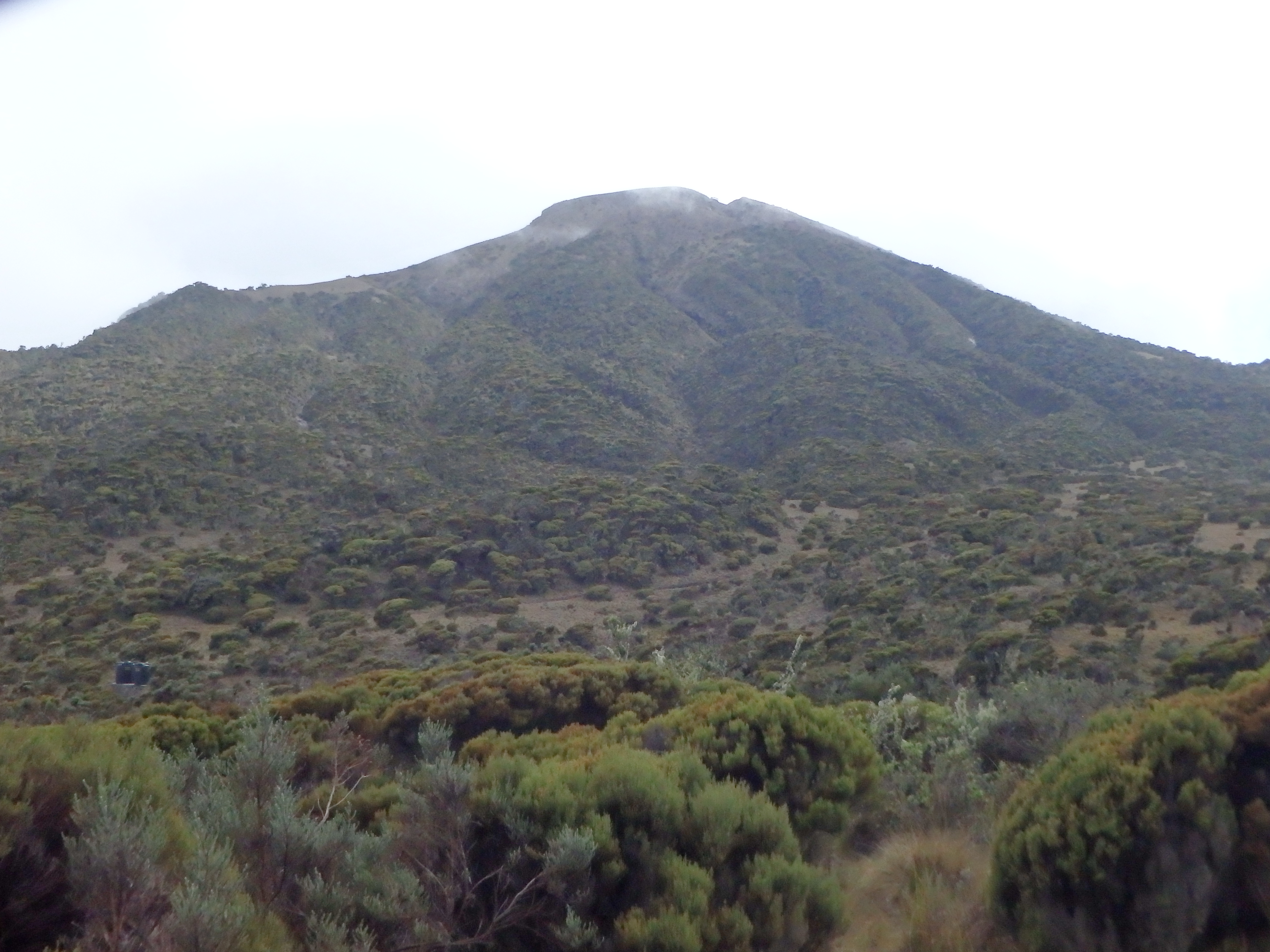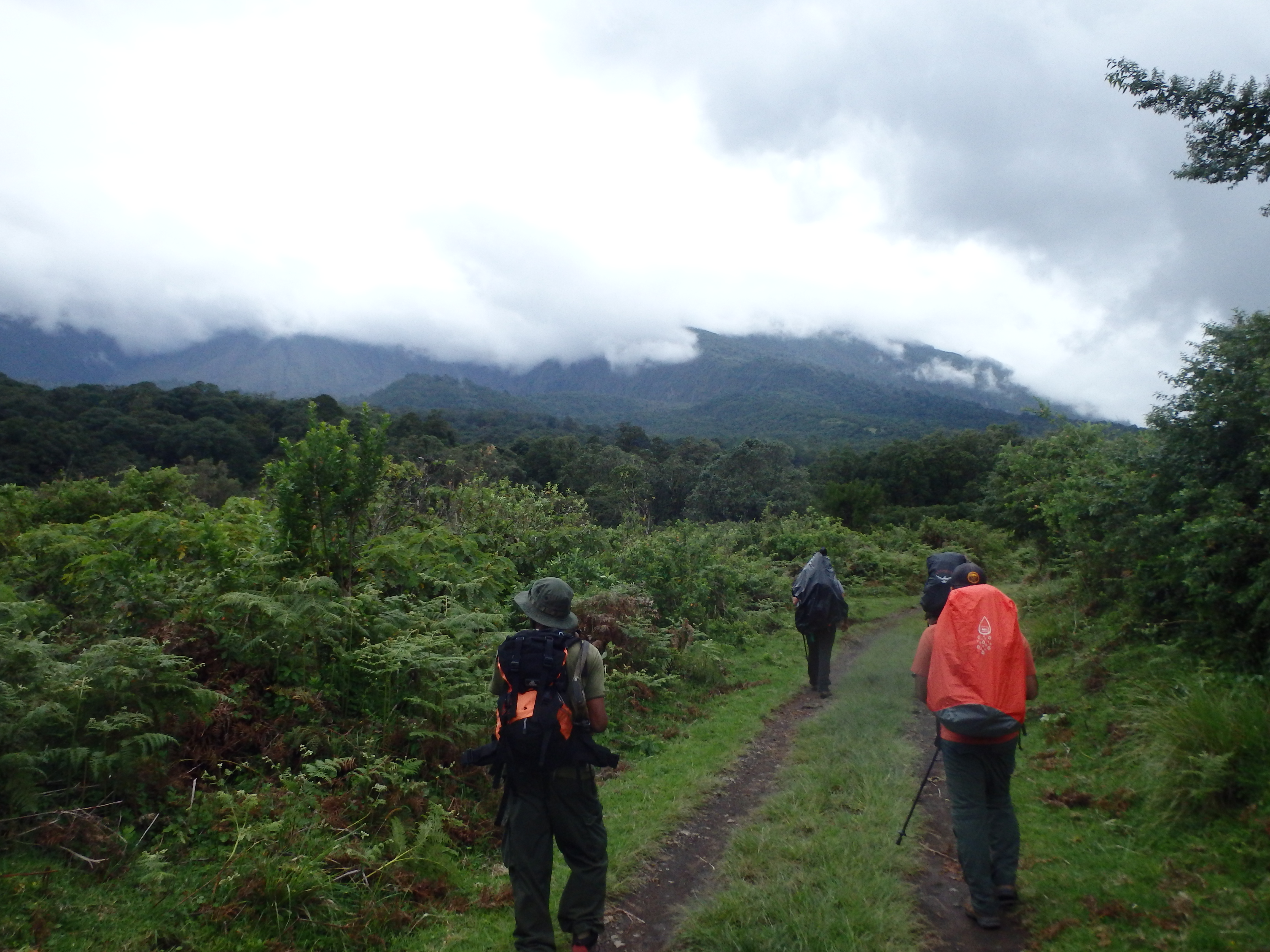 The trail the second day steepened considerably and ascended a narrow ridgeline off of Meru’s caldera rim. The forest thinned as we climbed higher, leaving the lush rainforest behind us for the scraggly trees of the Moorland. The trail switchbacked aggressively upwards, sometimes only for a few feet before working back on the narrow ridge.