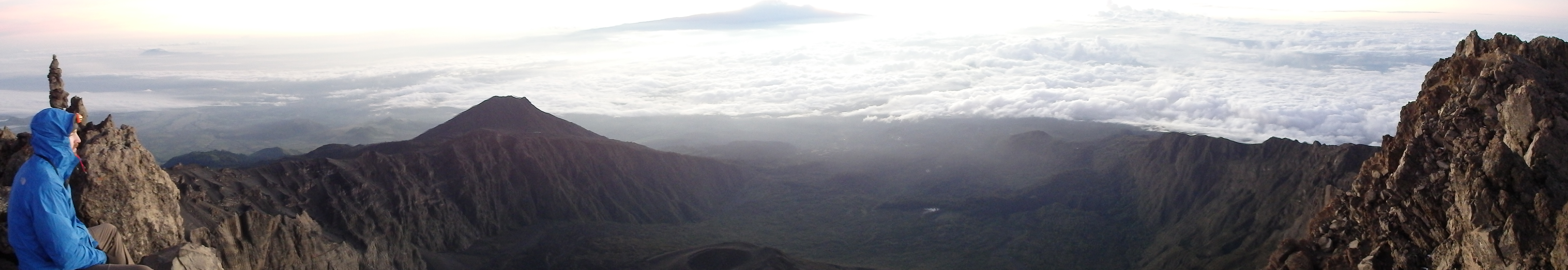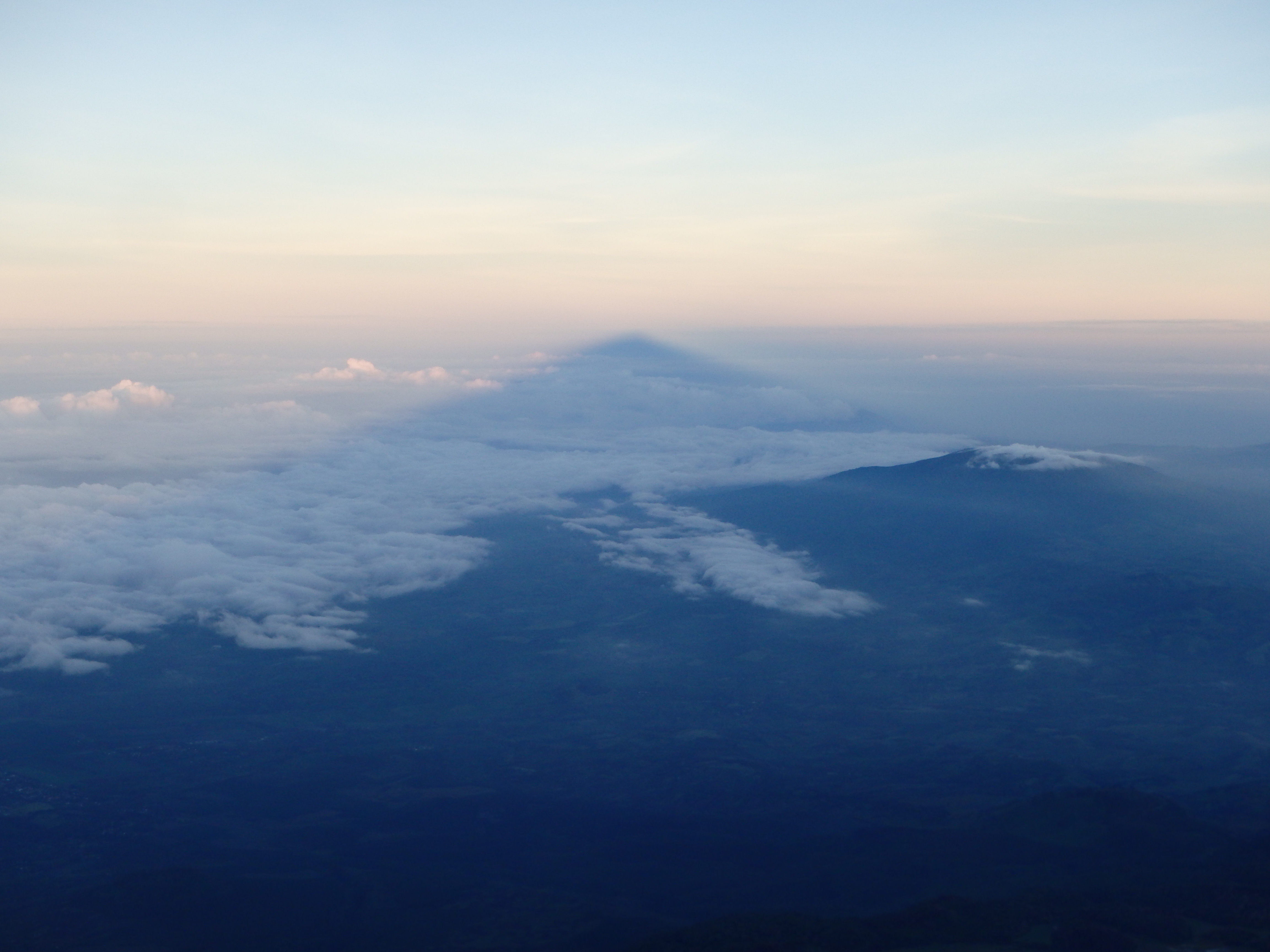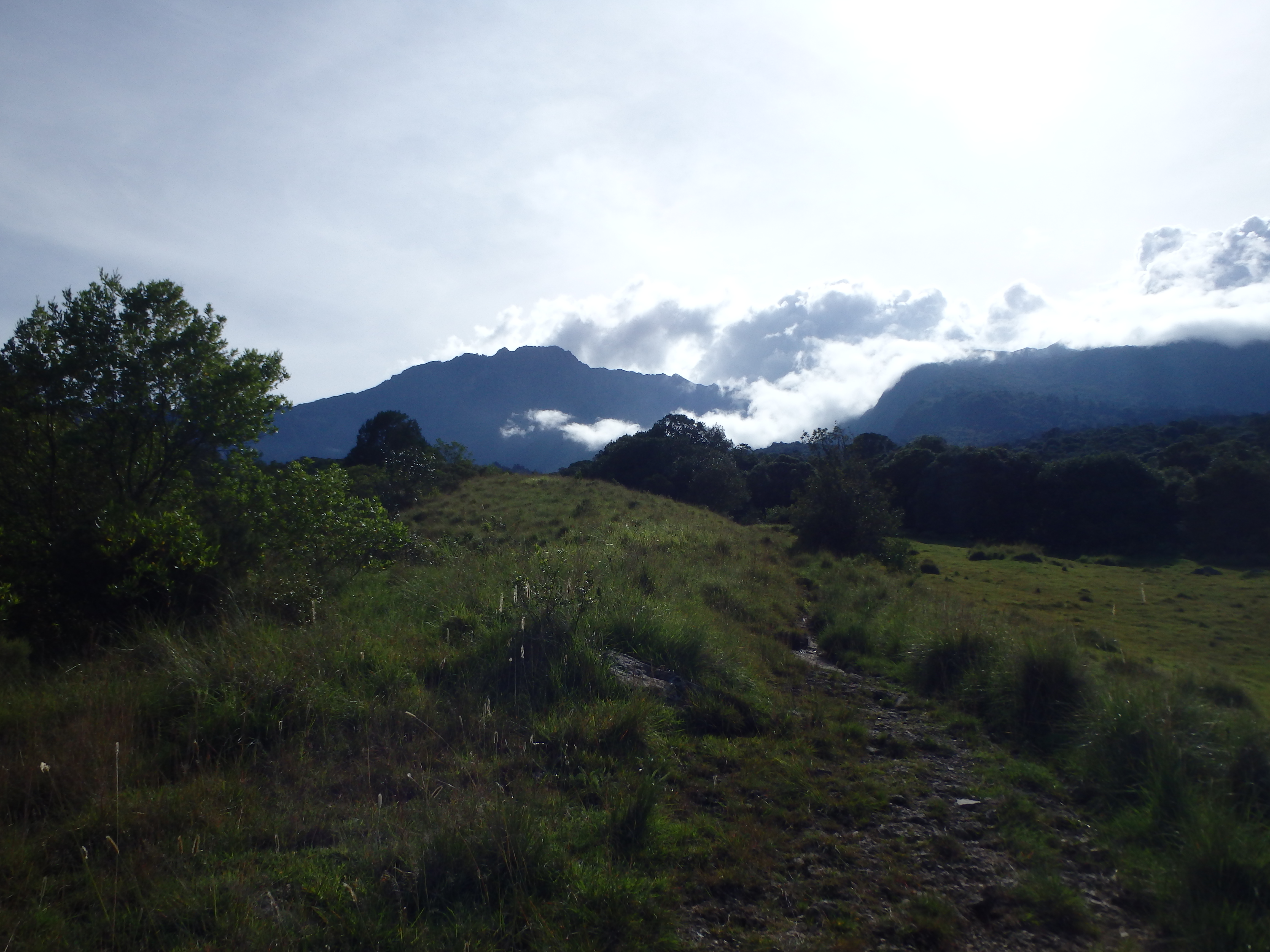The rain stopped in the midafternoon and we left for the small summit at 3 PM, the clouds breaking as we ascended. The trail was defined and well traveled, and a series of switchbacks quickly brought us up to the summit. Broken clouds surrounded the summit of Mount Meru hiding it from view, although we could spot parts of the rim through the clouds.