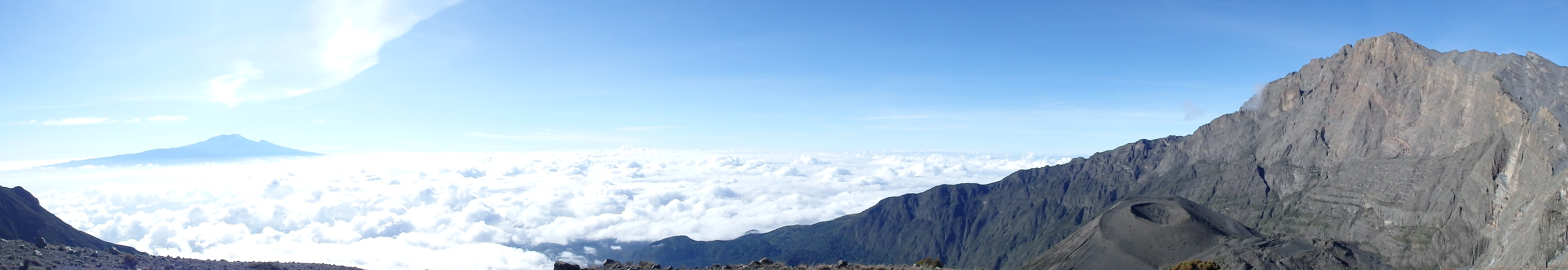 We spent a good 30 minutes at the summit, sharing champagne and taking pictures of the sunrise, Kilimanjaro, and Meru’s impressive summit crater and Cinder Cone. With the full mountain to descend that day, we left the summit down the class 2/3 slabs, the route being much more obvious in the daylight. With no risk of big game encounters at such high elevation, I broke off from the group on the descent giving me an opportunity to take more photos before the clouds rolled in.