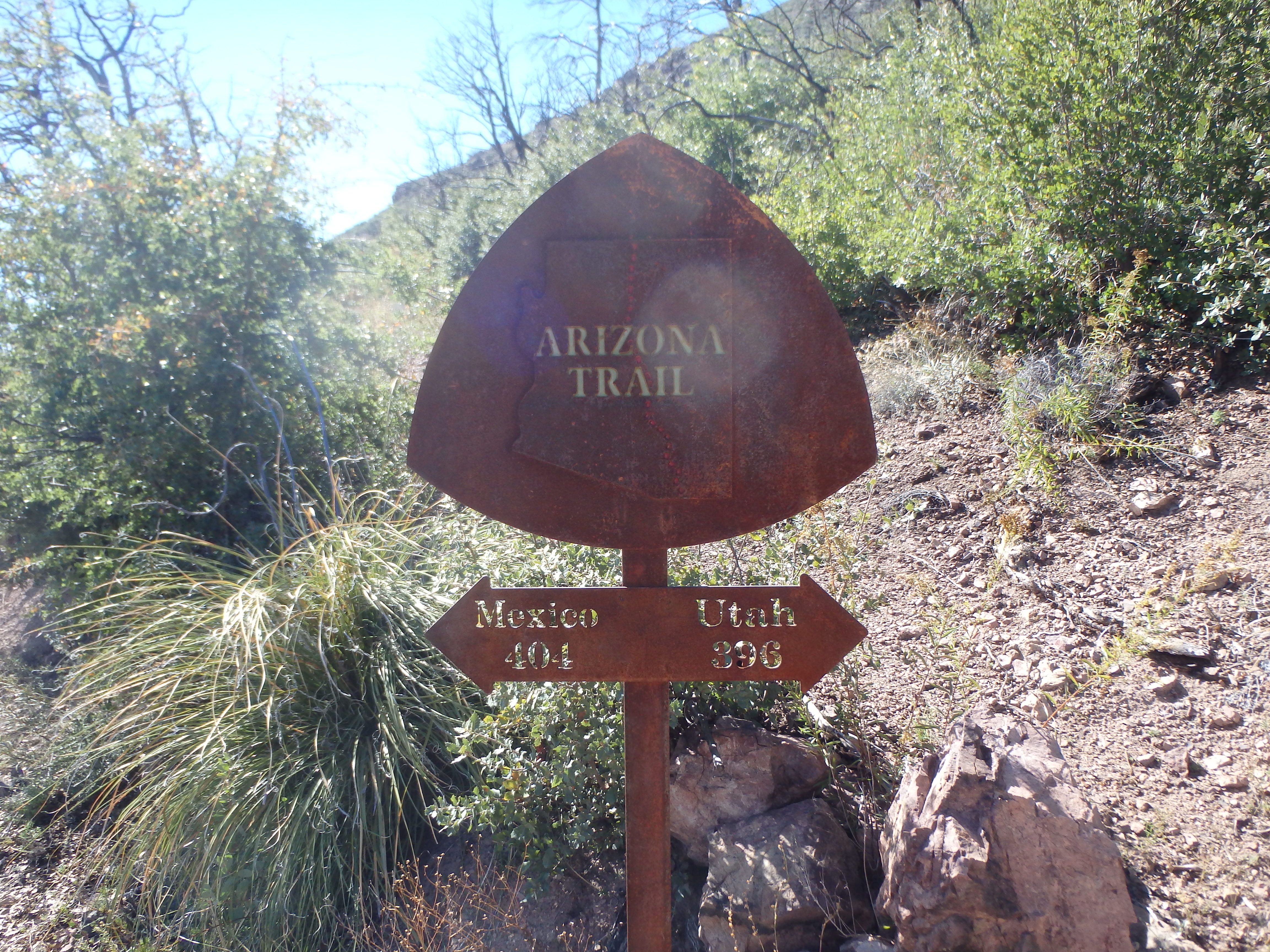 We set out from the recently updated trailhead and meandered around a few small hills before reaching a high saddle with Mount Peeley, with brushy slopes before us. Within a quarter mile, the trail meets the Arizona Trail, with a recently installed metal sign asking if you want to go to Mexico or Utah.