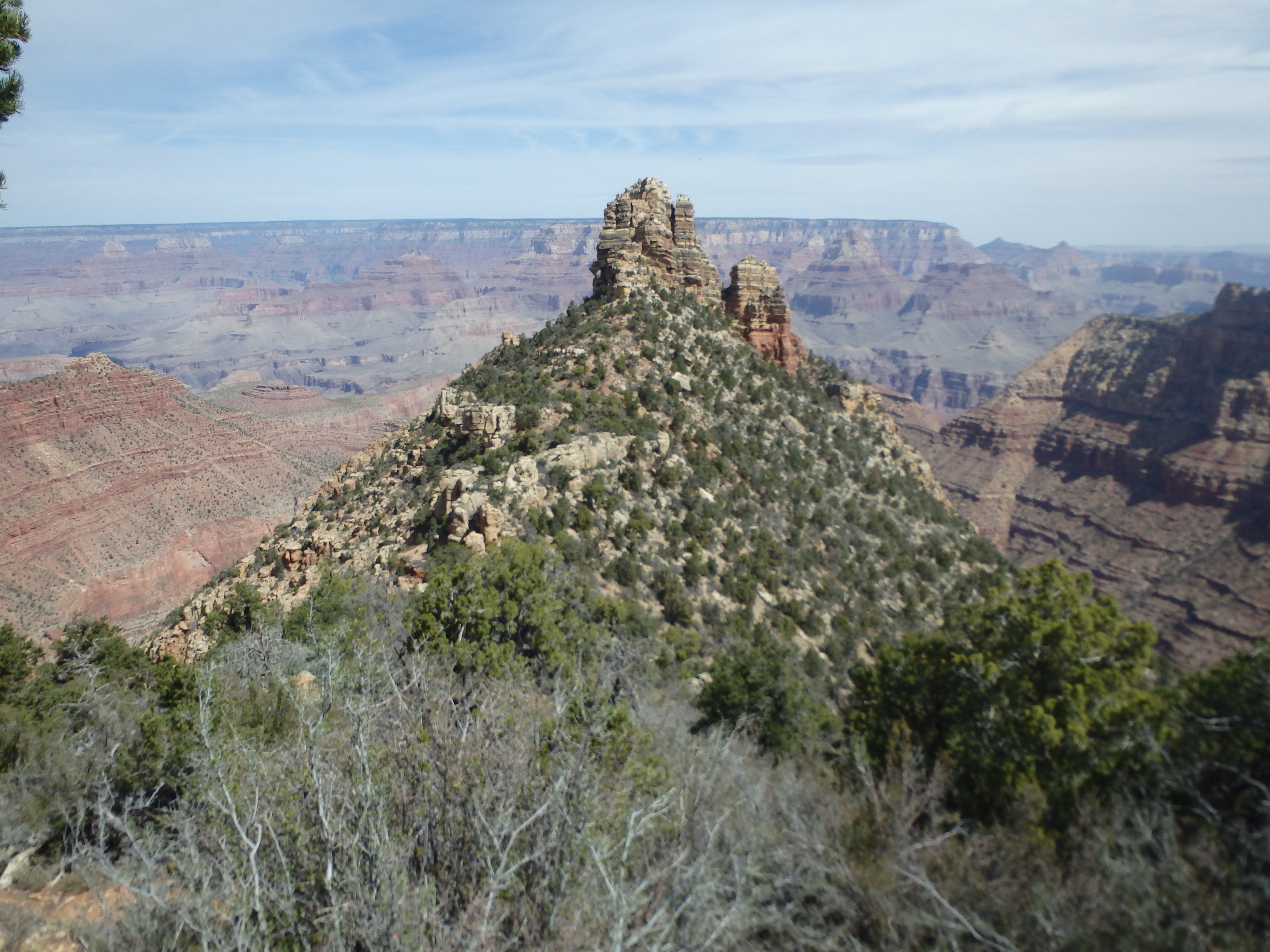 I had forgotten to pack my celebratory snacks for the summit, so I cut my time a bit short and started down the southwest side of the summit ledges, finding the crack that could be easily and safely stemmed back down to the alcove below and avoiding the exposed mantle. I squeezed back through tunnel and scrambled down the various ledges to the notch above the class 4 scree and chockstone. I tried to maintain traction by using rocks sticking out of the wall, then gingerly downclimbed back to the base. Back at the pine tree, I decided to cross over to the southeast side of the formation through the gap, finding the scrambling on that side to be a little easier than the southwest (although probably more confusing in terms of route finding). I briefly searched around the base for some Native American ruins reported to be in the area, but I had no luck in locating them, gave up, and started up the steep ridgeline back to the rim. I was happy with how quickly I was able to ascend the ridge, the elevation gain on the return almost trivial compared to most other GC summits. Once on the rim, I made a beeline for my car, made much easier with a little help from my GPS to try and keep on course. Hitting my car, I headed east for a snack at Desert View Tower before driving back to Phoenix.
