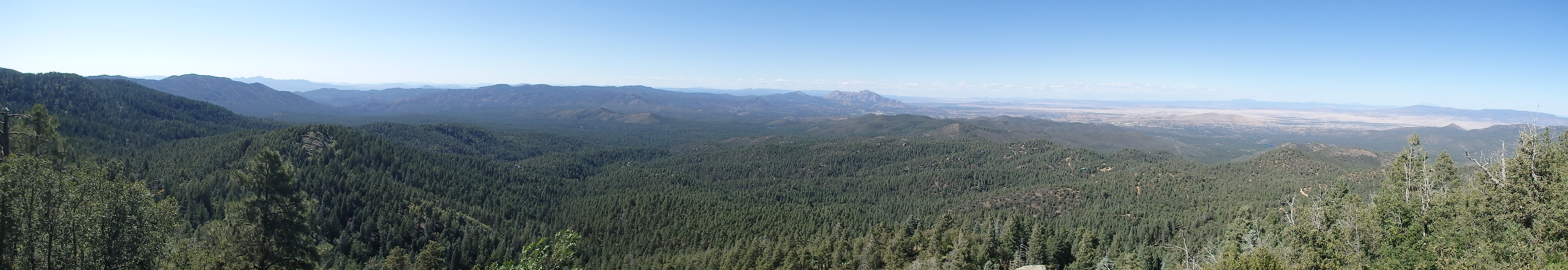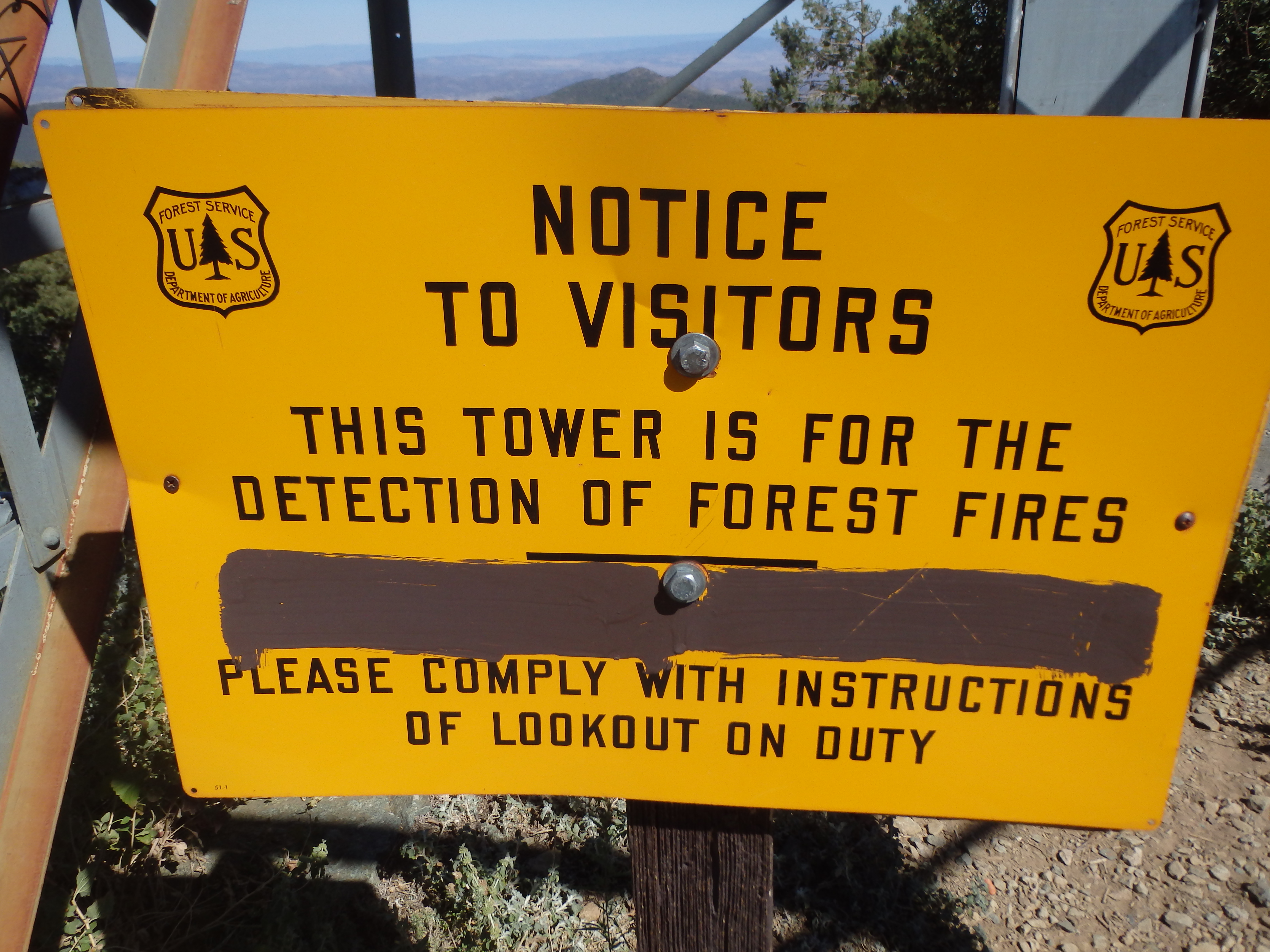 The trail slowly switched up through the pines at a very reasonable grade, the only negative being the ever present smell of horse manure from the handful of parties we passed along route. We could never really see the summit at any point along the hike as the trail wove up and around various ridgeline and false summits. Closer to the summit, there were a series of switchbacks with wooden pine railings. It took about 2 hours to reach the fire road that leads to the lookout tower, with a number of groups on horseback stopped at some picnic tables with a hitching post for horses. From there, it was only about another quarter mile to the summit and Spruce Mountain Lookout Tower. The lookout volunteer called down below for us to come on up, and we headed up the series of stairs to the single roomed tower. The volunteer was very friendly, showing us how to use the fire sight and pointing out various landmarks around the Prescott Valley and Bradshaw Mountains. While the views were incredible, I was most jealous of her vintage Smokey the Bear blanket….