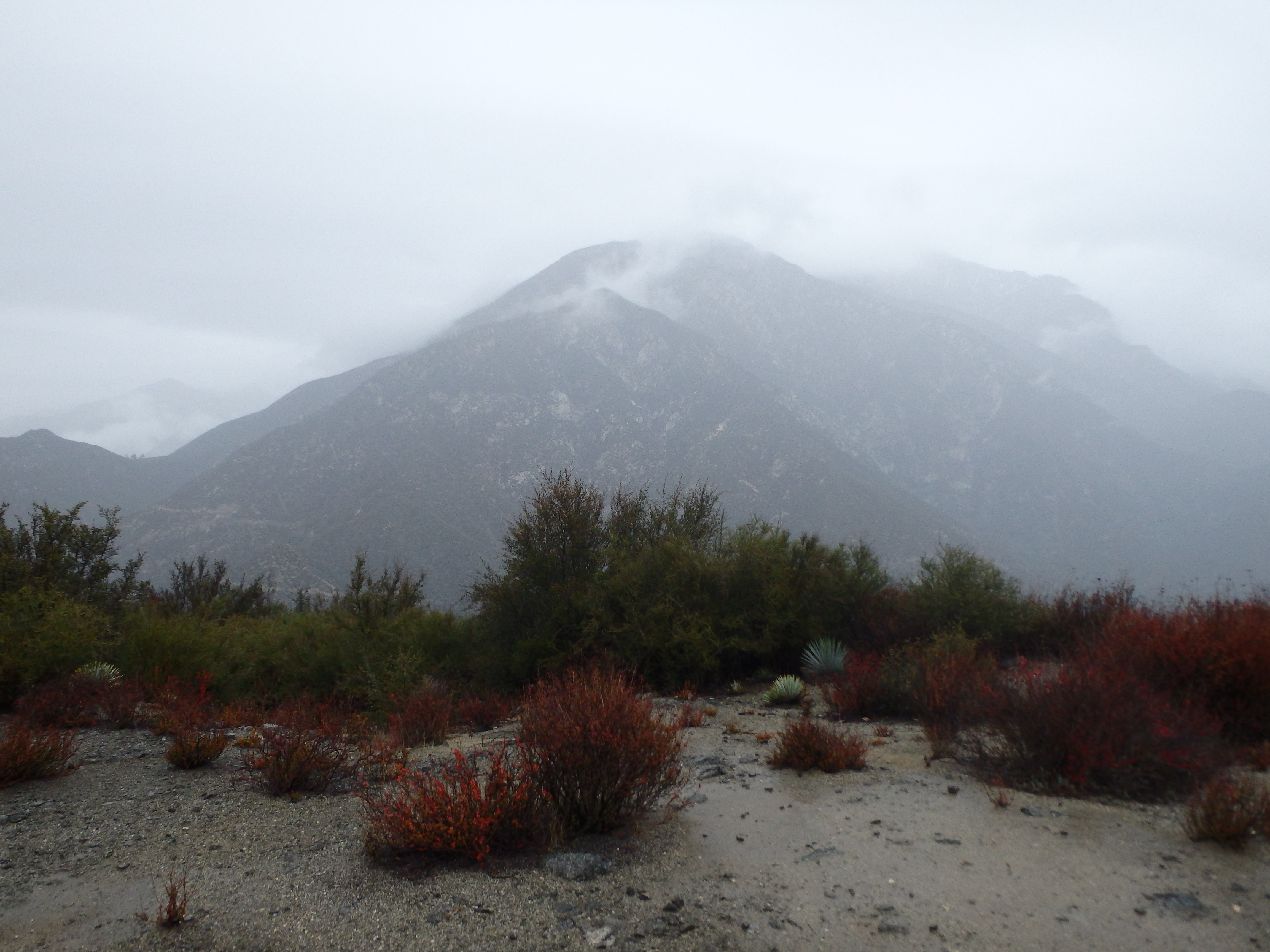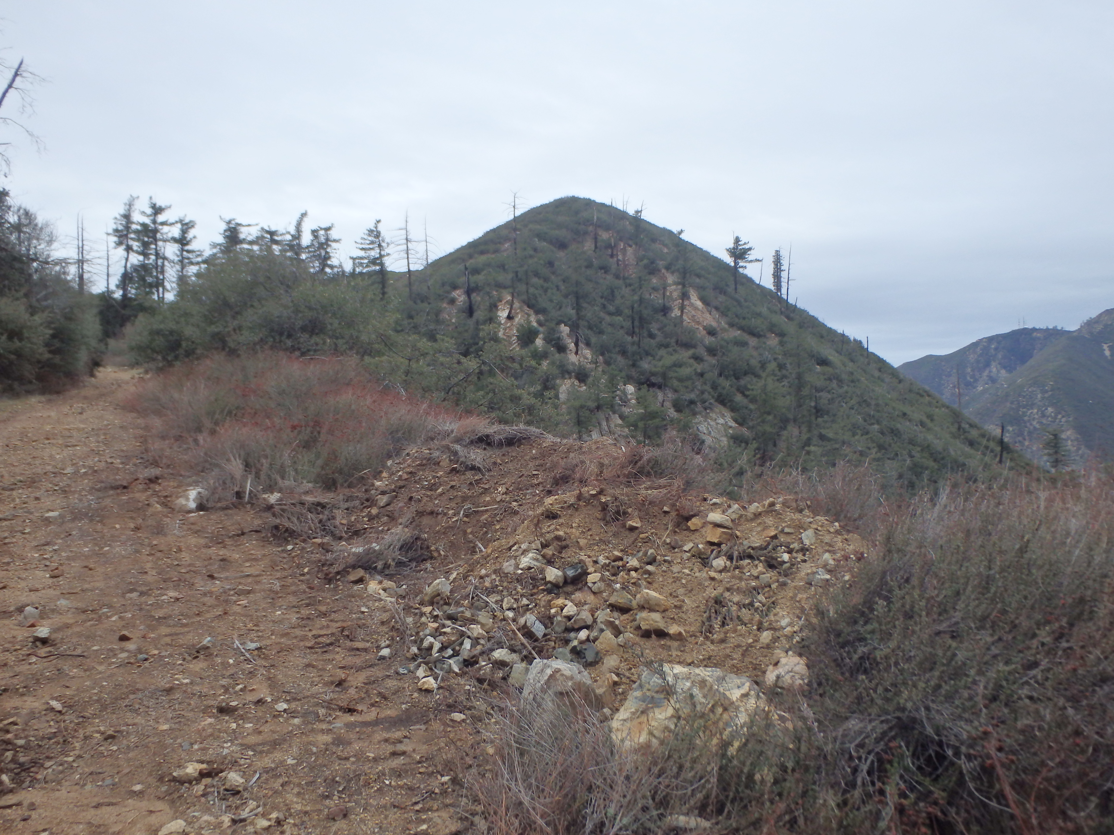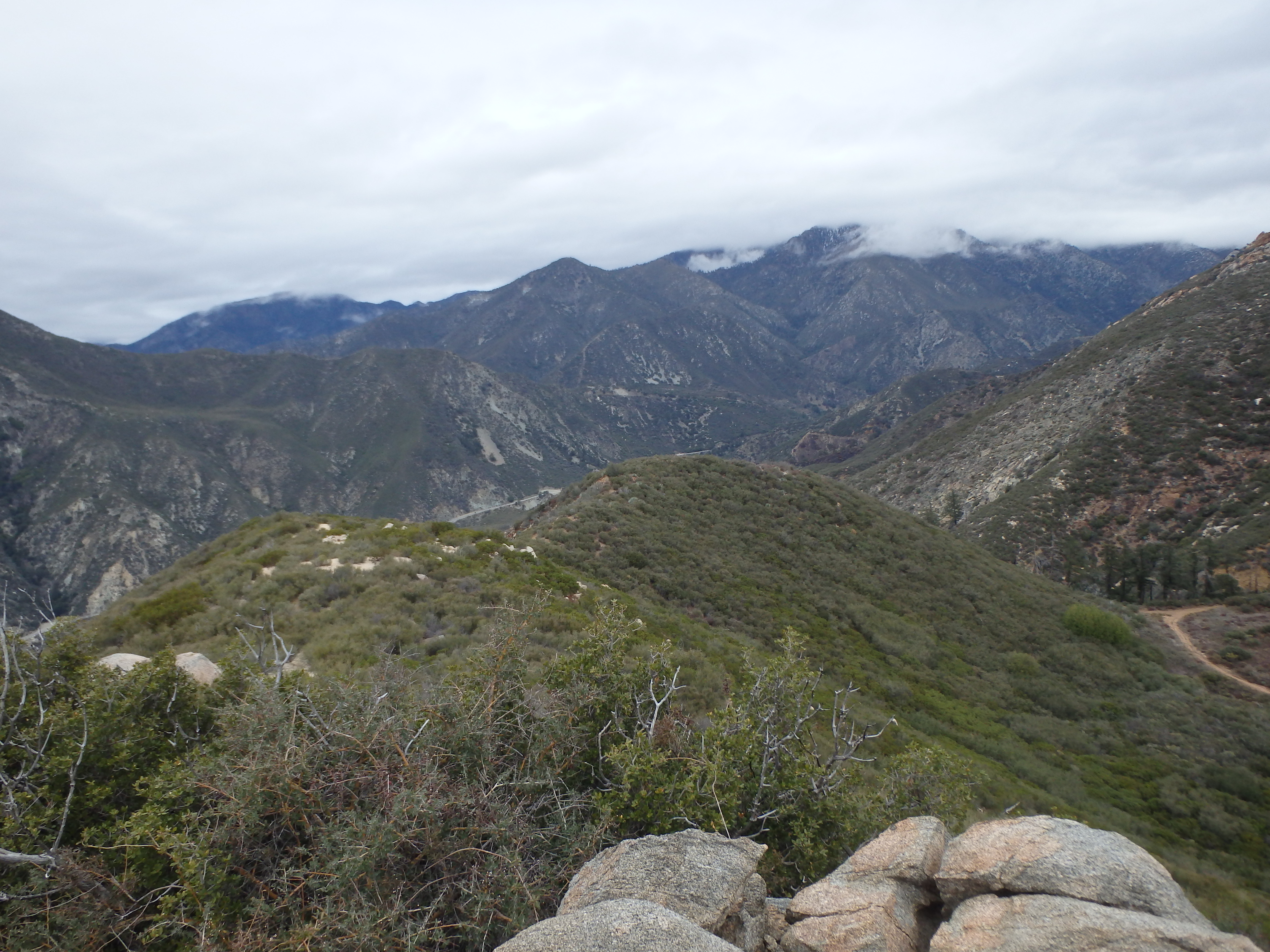 The area seemed to have recently had a controlled burn with patchy areas of soot and charred branches quite close to the homes. Passing through a locked gate just past the cabins, the road left the oak and pine filled canyon to more open scrub and brush typical of the lower elevation San Gabriels. I didn’t have the views of Baldy I was hoping for, socked in by clouds from the incoming storm. But I could see snow across the slopes of Lookout Mountain (which just south of Baldy), and seemed to have found the sweet spot where I was above the smog of the valley below but below the cold and high clouds above. Rounding out of another canyon, I briefly considered tagging nearby Spring Hill sitting just west of the road. But there was no defined route with thick Buckthorn, and after the recent rough descent through Trail Canyon, I wasn’t looking to add on an unpleasant side trip.