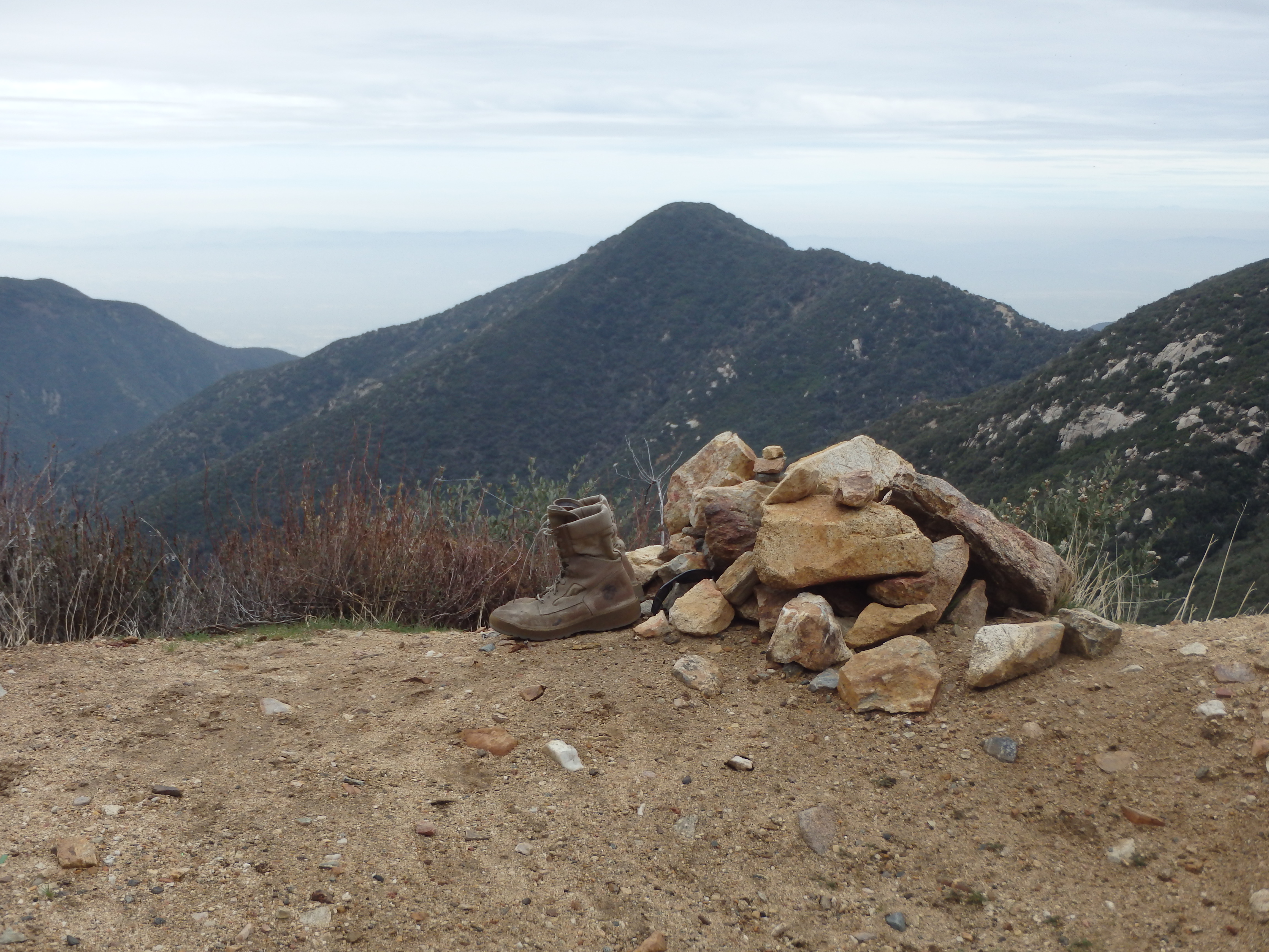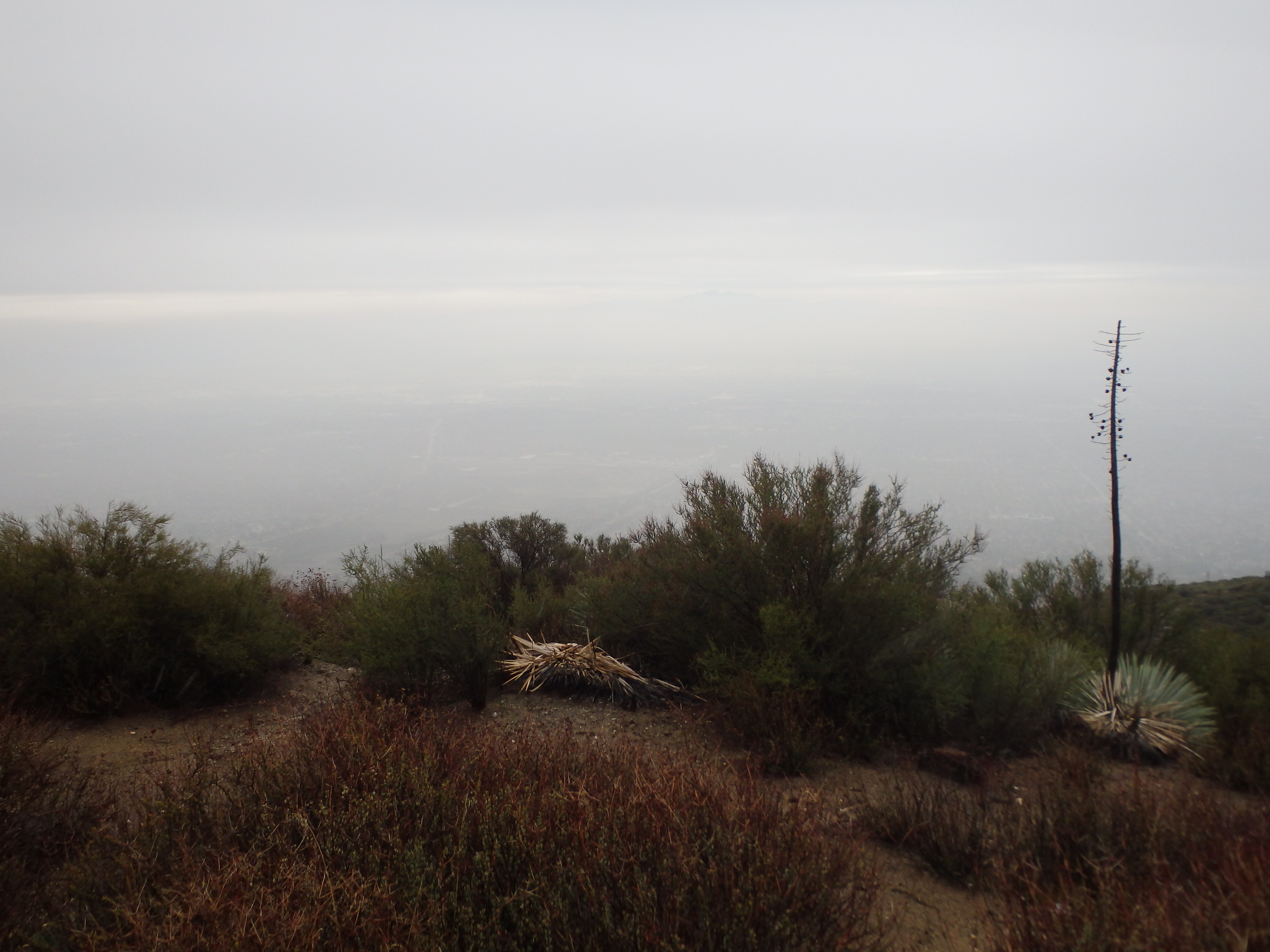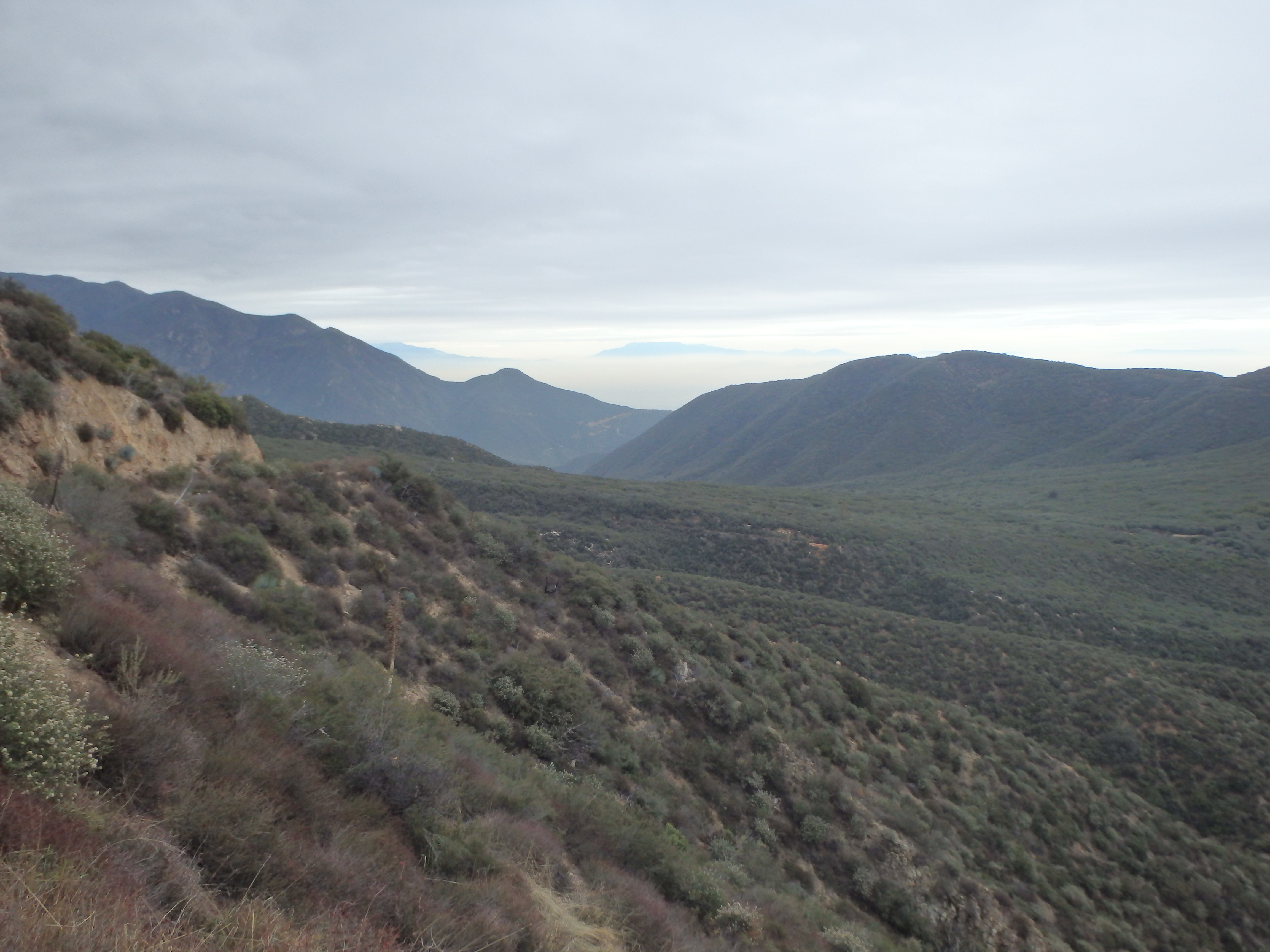 The area seemed to have recently had a controlled burn with patchy areas of soot and charred branches quite close to the homes. Passing through a locked gate just past the cabins, the road left the oak and pine filled canyon to more open scrub and brush typical of the lower elevation San Gabriels. I didn’t have the views of Baldy I was hoping for, socked in by clouds from the incoming storm. But I could see snow across the slopes of Lookout Mountain (which just south of Baldy), and seemed to have found the sweet spot where I was above the smog of the valley below but below the cold and high clouds above. Rounding out of another canyon, I briefly considered tagging nearby Spring Hill sitting just west of the road. But there was no defined route with thick Buckthorn, and after the recent rough descent through Trail Canyon, I wasn’t looking to add on an unpleasant side trip.