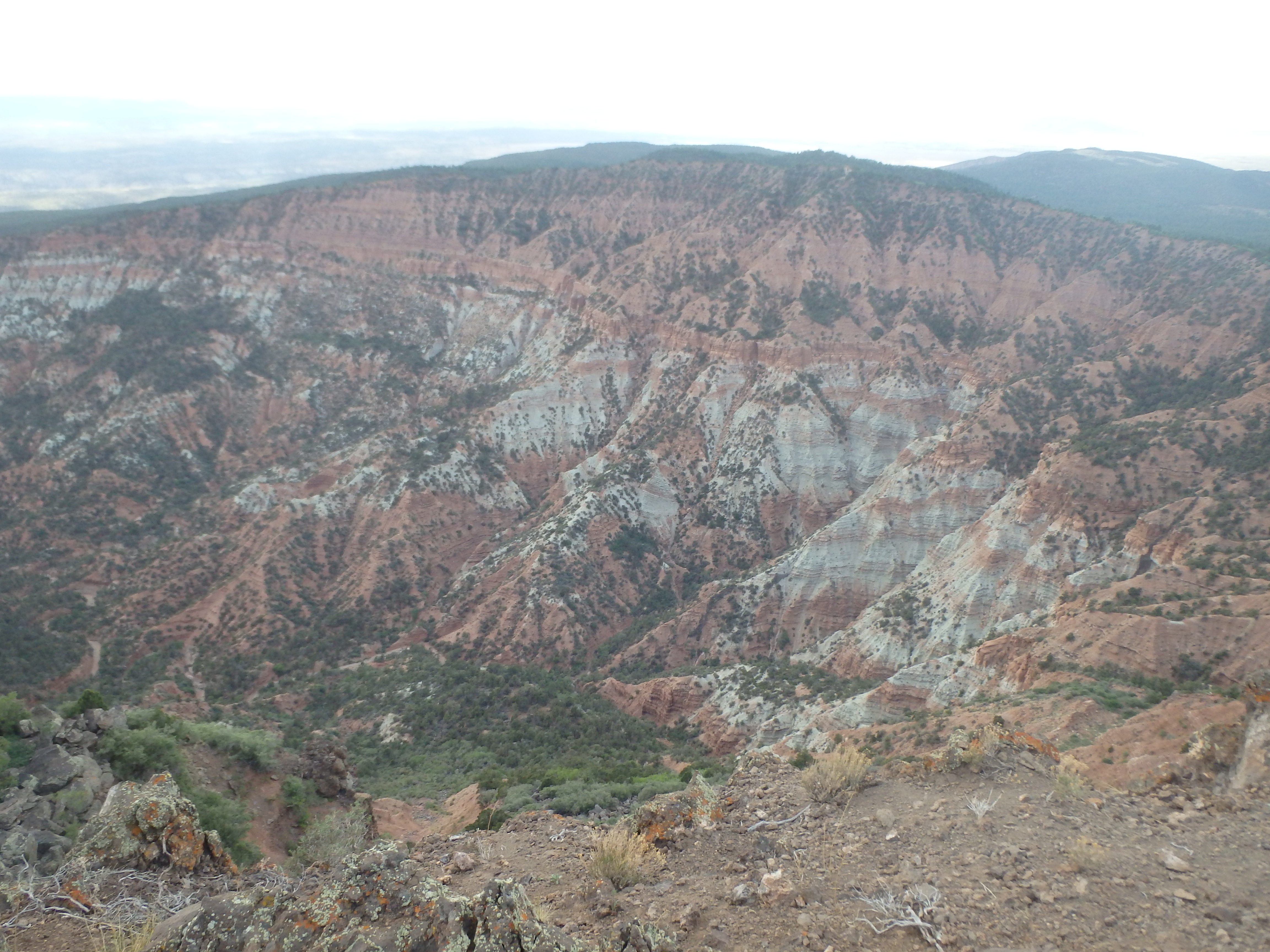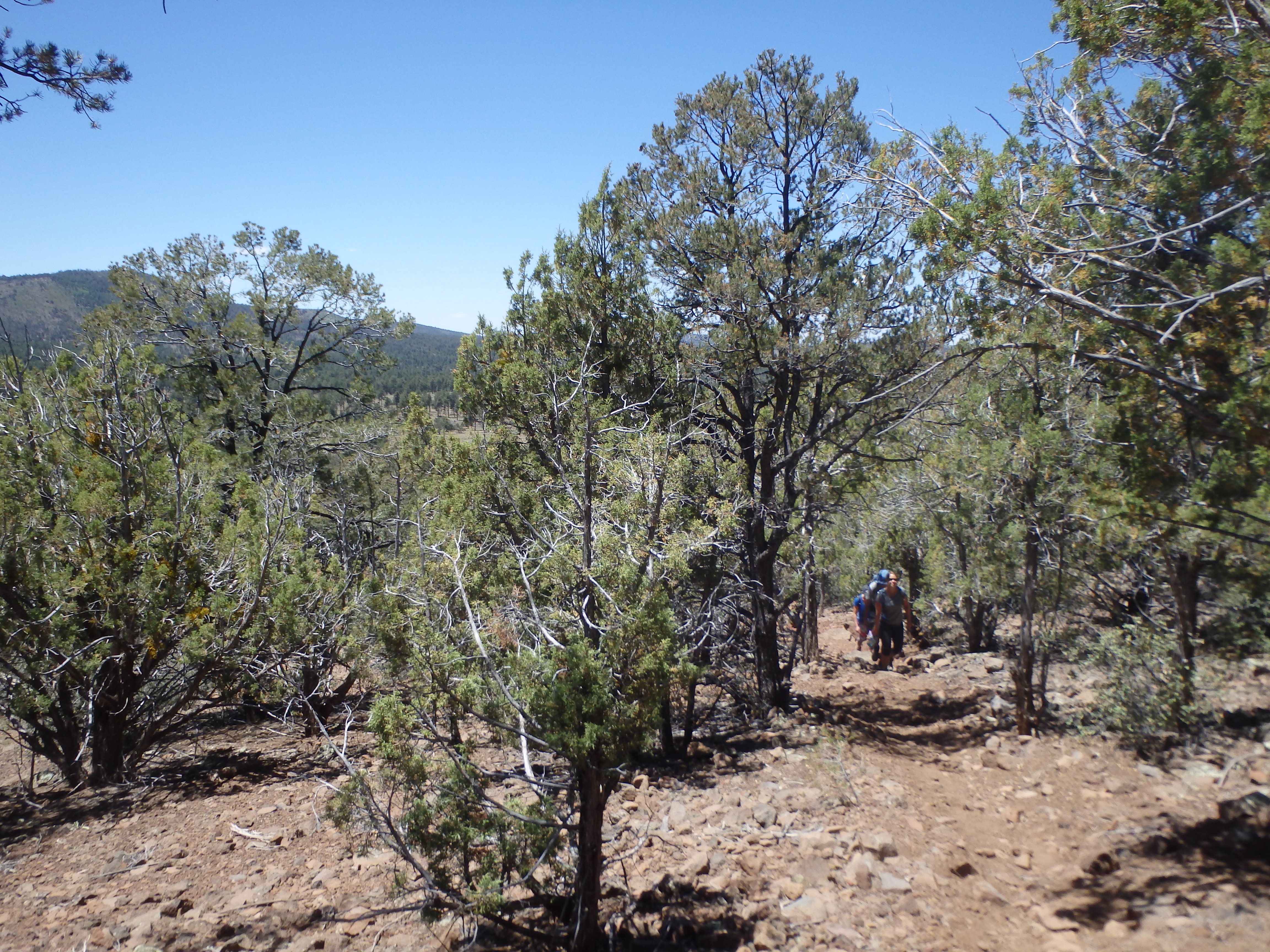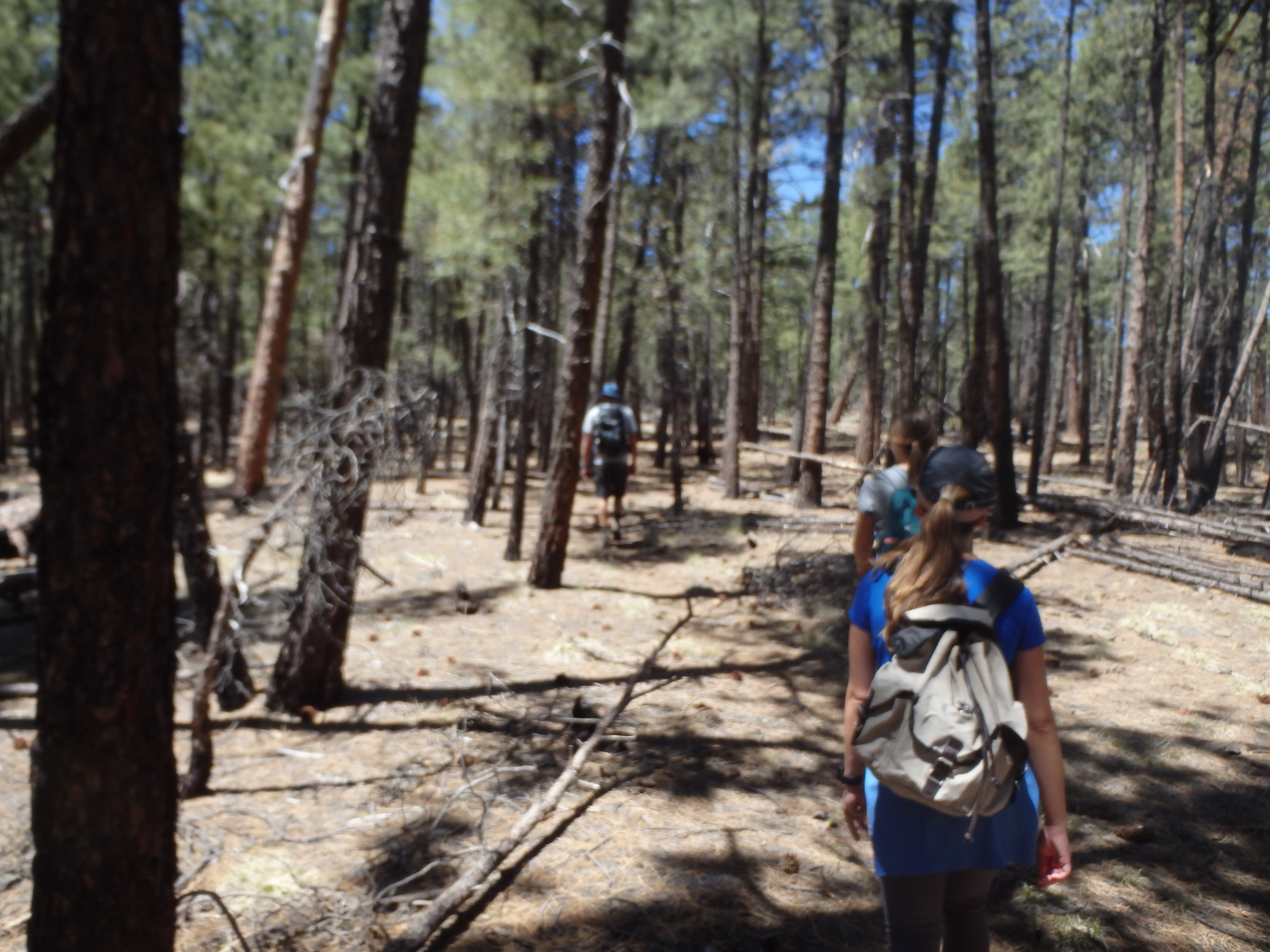 After dusting off our packs from the dirt road and signing into the trail register (with an obnoxious rant about the “lazy” USFS ranger for not clearing the trail) we started up the trail. I had assured everyone that the grade of the climb was reasonable, only about 1300′ over 2.5 miles. We would quickly find that most of that elevation was in the first mile, and combined with the altitude and lack of acclimatization, the majority of the group was cursing me as we climbed up through the forest with expanding views across the valley towards Mount Logan and the San Francisco Peaks hazy in the distance.