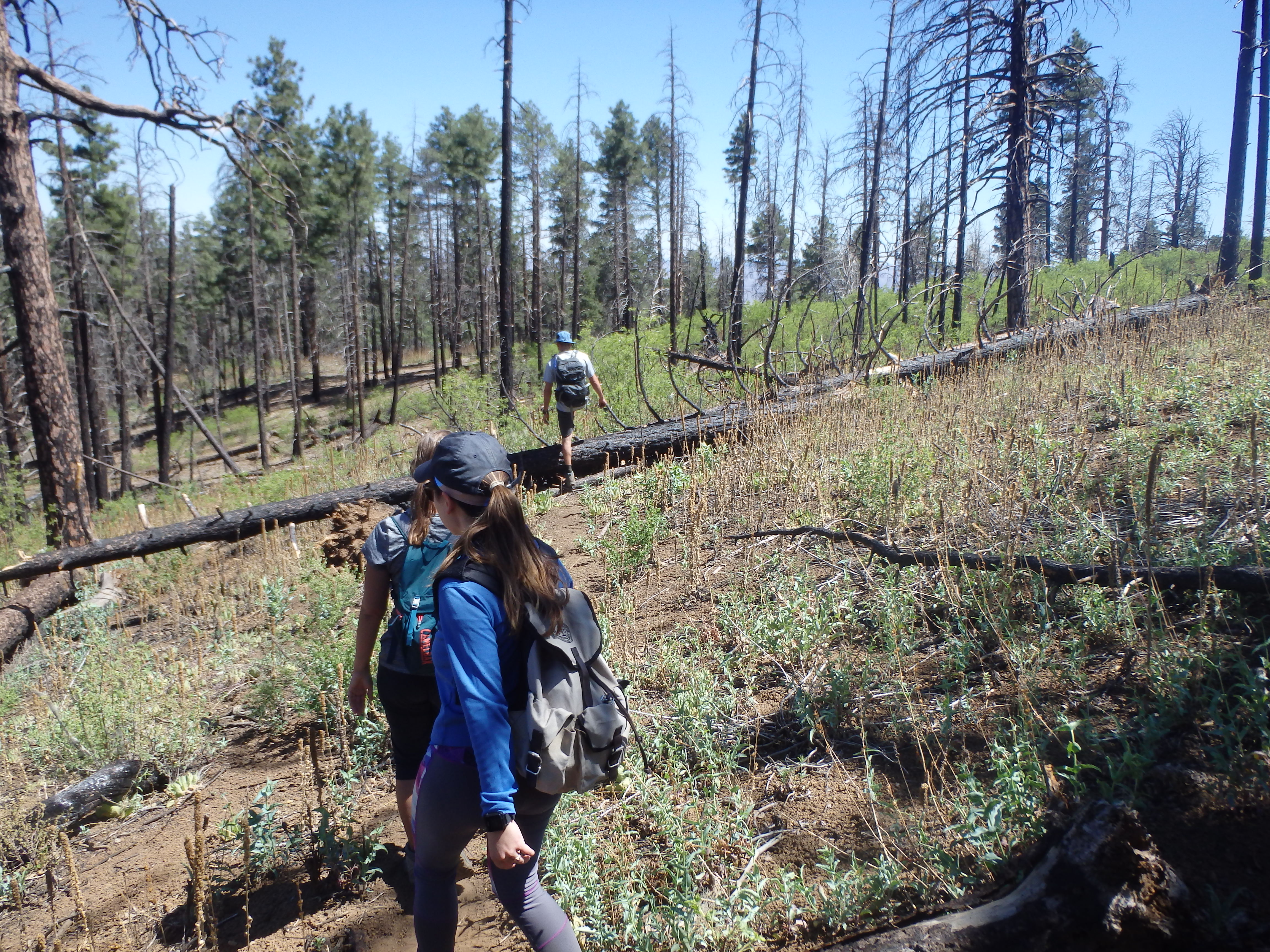 The grade started to ease about 1.5 miles in as we entered a burn area and had to scramble over a handleful of down trees that had drawn the ire of the trail register signee, making passage more difficult for his horses (insert eye roll).