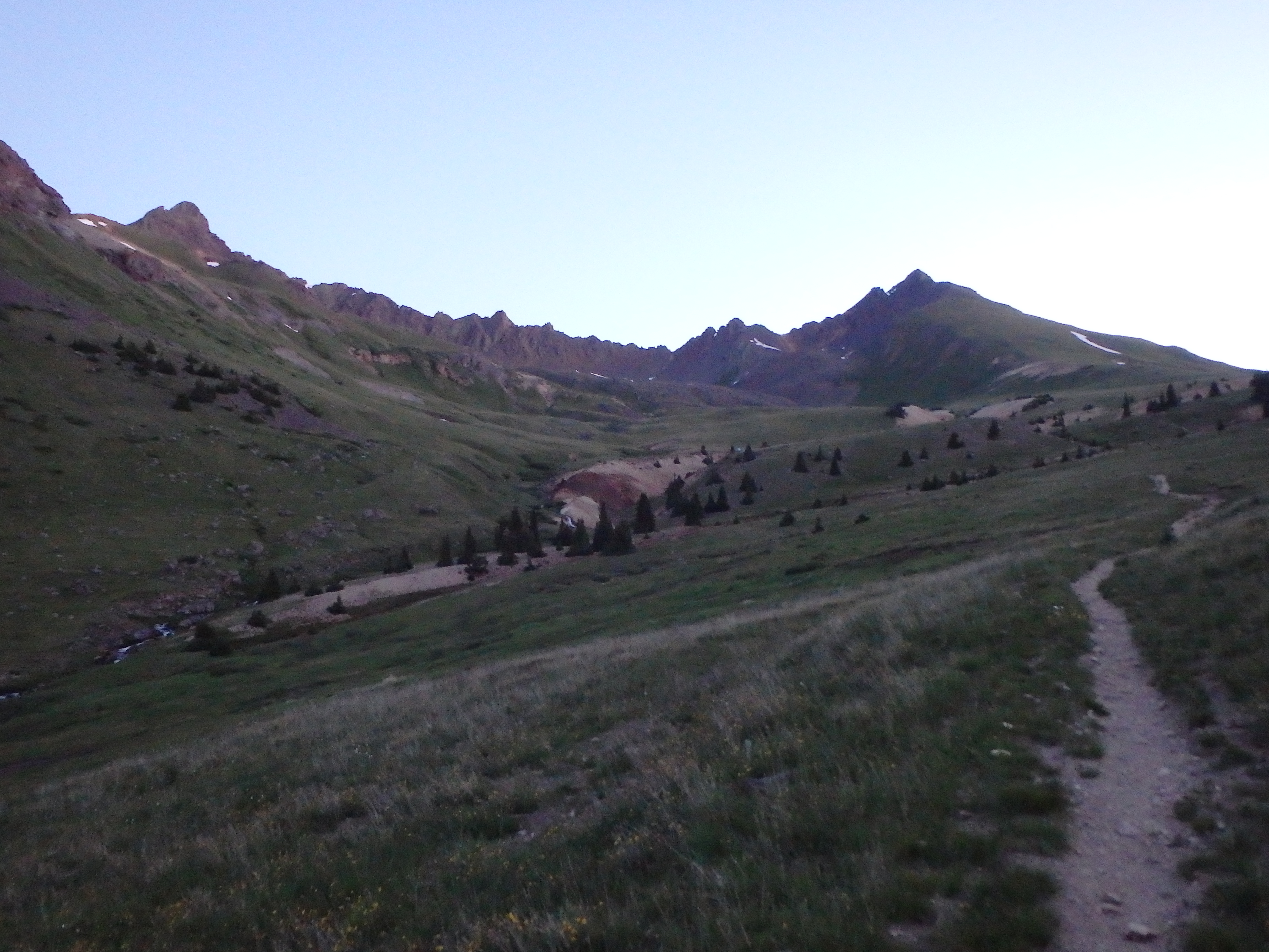 Uncompahgre is the highest mountain in the San Juans, and 6th highest in all of Colorado. It’s north face is a wall of dramatic cliffs, but the east and south slopes are more gentle with tiers of rock, likened to a melting layer cake. The easiest route to the summit is rated class II, but is virtually class I, following a trail all the way to the summit. Wetterhorn, a shorter nearby 14er to the west, is genuine class III by it’s easiest route. Despite their proximity, they are typically climbed separately given the 2,000’+ drop and miles of high plateau in between. But with a bit of stamina and a blessing from the weather gods, both can be done (+/- the Matterhorn) in a long day. Thanks to the “Heat Dome” sitting over Colorado, it seemed as if the weather wouldn’t be an issue. But with a bad ankle, stamina would be the true test for the day. I made it up the not too horrible 4WD road to Matterhorn Creek Trailhead, stopping 0.7 miles from the official start where the road gets significantly worse. I slept at a pulloff on the dirt road, and woke up at 4AM to give myself time for the long day. I left camp around 4:30 and hiked the 0.7 miles to the main trailhead in about 15 minutes. I hiked in darkness along the well traveled trail, and with my head down, blew past the first signed junction where I needed to turn right. The trail I was following along Matterhorn Creek petered out and I checked my GPS, quickly realizing my mistake. So I set off cross country straight up slope to regain the trail- not the best start to what was promising to be a long day. Back on the trail, things went a bit smoother, and as the sun rose over Wetterhorn and Matterhorn, I had my first views of the peaks for the day.
