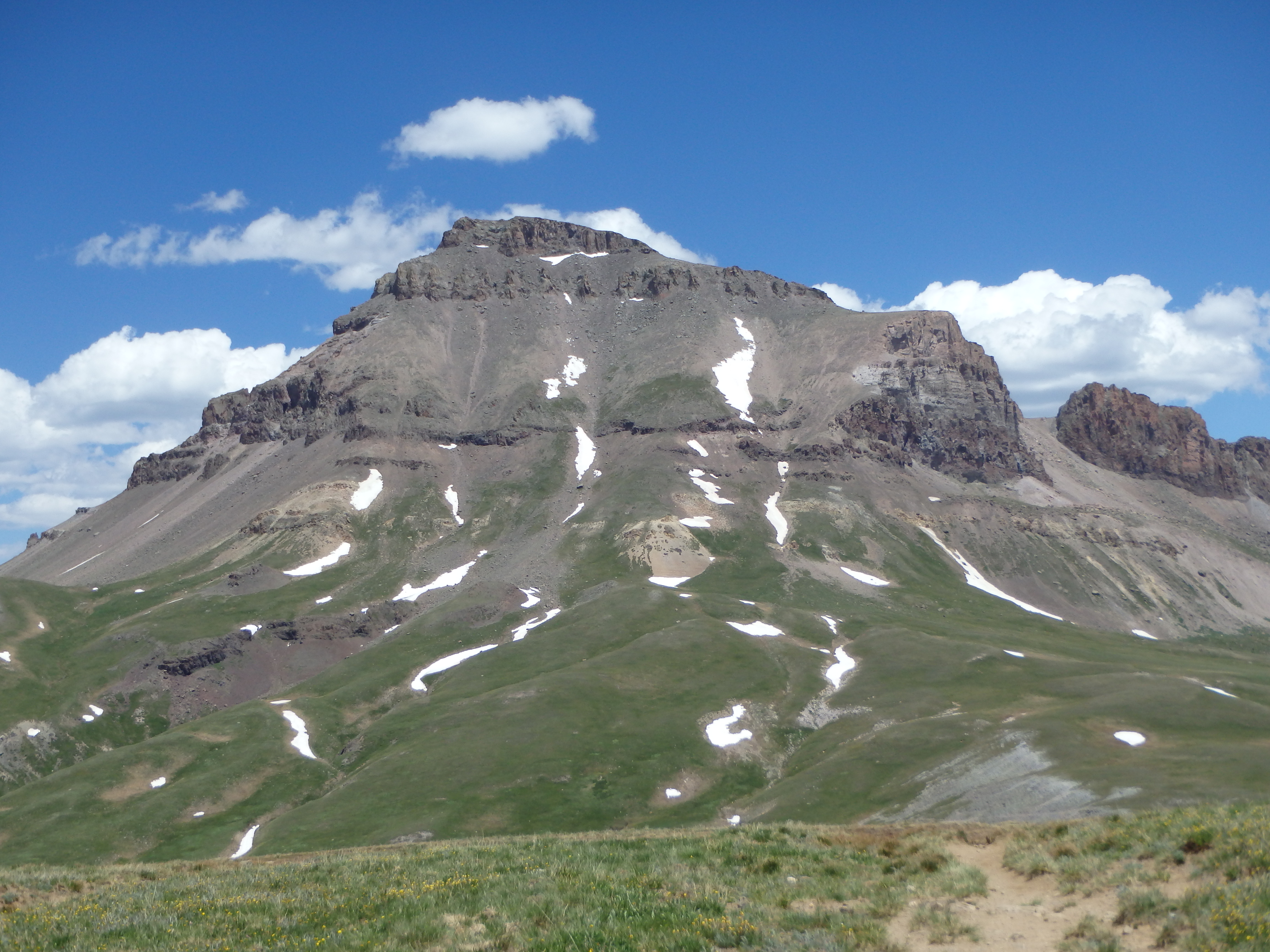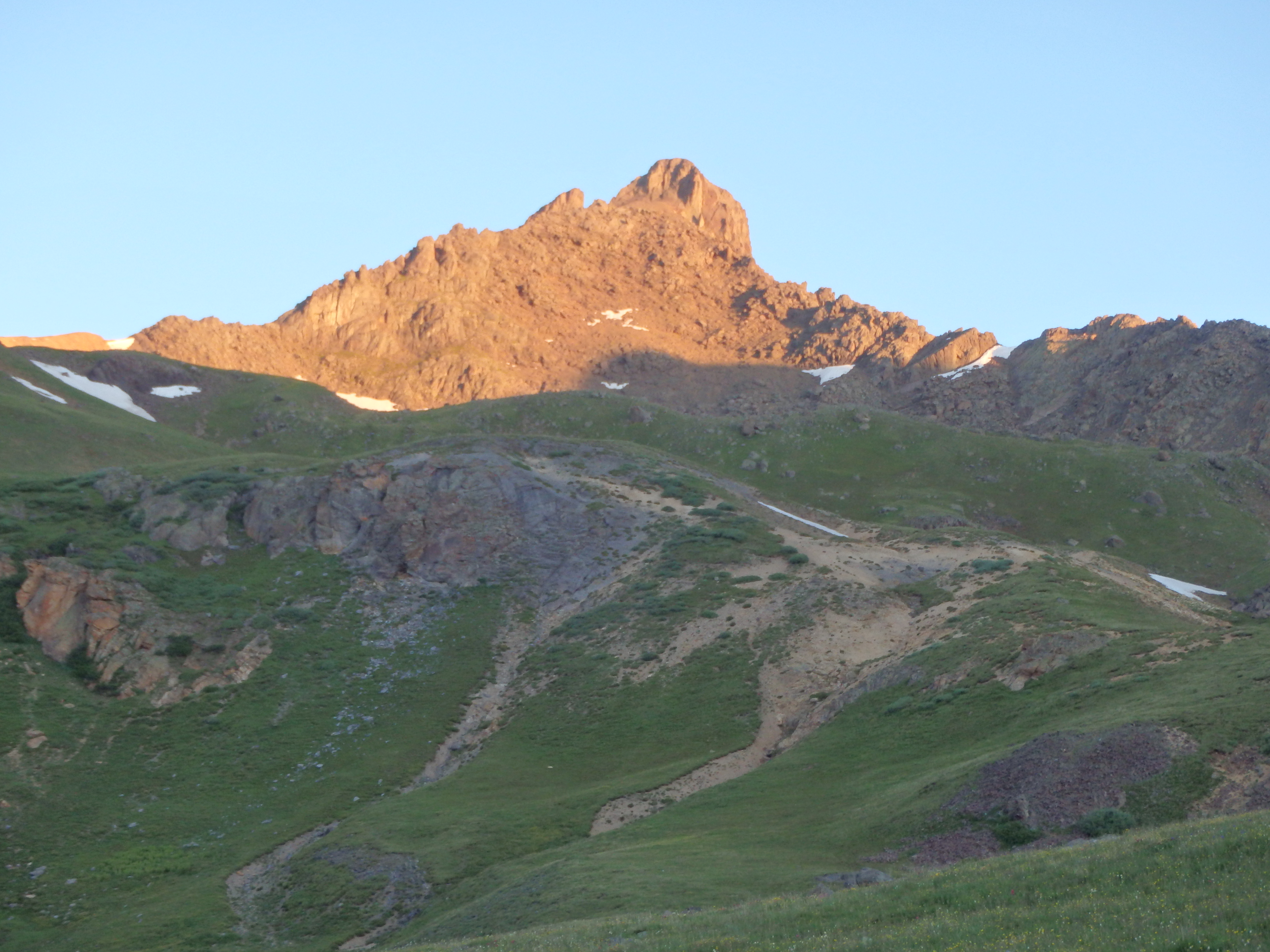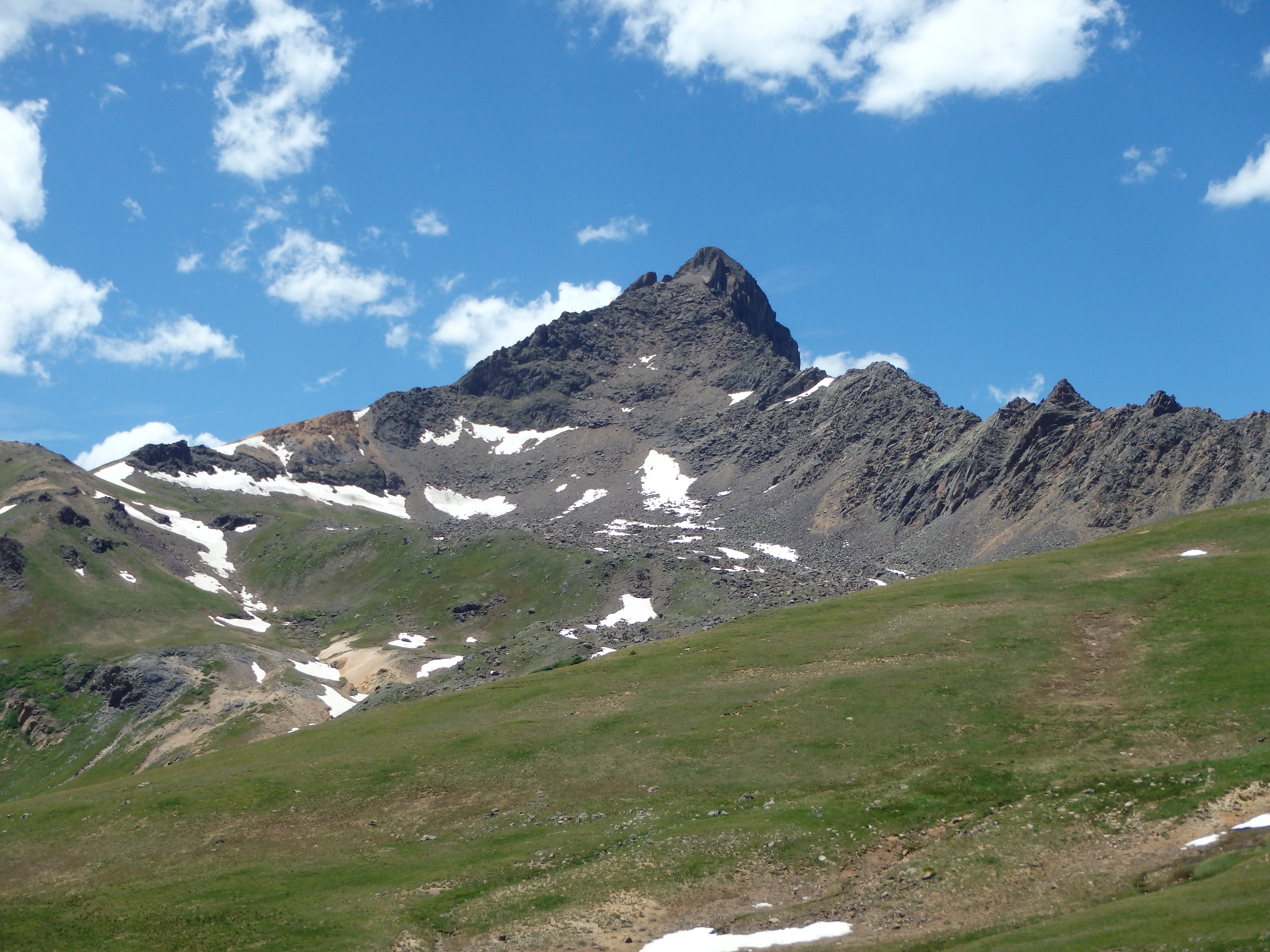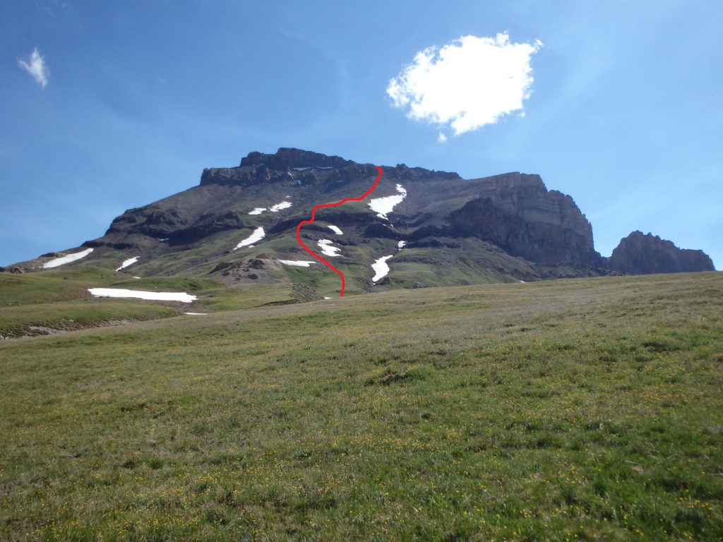 The broad, gentle southern ridge of Matterhorn was still blocking Uncompahgre, so I couldn’t see just how far it actually still was until I crested over the grassy slopes to find it towering in the distance. What made matters somewhat worse was the dire warning I had read online to not attempt the West Face directly without snow cover. Climbers cried “loose rock!” all over the message boards, and with a bad ankle already, I felt I had no choice but to end-around to the normal route, adding on many miles each way. But as I reached the pass, I encountered a group of climber doing the reverse of my day- Uncompahgre in the morning, Wetterhorn in the afternoon.They told me they had climbed the West Face, and didn’t find it bad at all. Sensing my skepticism, they pointed out the swath of grass that reached nearly to the summit cliffs. How could it be that loose if there’s grass growing nearly to the top, they pointed out. That was enough to sell me. I continued along the grassy path towards Uncompahgre, cutting cross country at a stream, and aiming for the shallow rib that would take me up the center gully of the West Face.