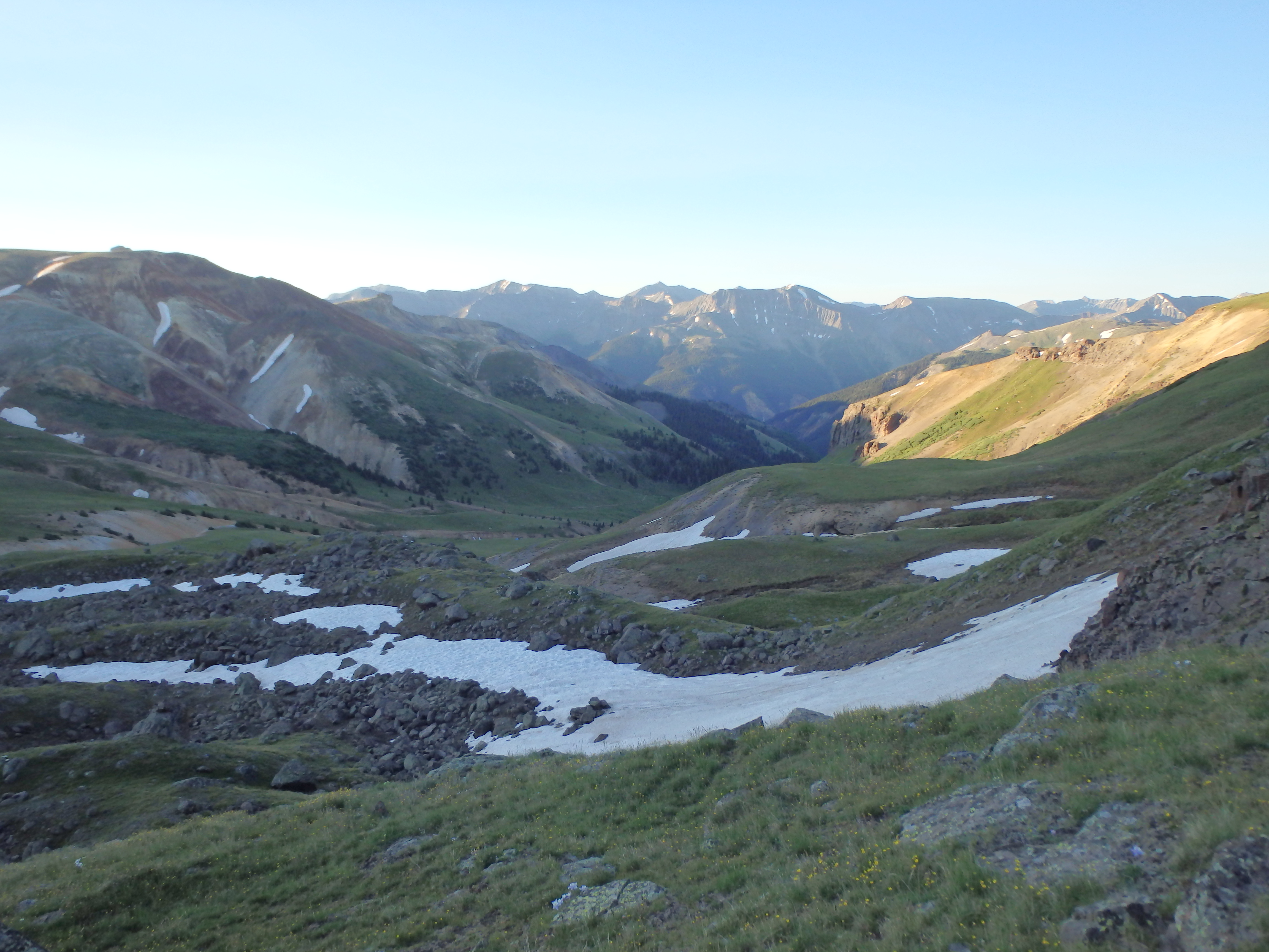 From there I switched back to the larger boulders and talus to the north side of the gully until I reached the grass, with smooth sailing from there. As I hit the meadows again, the weather and haze actually improved, and as I hiked across the grassy, wildflower covered saddle between the two 14ers, I felt pretty accomplished. I rejoined the trail near Matterhorn Creek and followed the trail, hitting the junction I missed in the dark, and down the dry and dusty trail back to the trailhead. From there, I drove back to Lake City for a well earned beer and giant plate of ribs at Southern Vittles.
