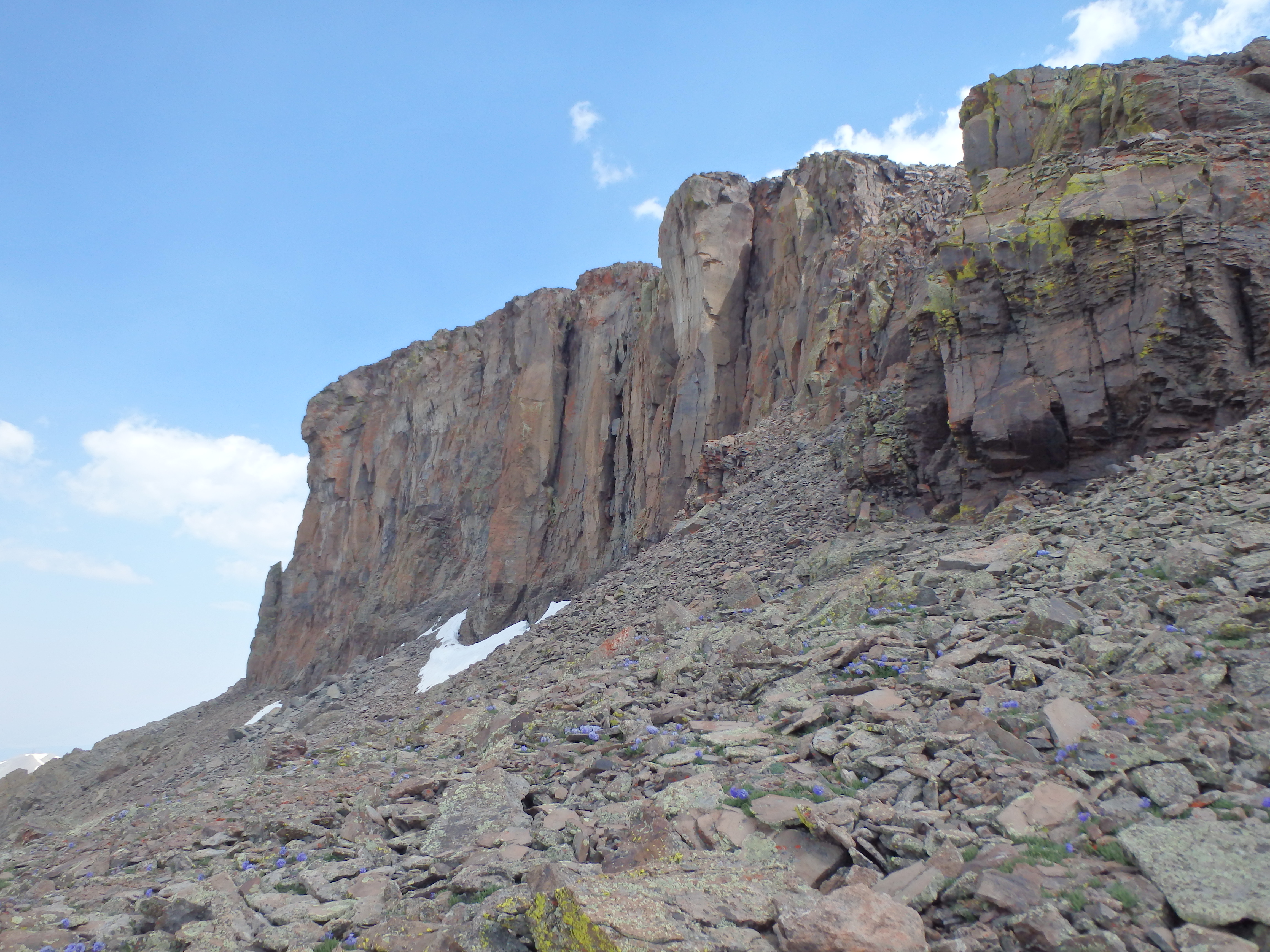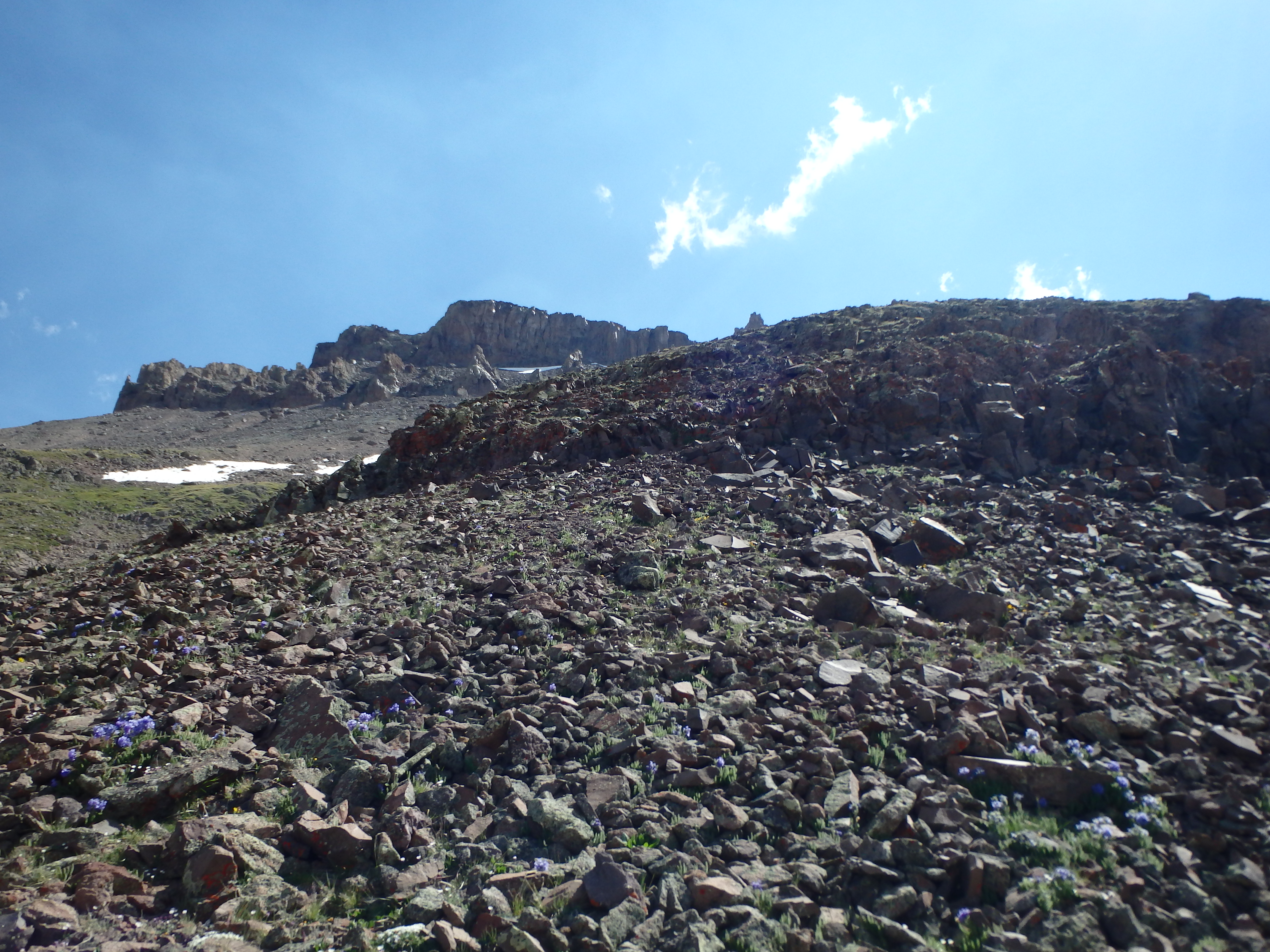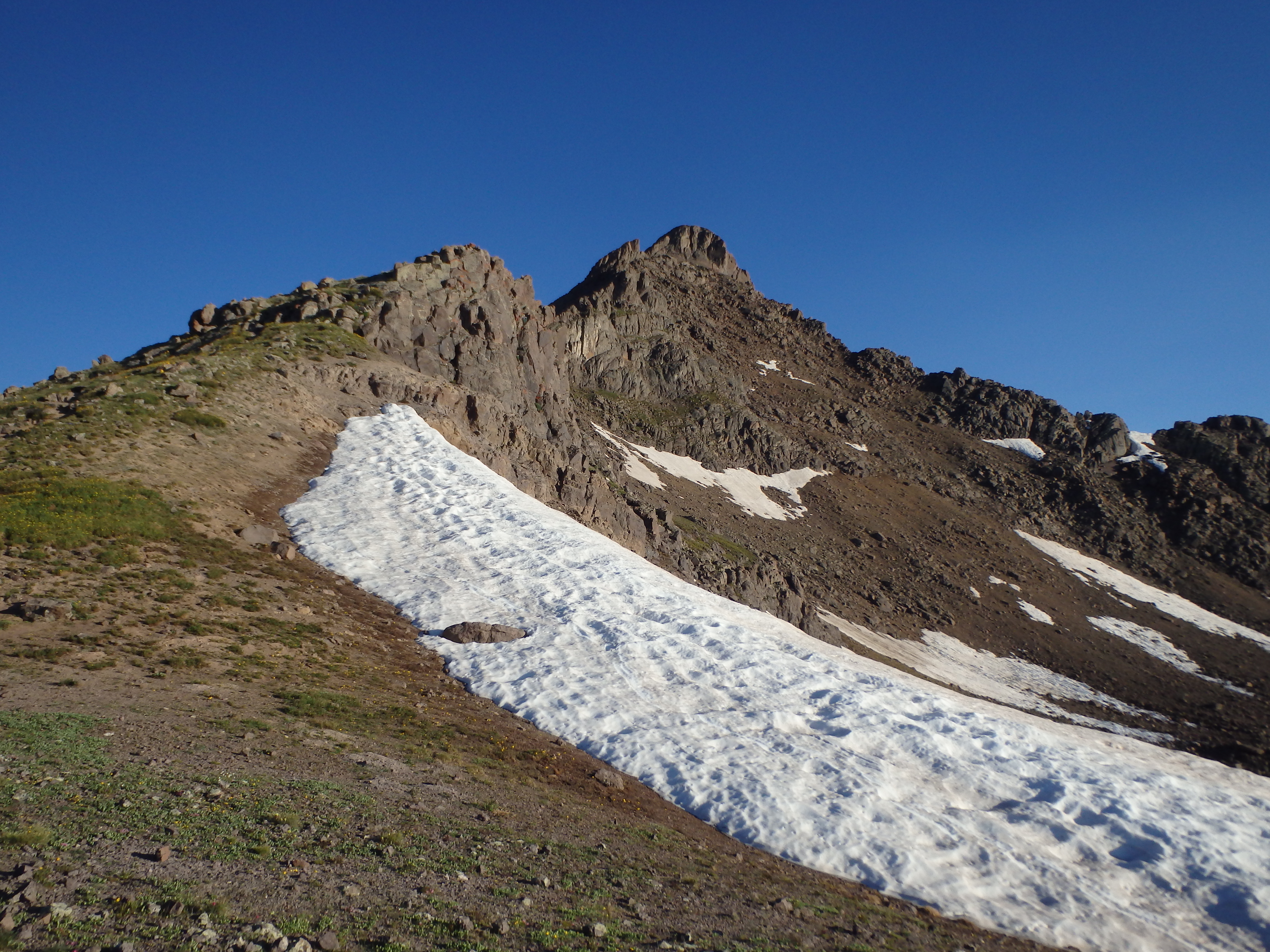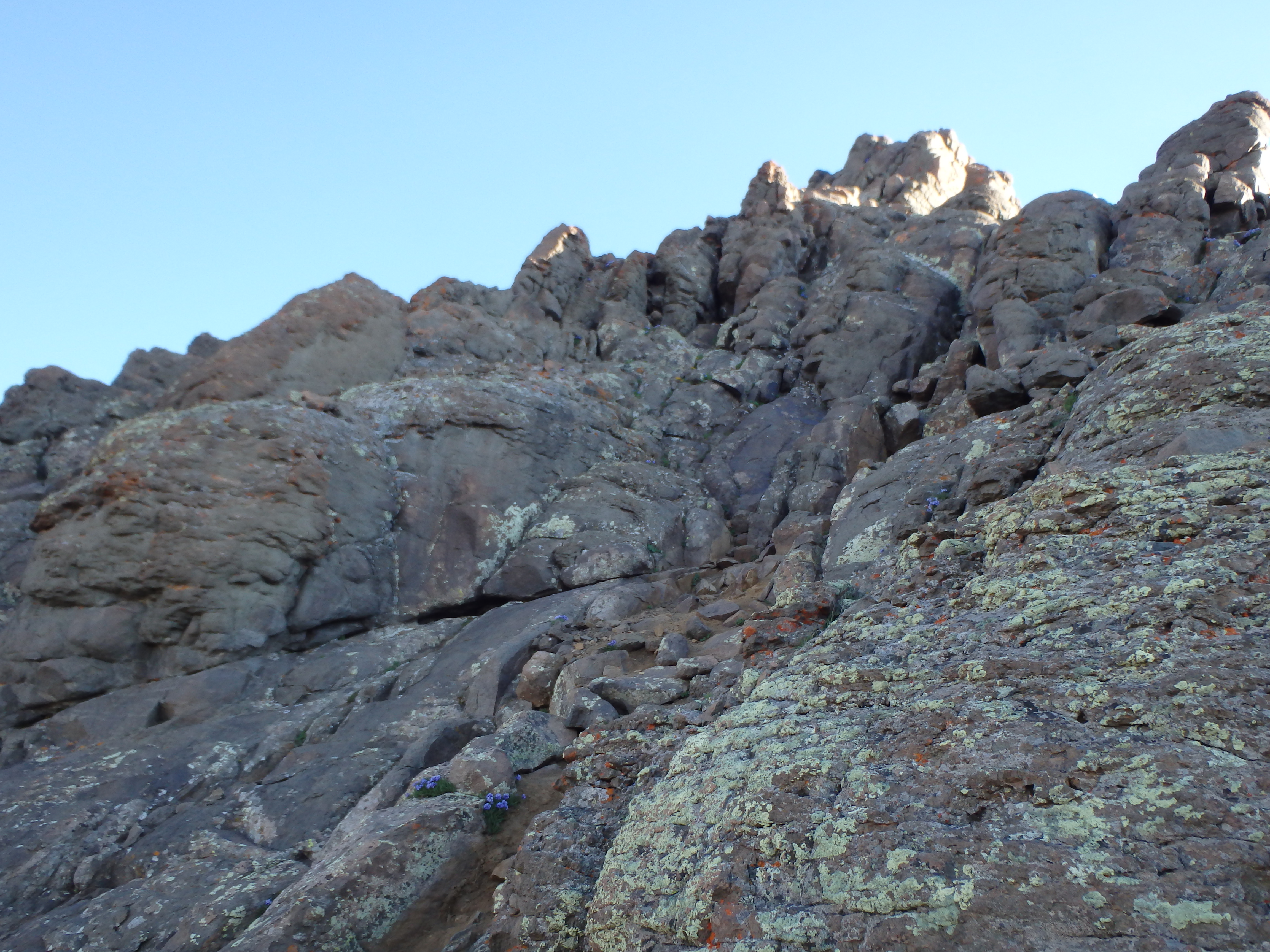 I continued along the trail up and over a small snow patch to the ridgeline and the start of the route up the SE. The summit was less than 1000′ above but the route at this point was difficult to see beyond the lower slopes. I continued along the well worn trail directly up the ridgeline, weaving around some of the smaller boulders before finally getting to the fun stuff another 200′ higher. The route here transitioned to bonafide class II ledges, some gritty and loose, as I worked my way slowly up the ridge towards a steep ridge dropping off to the left.