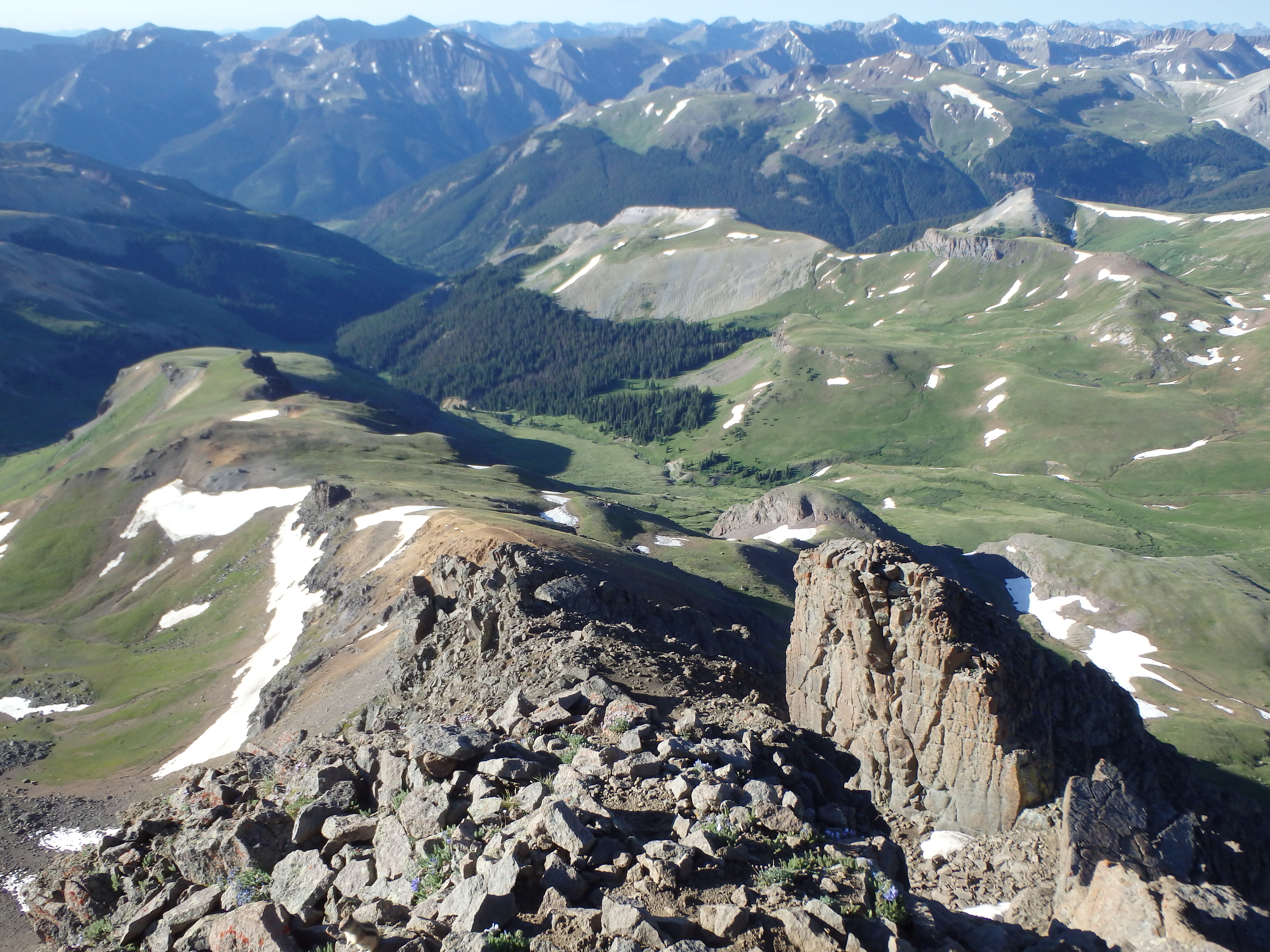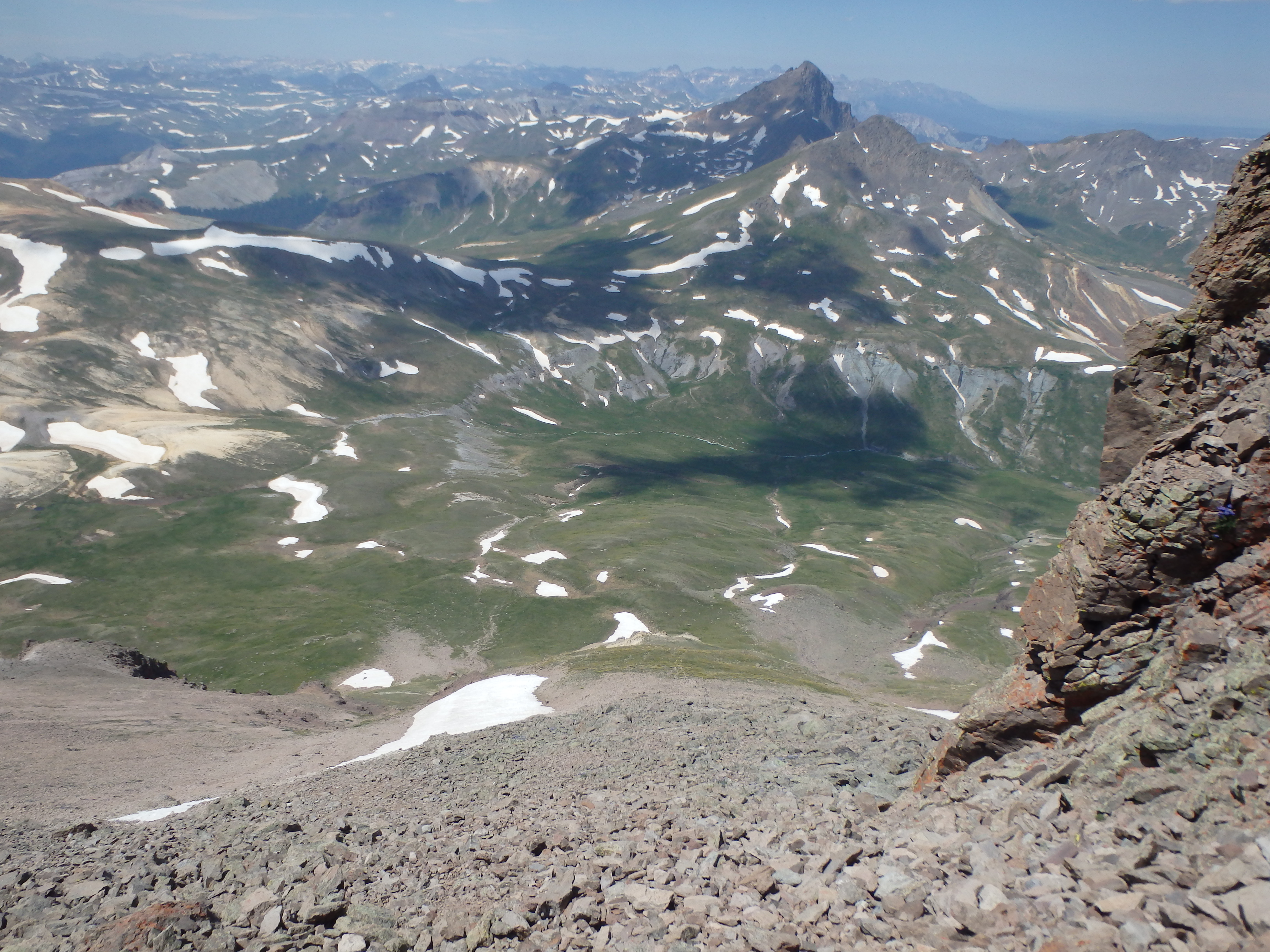From there, it was a short walk on a well defined trail to the broad summit. It had taken 3.5 hours from the summit of Wetterhorn, faster than I expected, made possible by climbing the West Face directly. I talked to a few people milling around at the summit, took a few pictures, and admired the dramatic cliffs to the north.