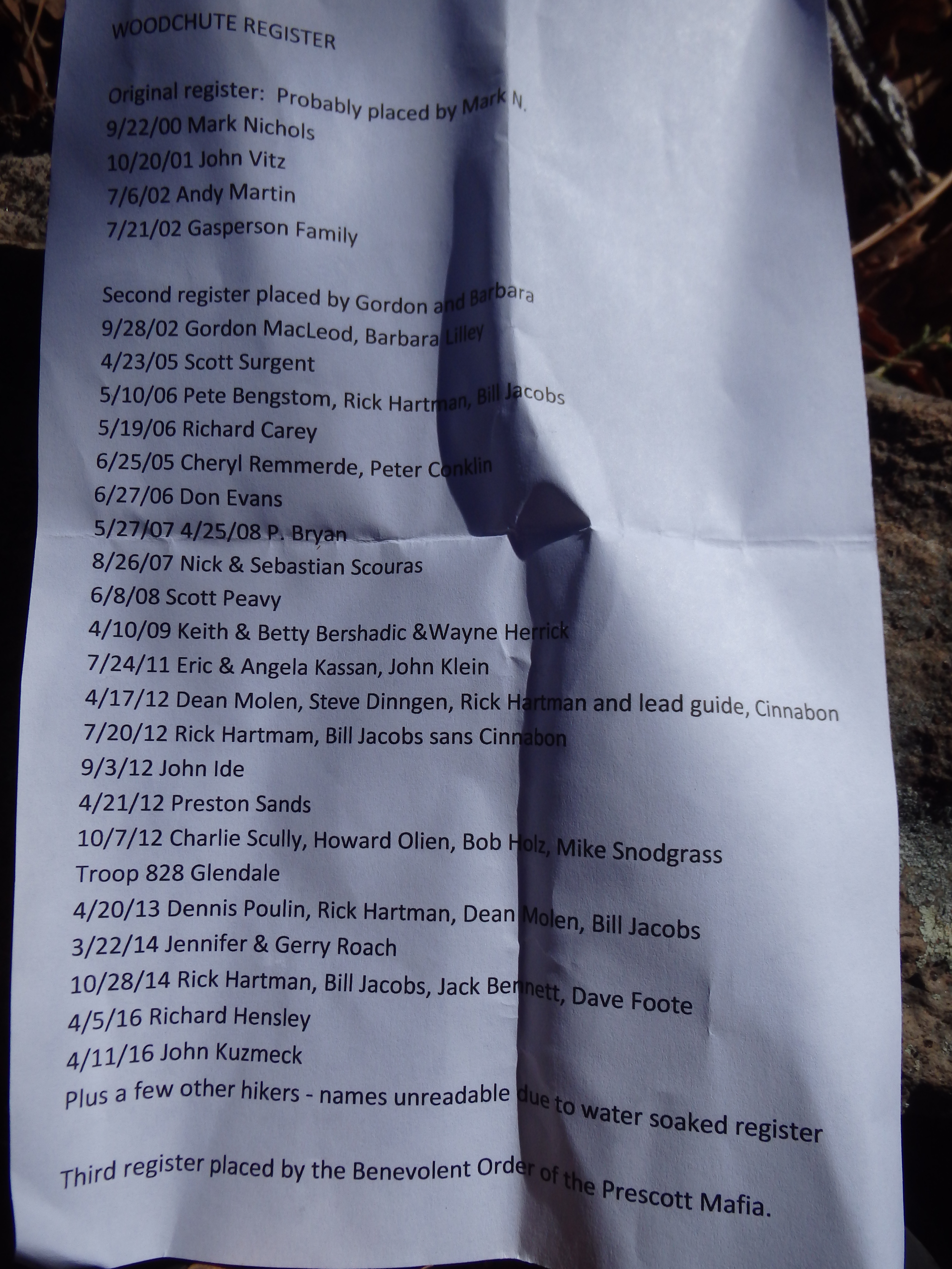 The trail doesn’t actually go to the summit, but continues north along the mountain side. So with the help of GPS, I left the trail and followed the vague rim of the summit plateau another 15 minutes to what was shown as the high point on my GPS. The summit is forested and a bit disorienting, and I had a difficult time sorting out the highest scrap of land, even with the GPS. After walking in circles on the summit, I finally found the register and benchmark, located about 50′ from each other. The summit register had been recently replaced, and someone (quite thoughtfully) typed up the previous summit registers into a word document, as the older ones had become water damaged.